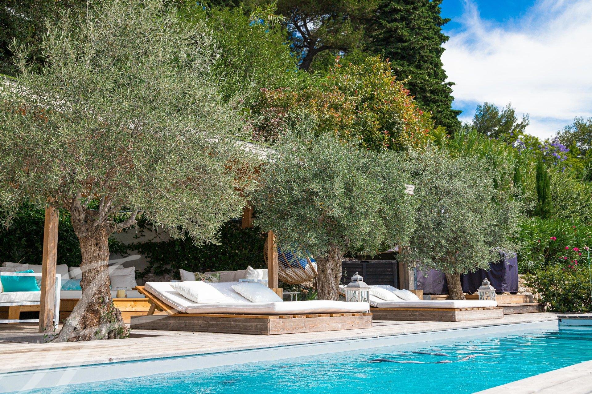 Enjoying a timeless living environment, this villa features spacious terraces including a beautiful pool area with pool house and summer lounge, an elevated terrace with a magical sea view, an outdoor dining area with the charm of Provence overlooking the sea.