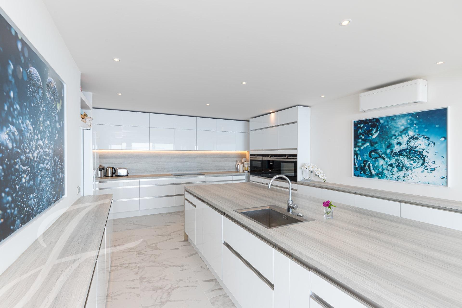 On the lower level, there are three beautiful sea-view bedrooms, each with storage and a work area, a bathroom with bathtub and shower, as well as a shower room with sauna.