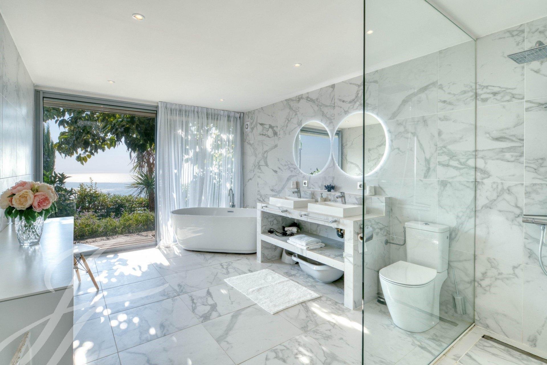 On the upper level, there is a very beautiful Master bedroom en suite with sea view, bathroom and dressing room, an office space opening onto a large terrace with an incredible sea view.