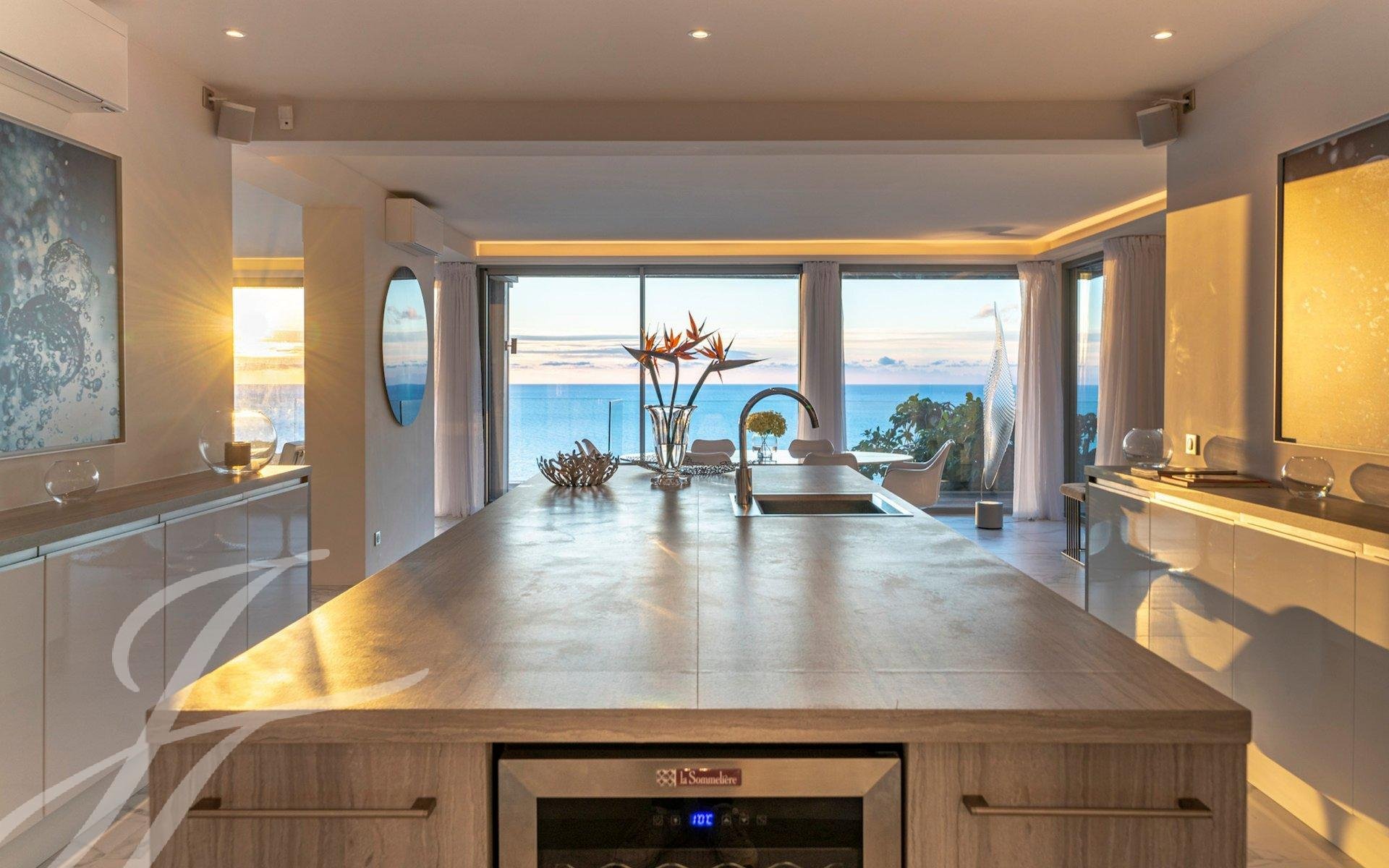 Entrance to a triple living room including a TV lounge with its fireplace (double-sided insert), a second lounge, a dining room, a high-end American kitchen fully equipped, all opening onto a sea view terrace.