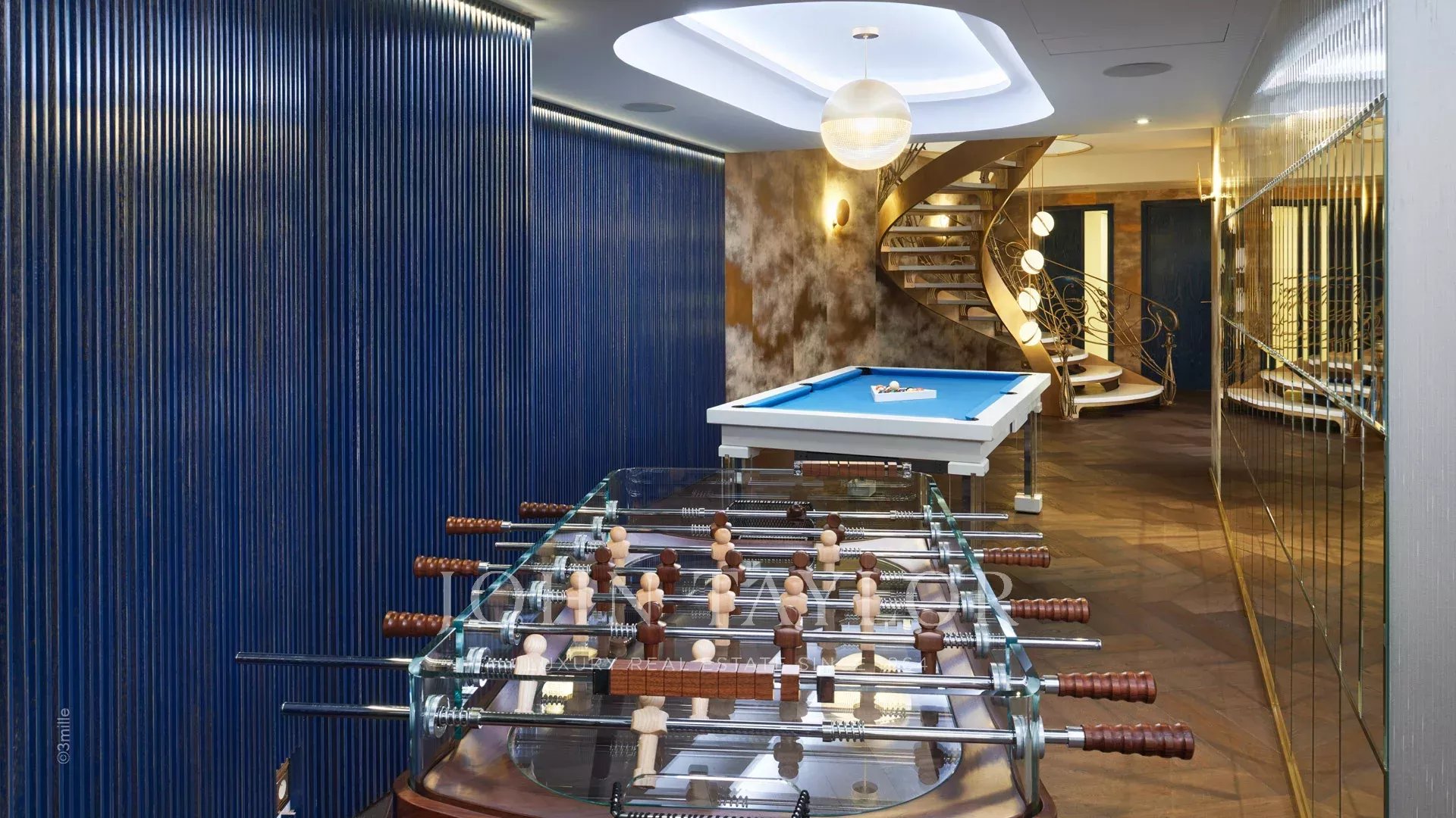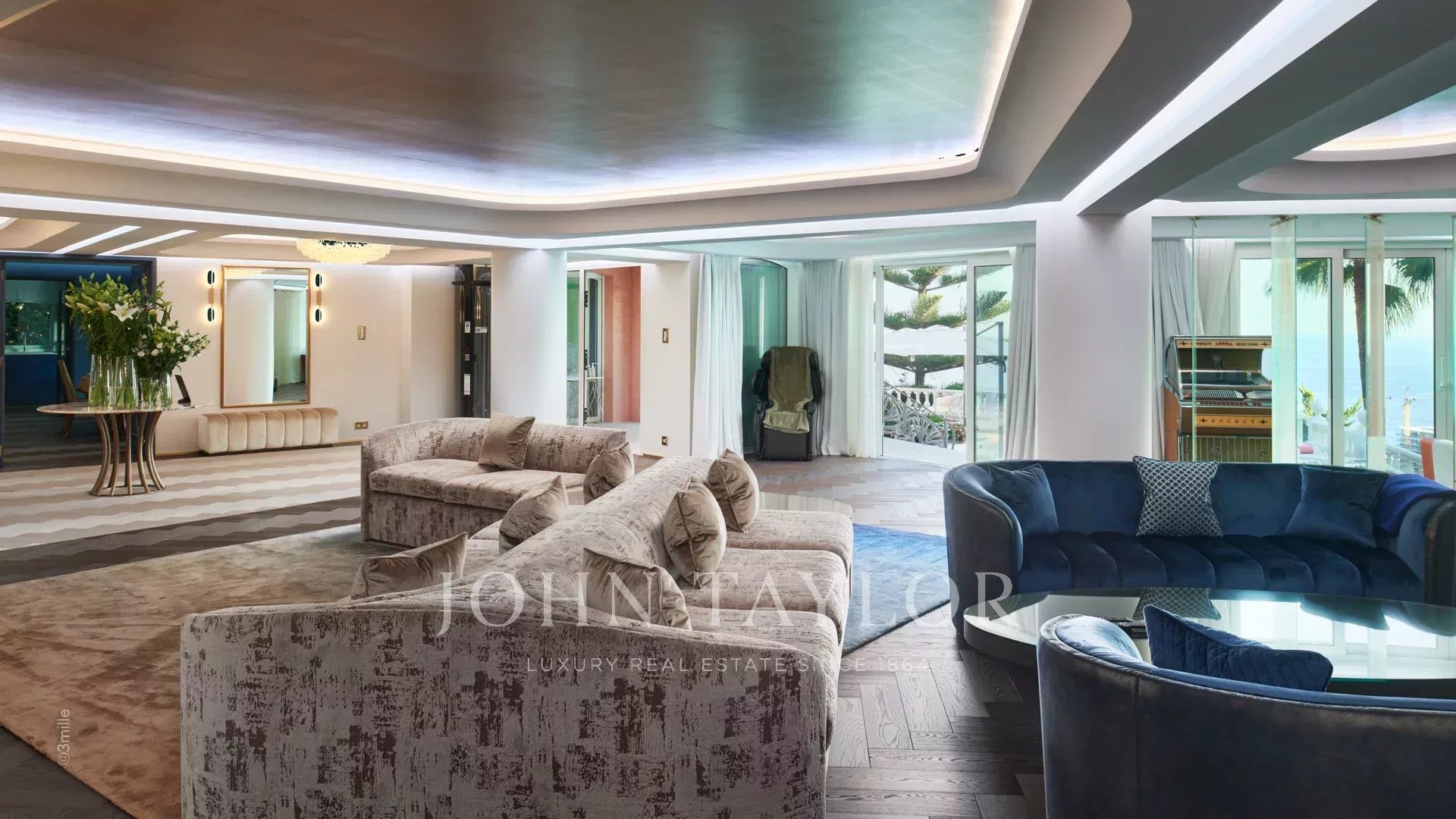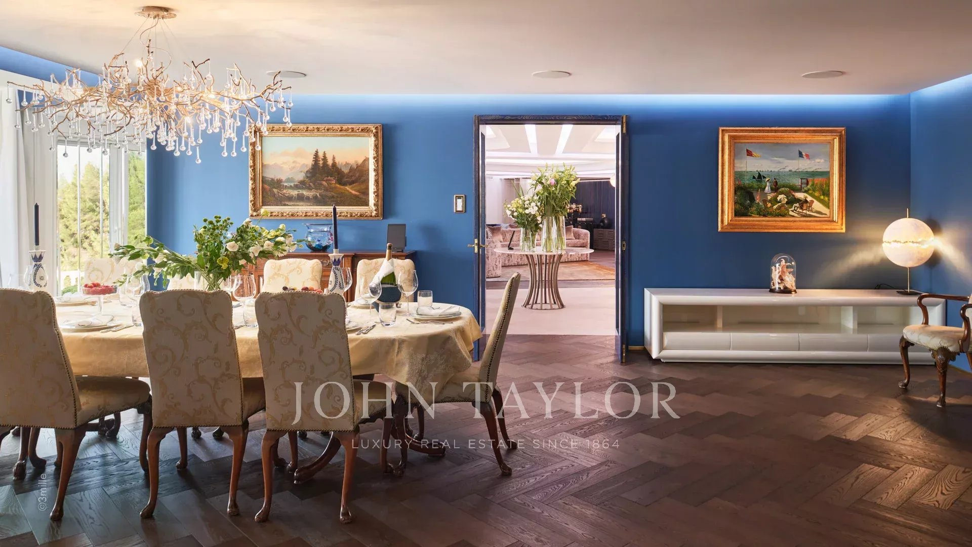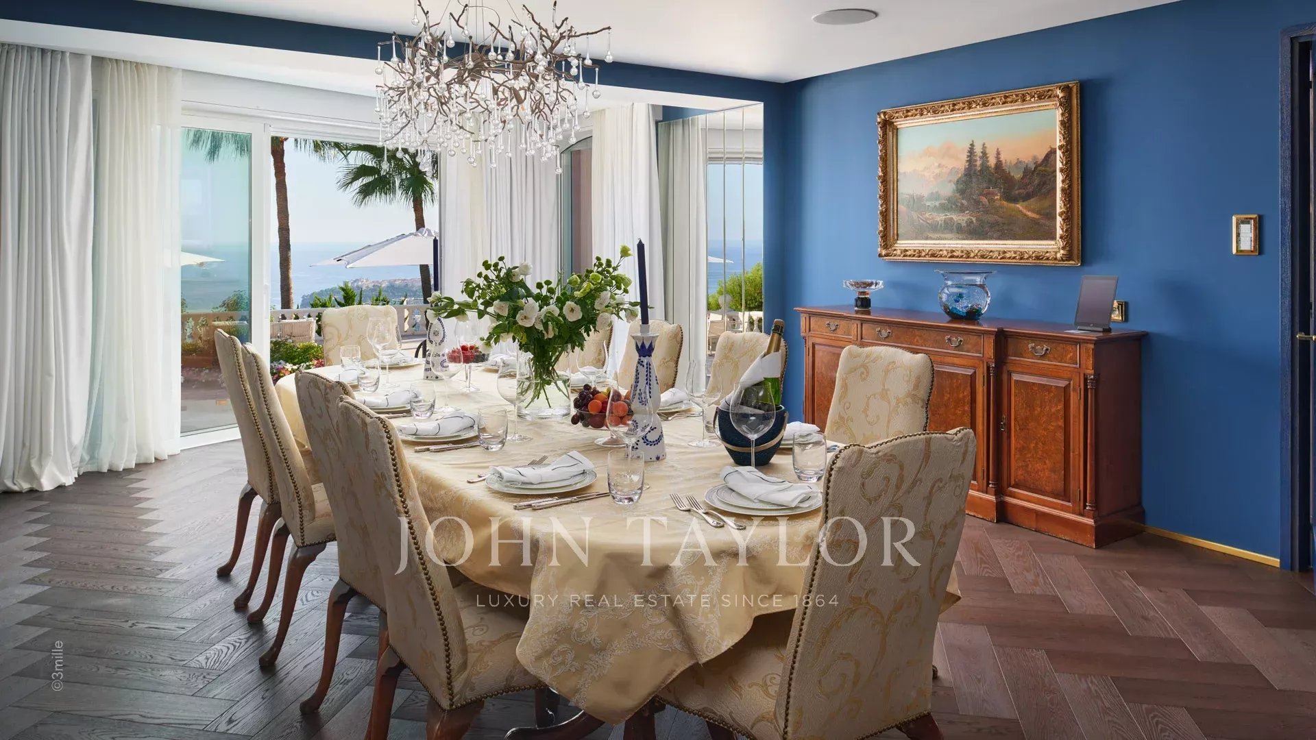 The villa includes a dining room for up to 22 guests, a professional kitchen and a living room.