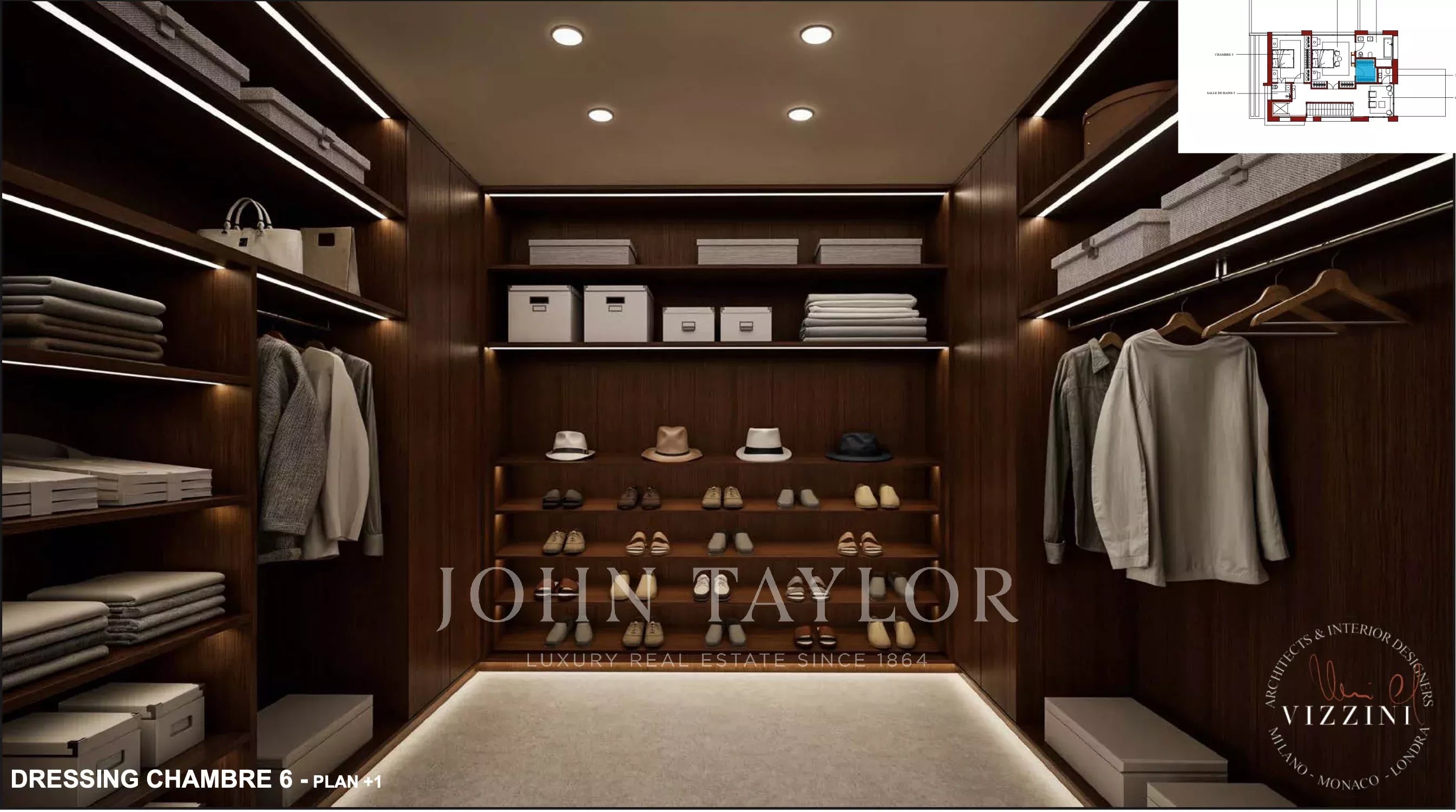 Five luxurious suites, each with en-suite bathroom and custom-made dressing rooms.