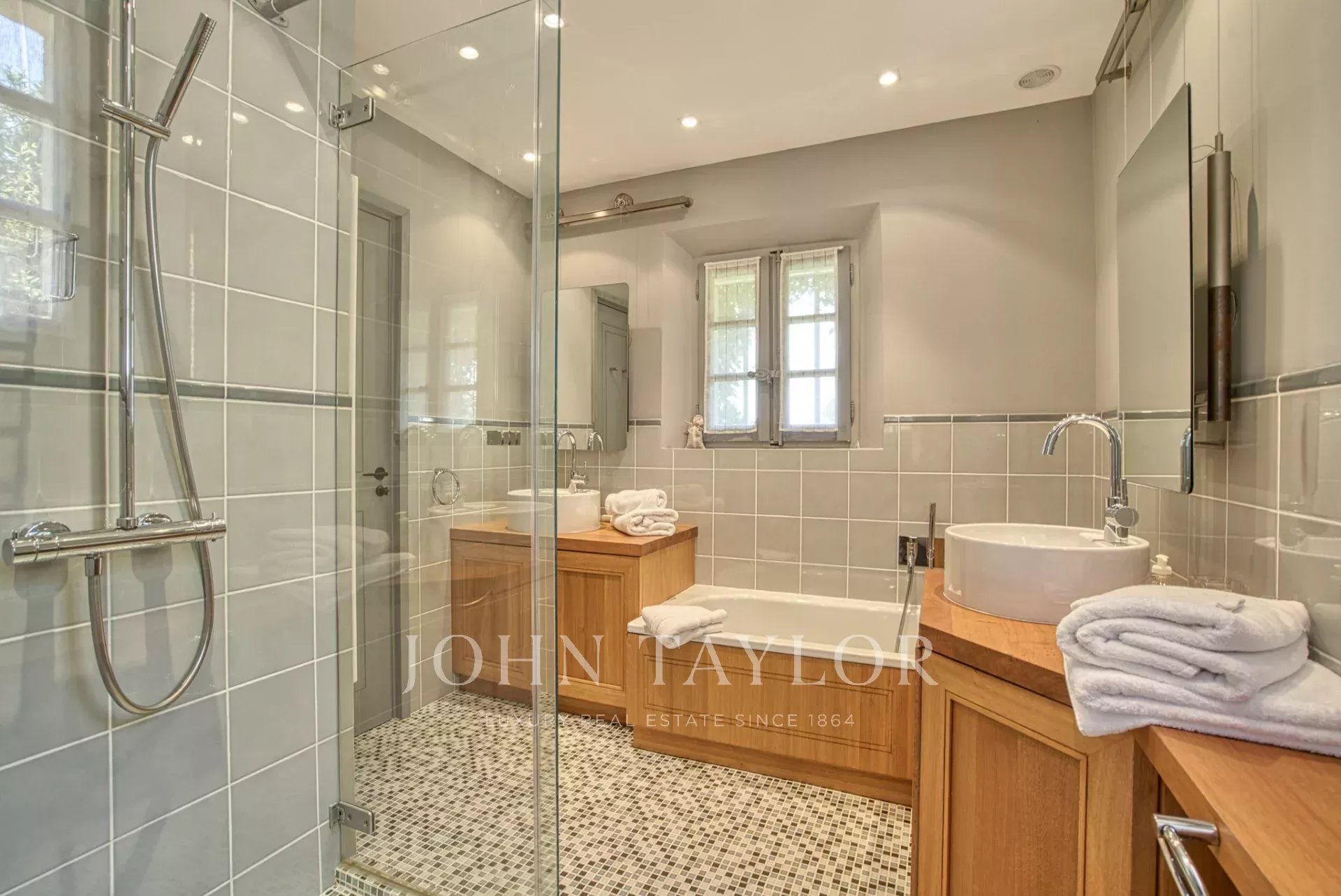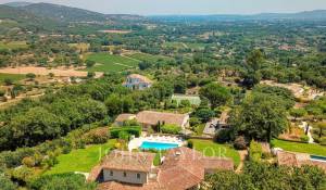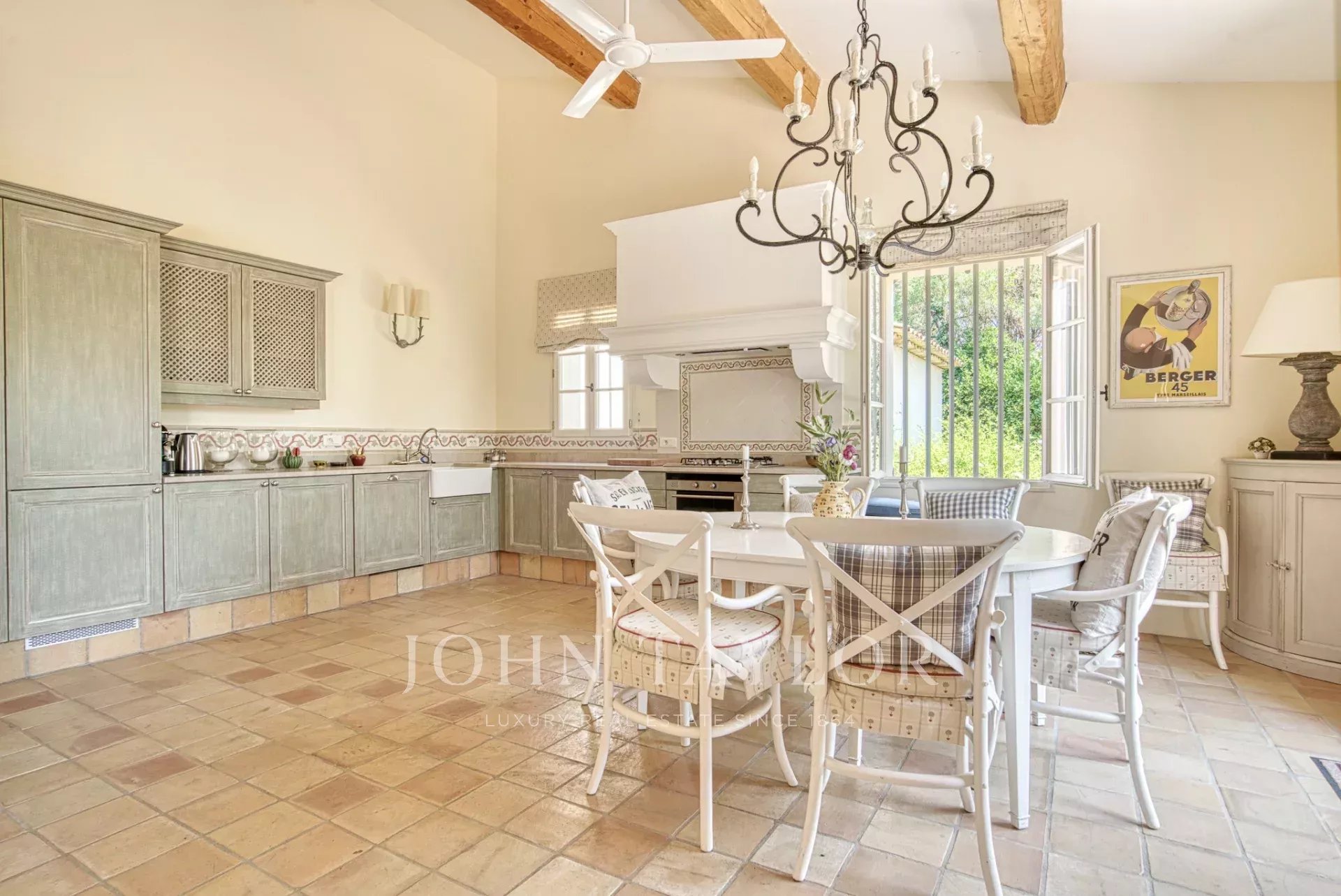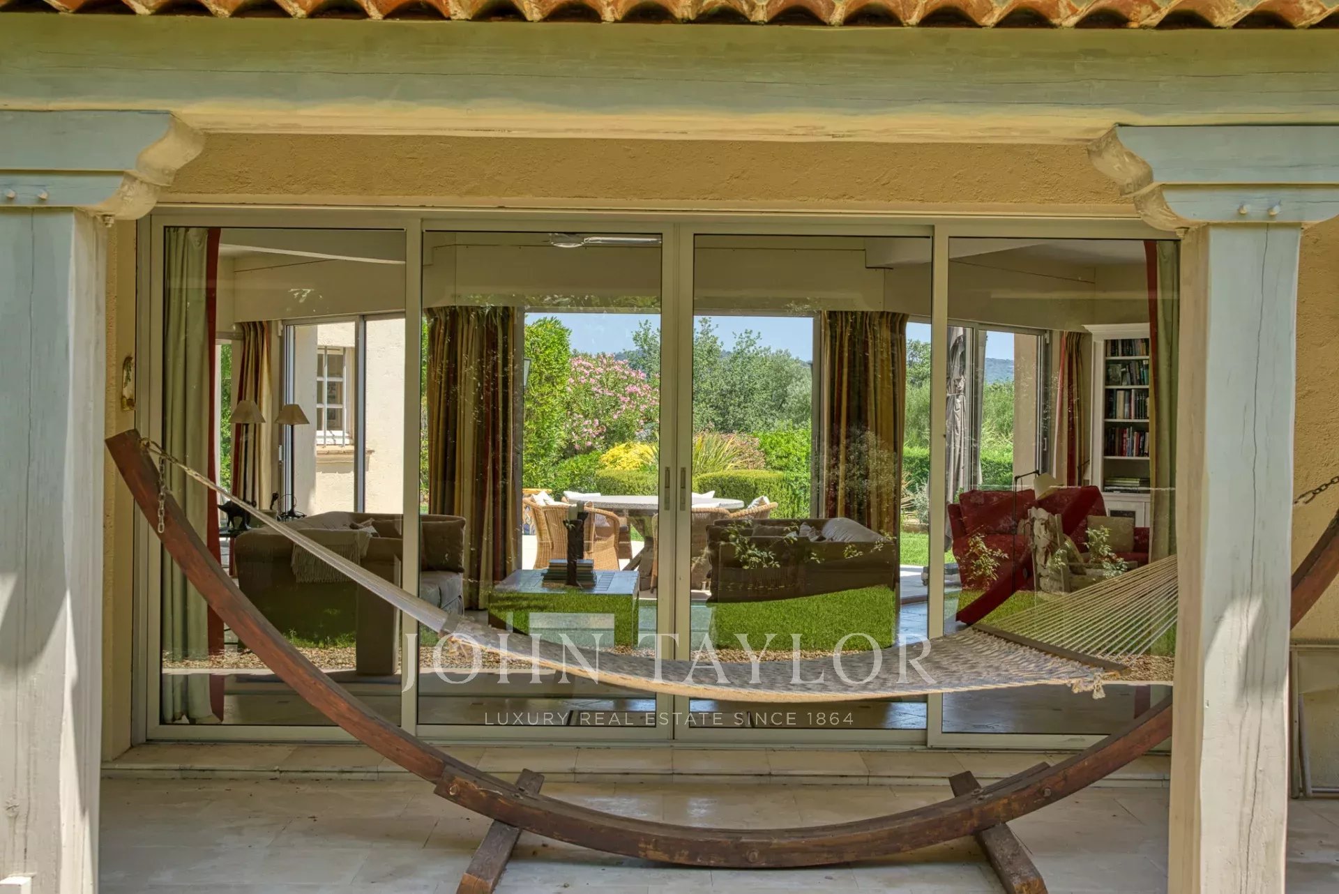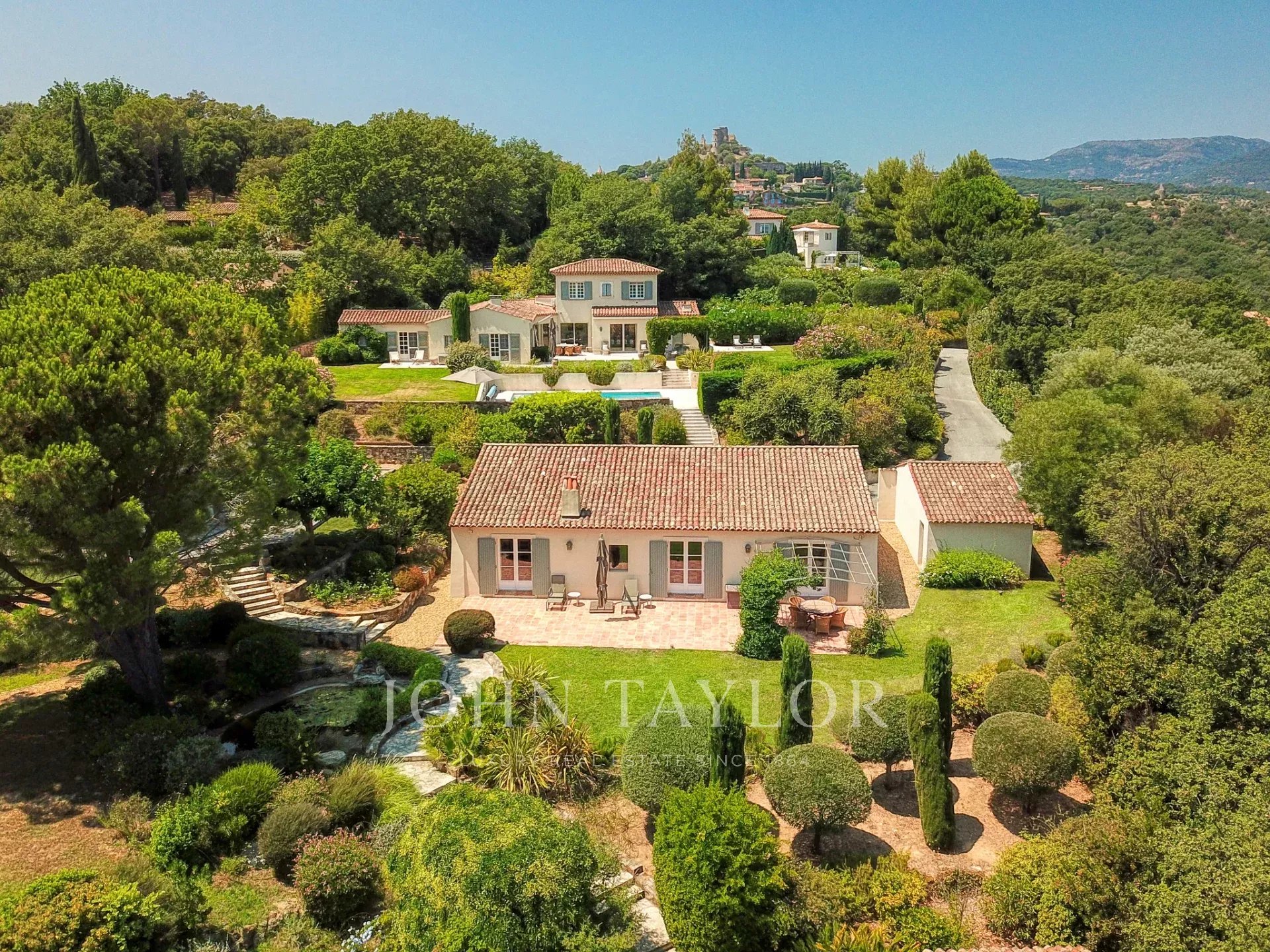 Nestled in a small, secure estate close to the center of the village of Grimaud, this property comprises a main villa and a guest villa, complemented by a tennis court, a pétanque court, a heated swimming pool, a garage and above all a beautiful outdoor space serving as summer kitchen and living room.
