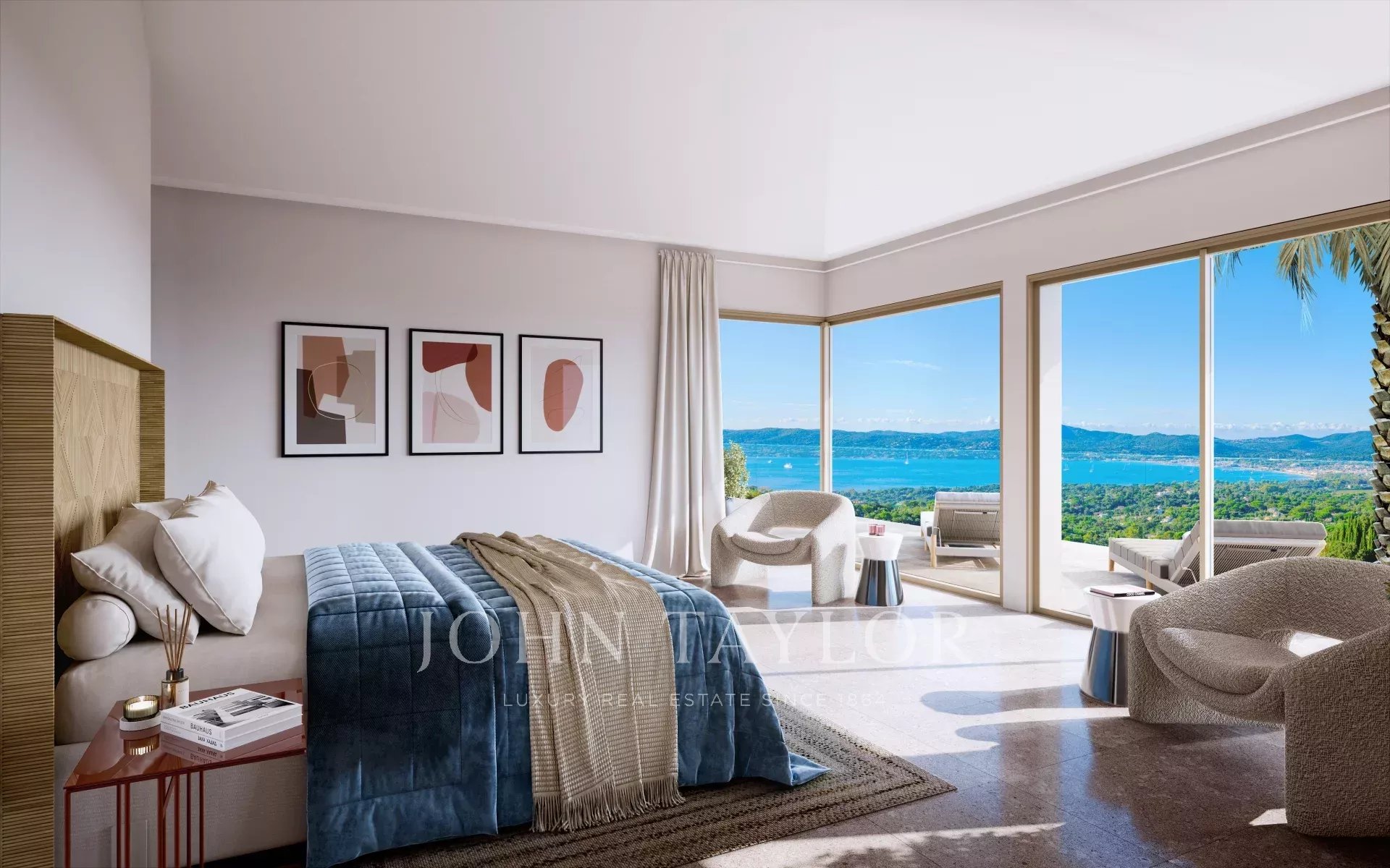 Outside, a landscaped garden surrounds a beautiful swimming pool, facing a unique panorama between the sea and the Maures hills. A laundry room, wine cellar and closed garage complete this rare property.