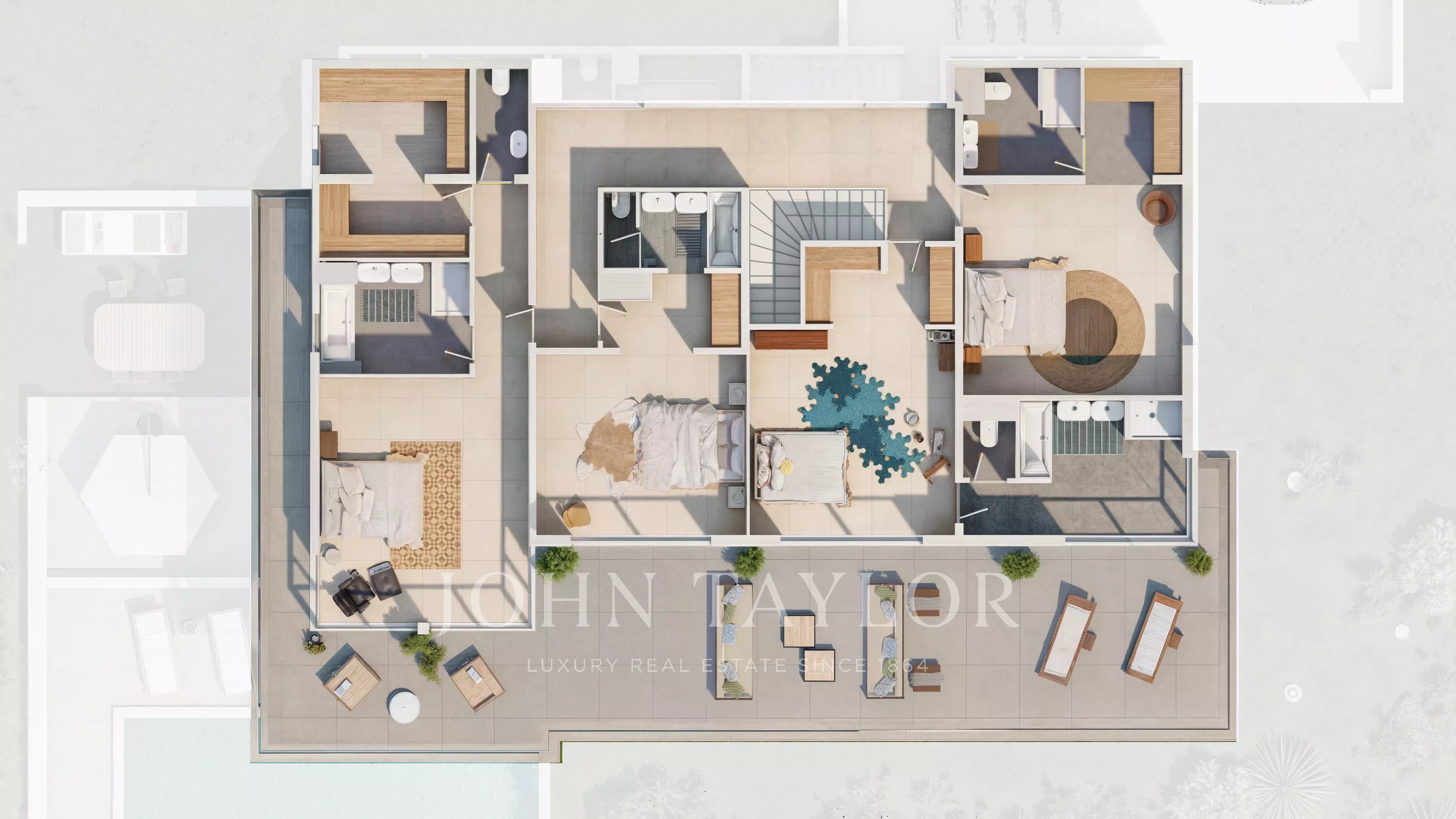It features a spacious, light-filled living room with open kitchen, five elegant bedrooms, each with en suite bathroom.