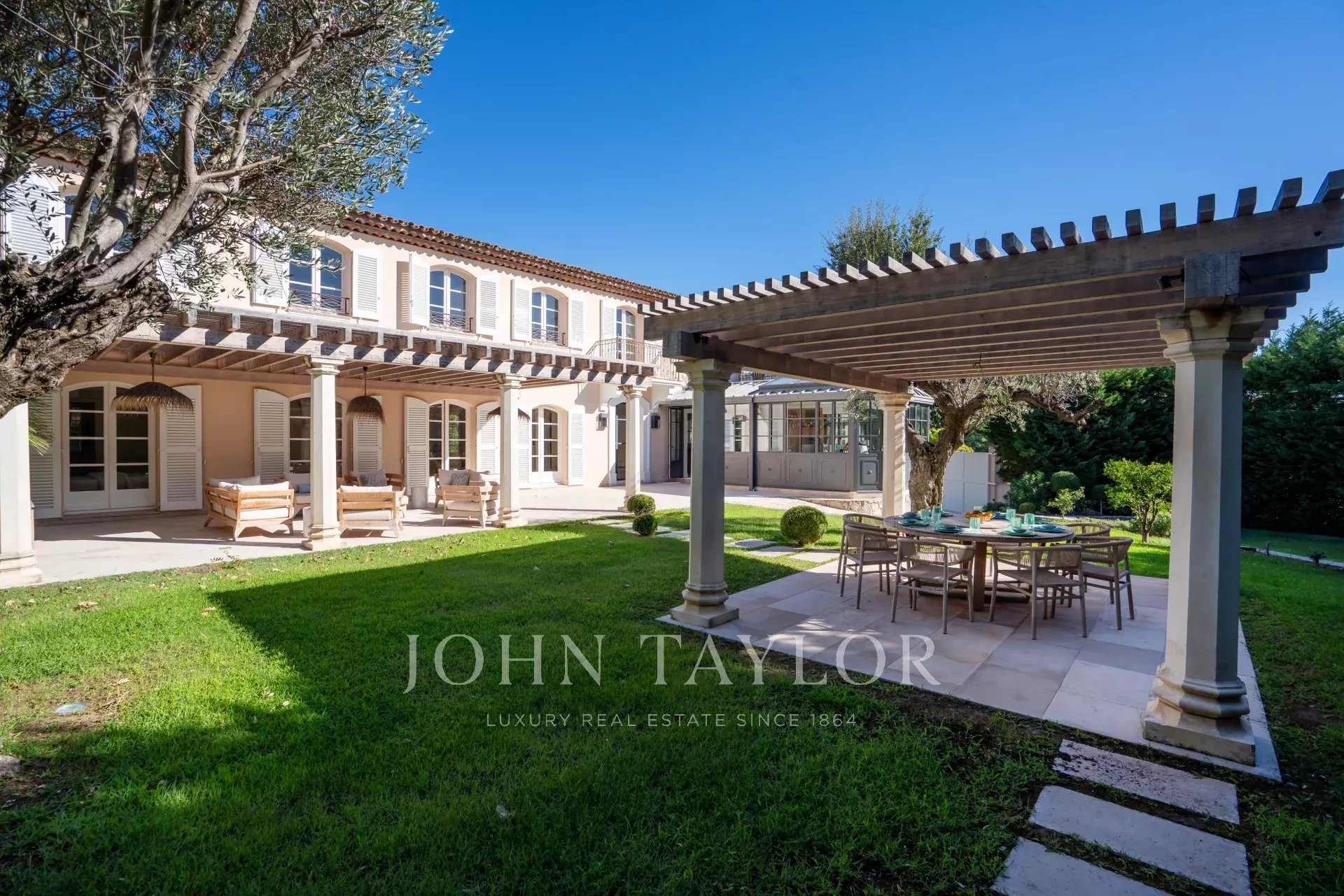 Outside, the property extends over 2,100 m² of beautifully landscaped grounds, with shaded terraces, a summer kitchen and a large swimming pool inviting you to relax.