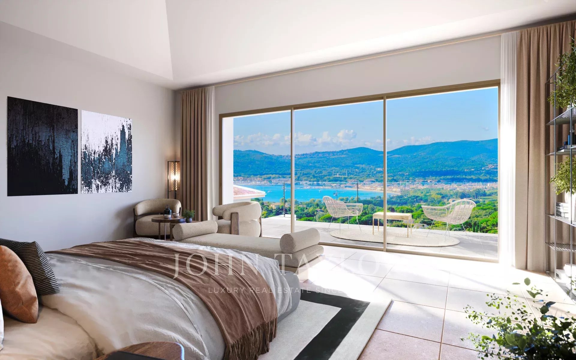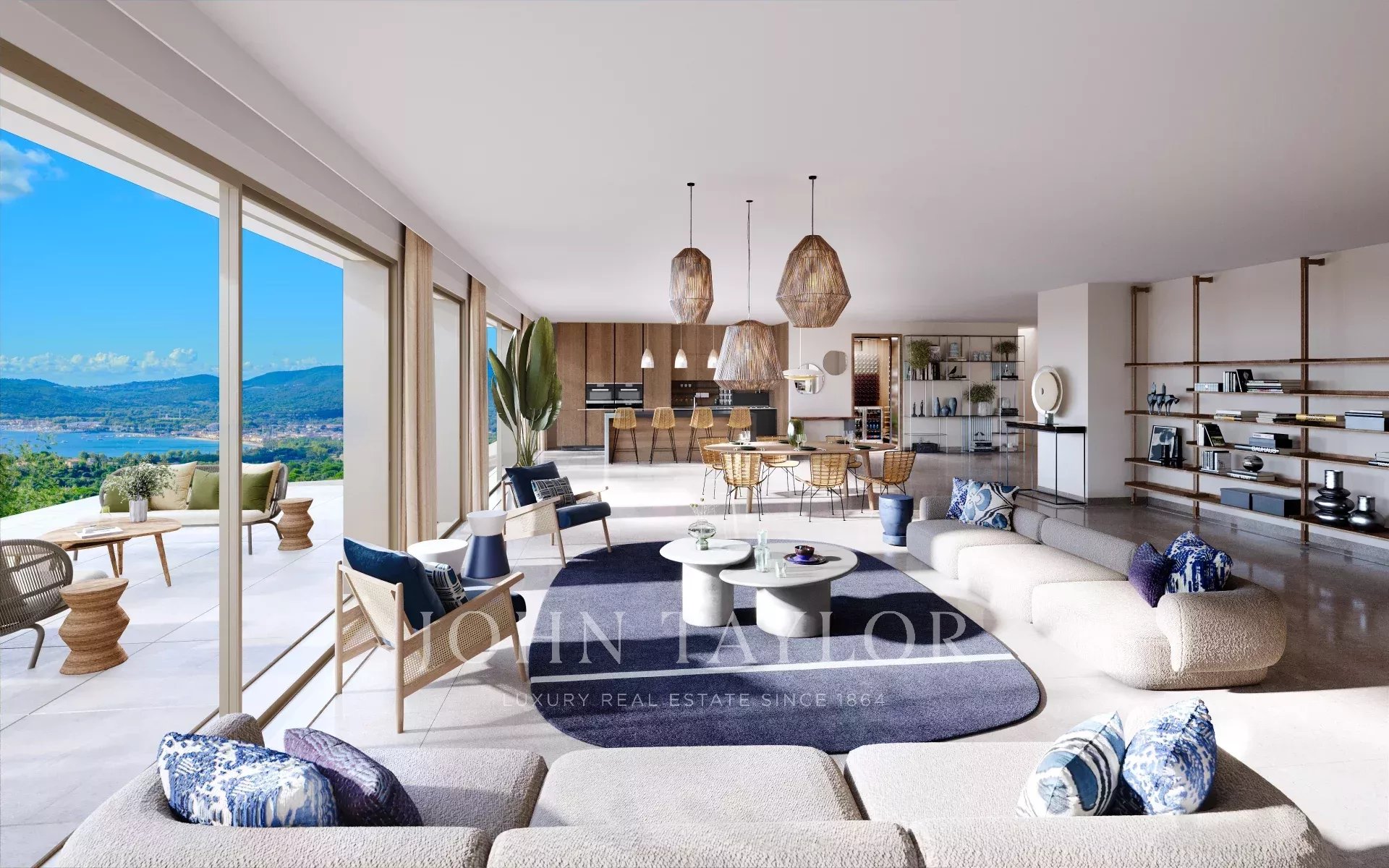 It features a vast, luminous living space of over 130 m² with open kitchen, designed to make the most of the unobstructed view. The property features six en-suite bedrooms, each with its own private bathroom, including a master bedroom with dressing room and private terrace offering sea views.
