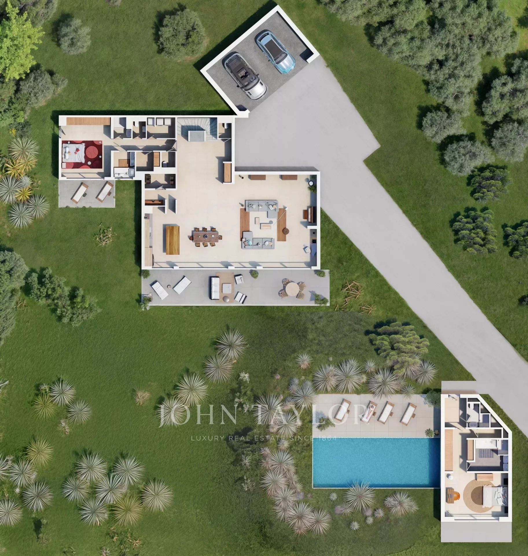Set in 5,350 m² of landscaped grounds, the villa opens onto a superb swimming pool, an extension of the living room terrace, and a summer kitchen ideal for relaxing and socializing.