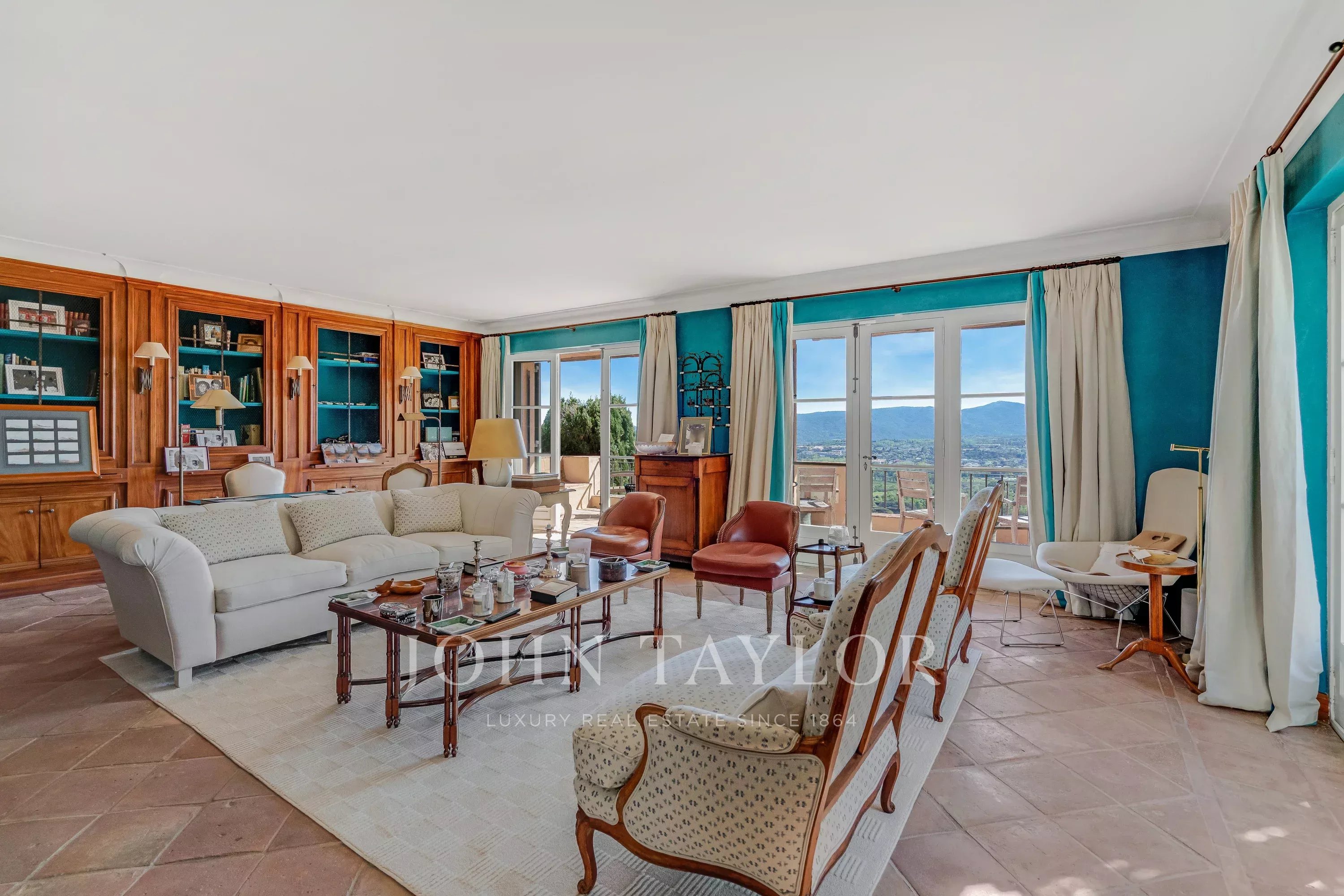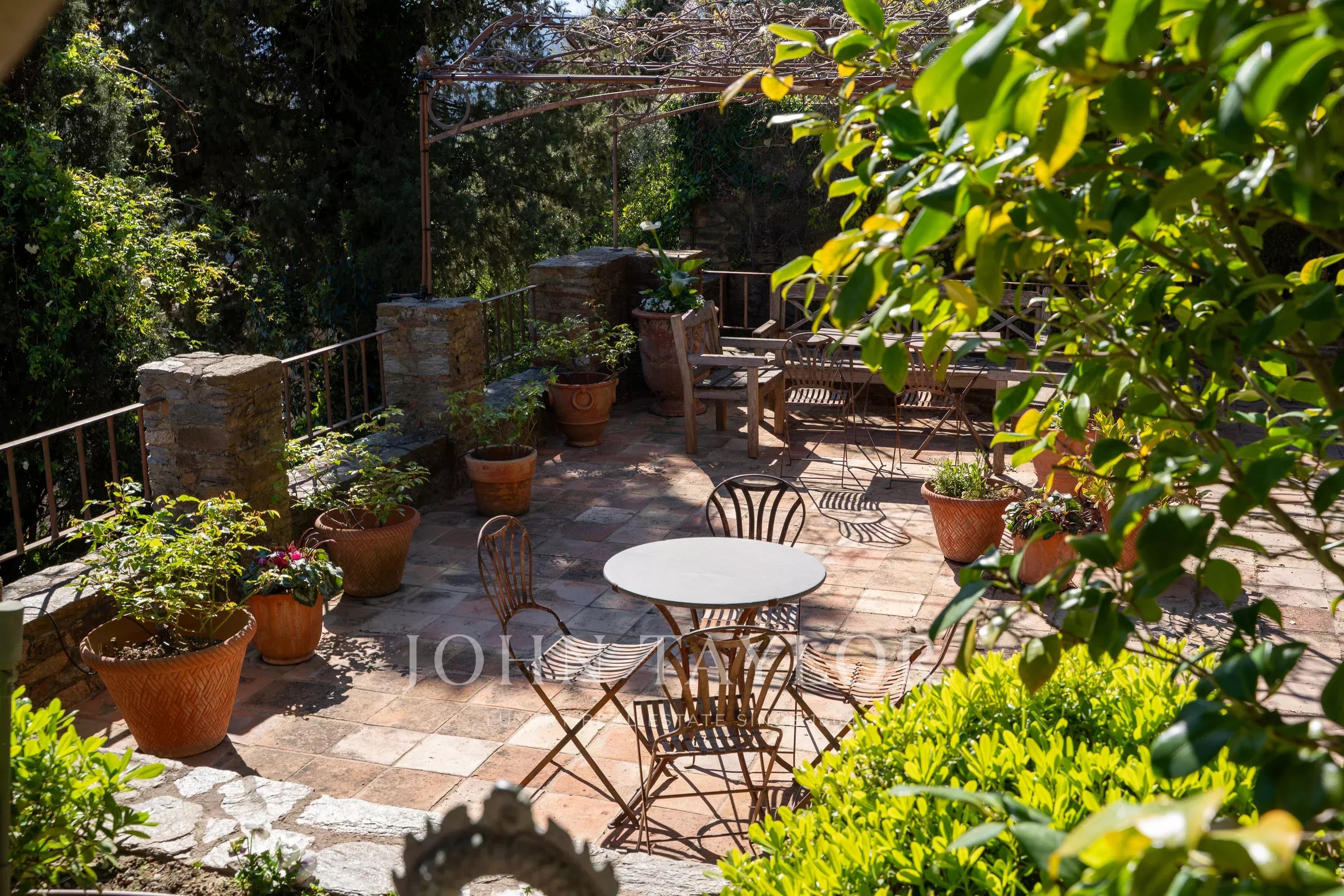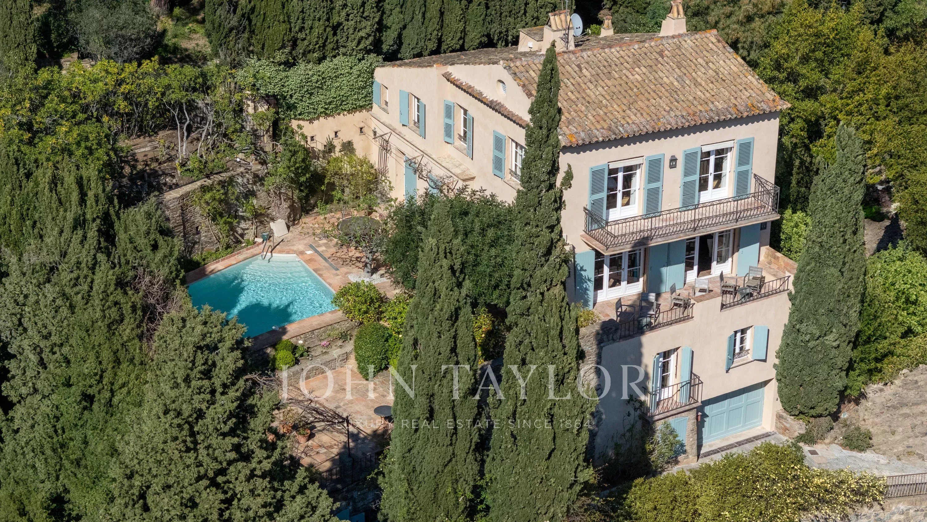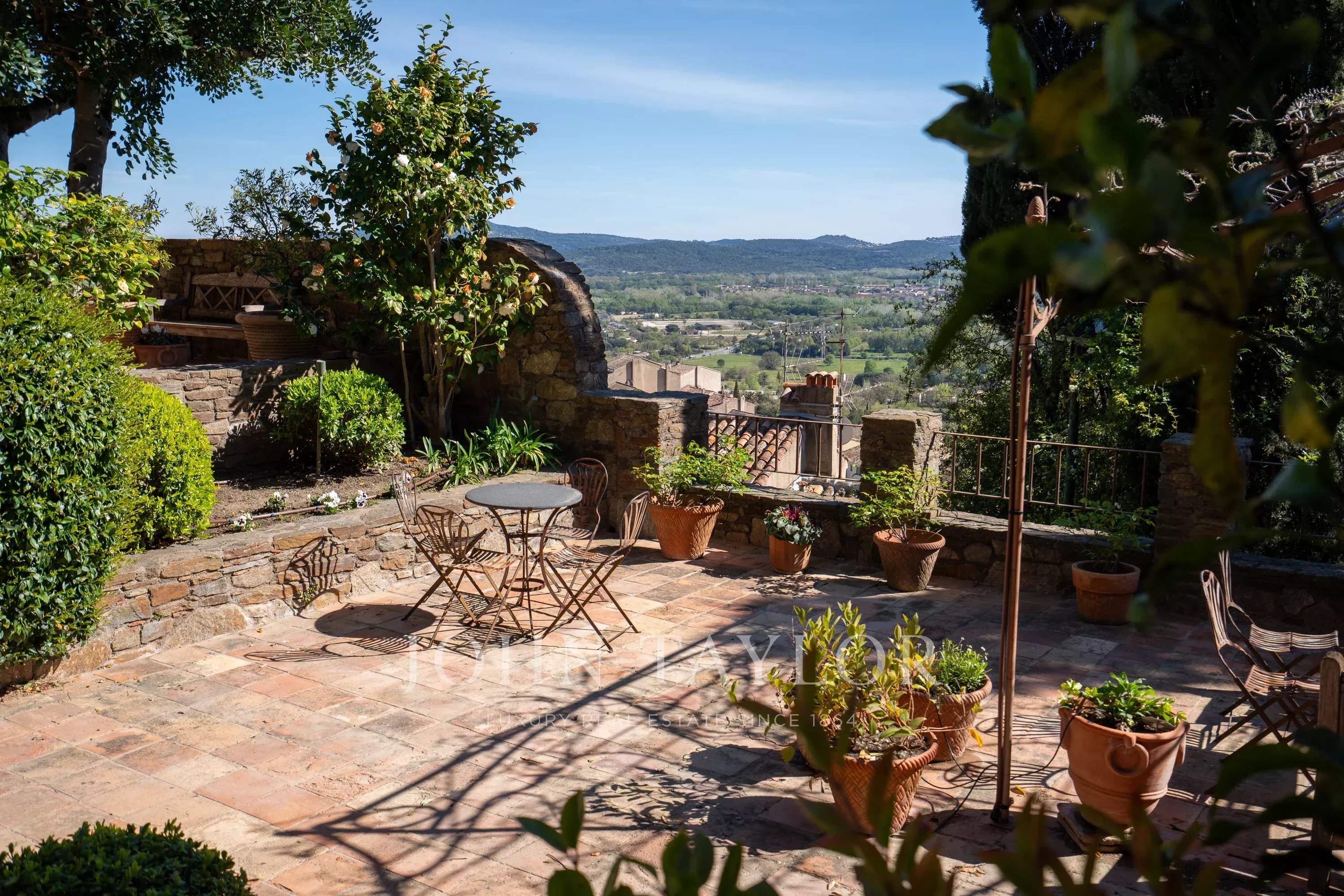 Outside, a newly heated pool fits harmoniously into a preserved environment, extended by large shaded terraces overlooking the Maures hills.