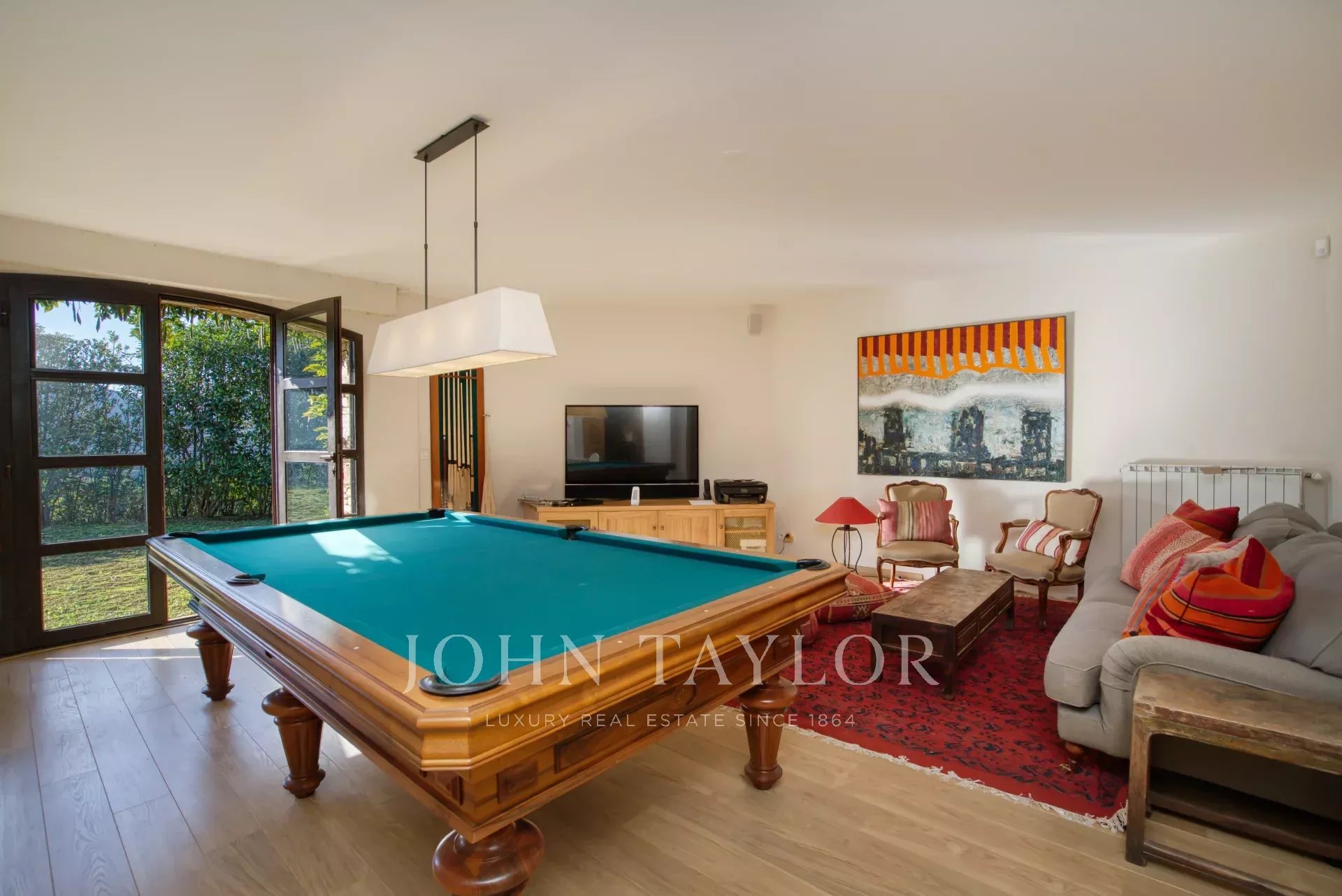 It features two living rooms with fireplaces, a bright dining room extended by a covered terrace and a vast sun terrace. The modern, fully-equipped kitchen is accompanied by a functional utility room.