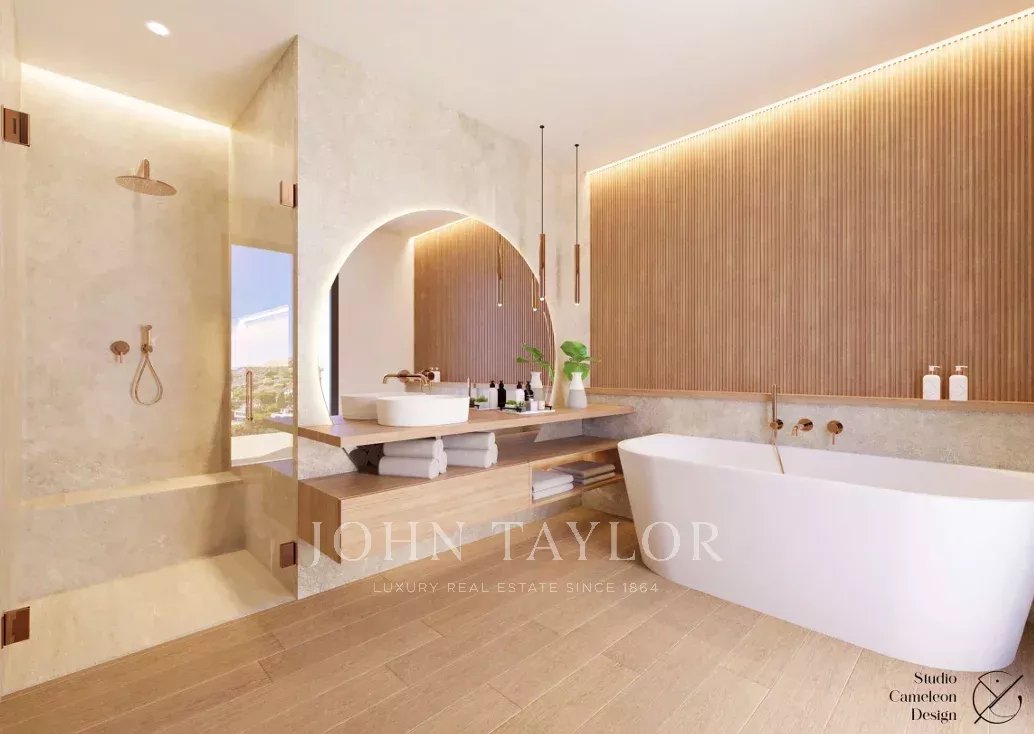 The villa, built on three levels, offers large living areas, three en-suite bedrooms, as well as planned amenities such as an indoor swimming pool, a wellness area with spa and a gym.