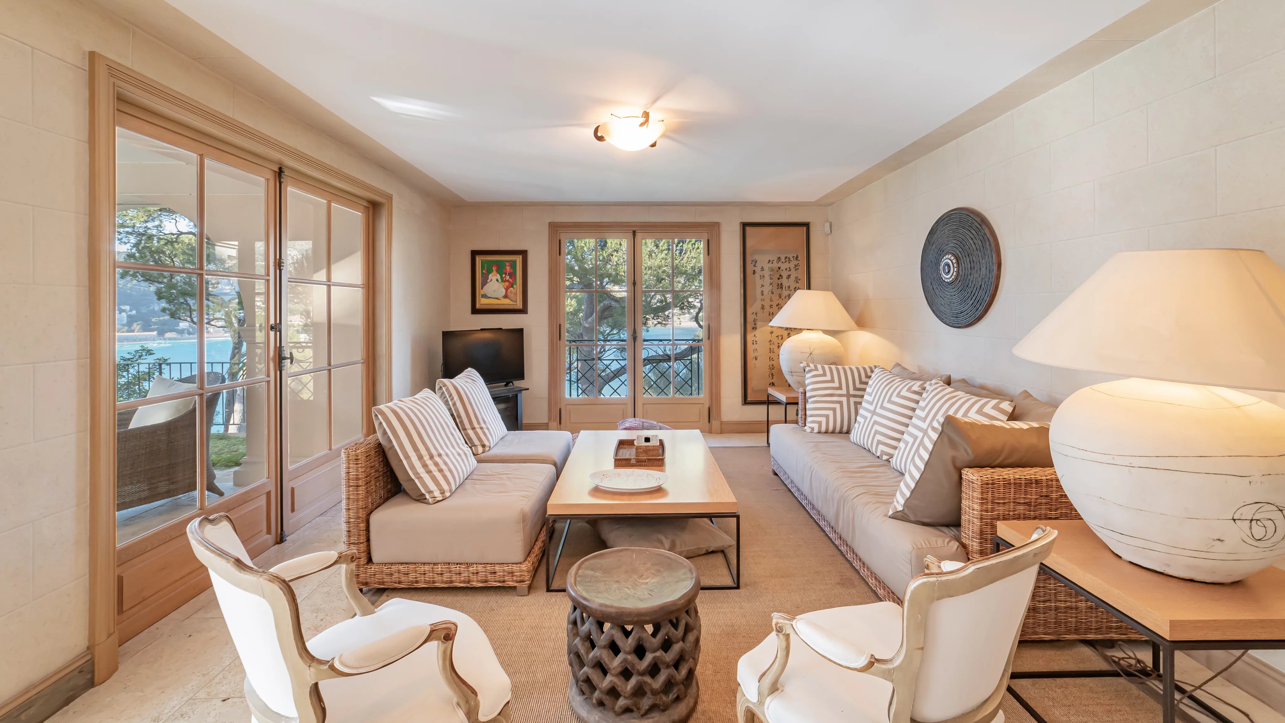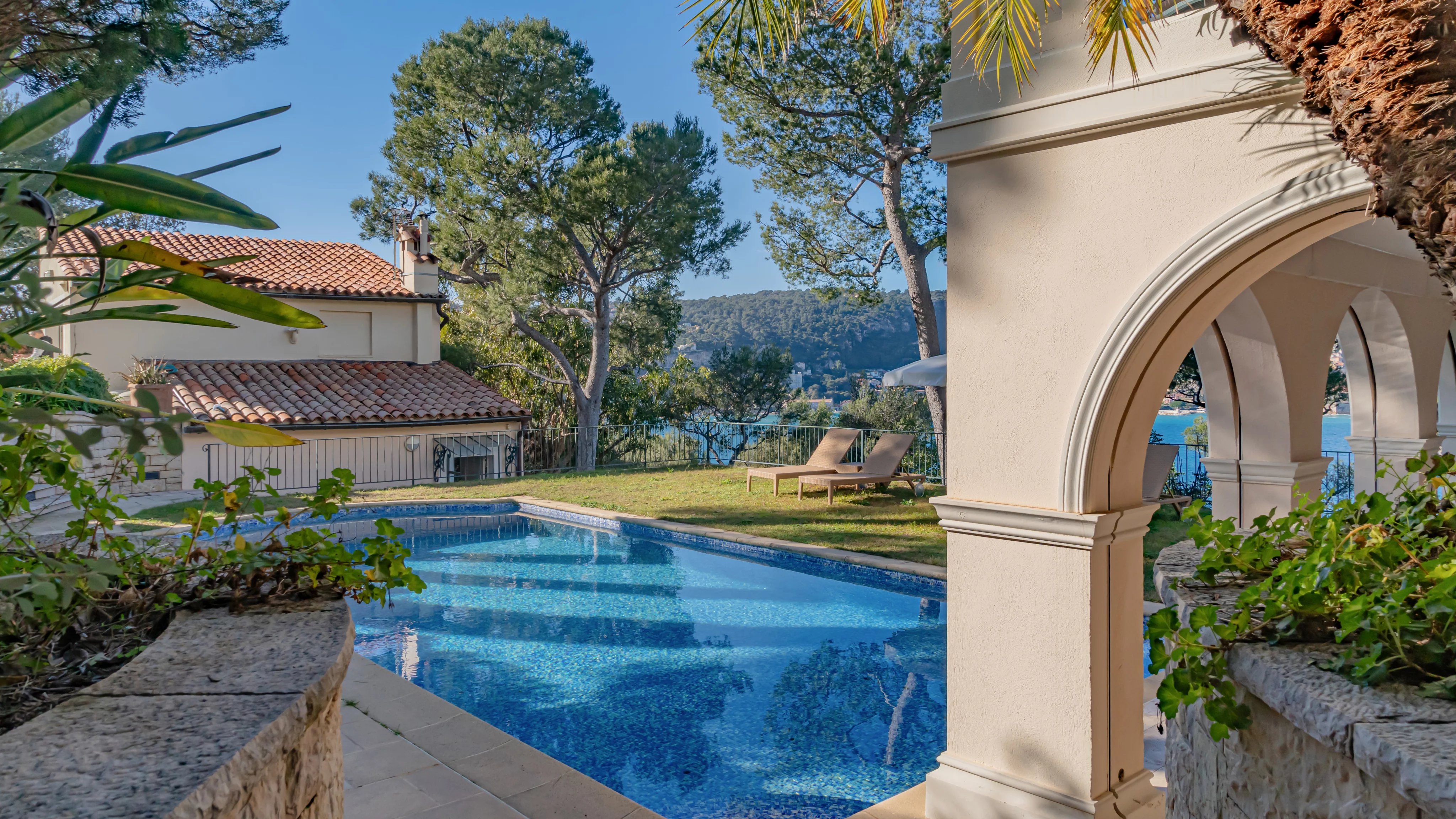 Situated on the west side of Cap Ferrat, in a privileged environment, this charming property overlooks the bay of Villefranche and offers a privileged view of the sea and mountains. Set in over 2,000 m2 of Mediterranean-style grounds, the property comprises a main villa and a guest house separated by a flat plot of land and a pleasant swimming pool.