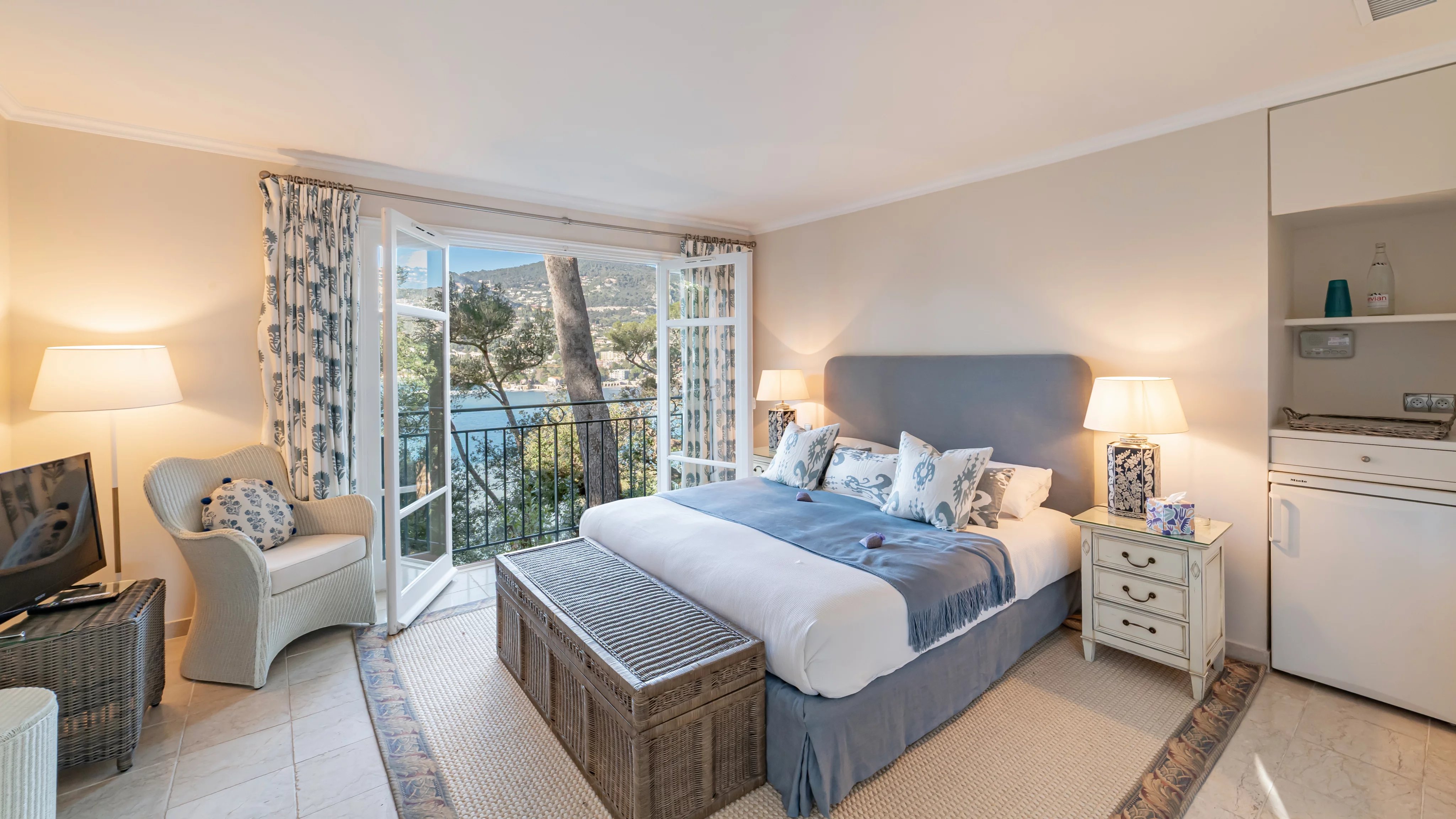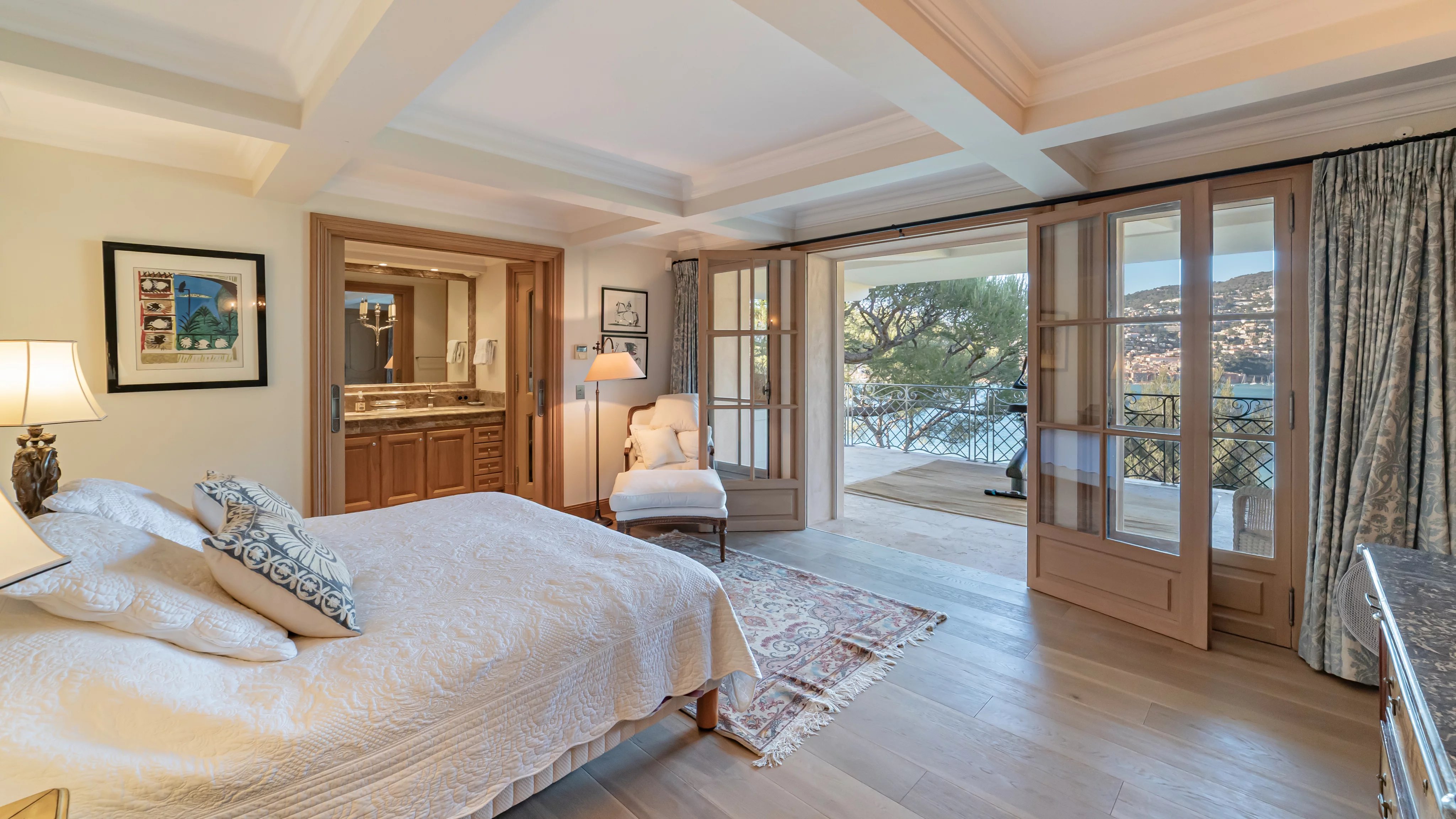 Organized on two levels, the villa's entrance leads to a double living room with terrace overlooking Villefranche's old town. This floor is completed by a formal dining room, a large kitchen and an en suite bedroom.