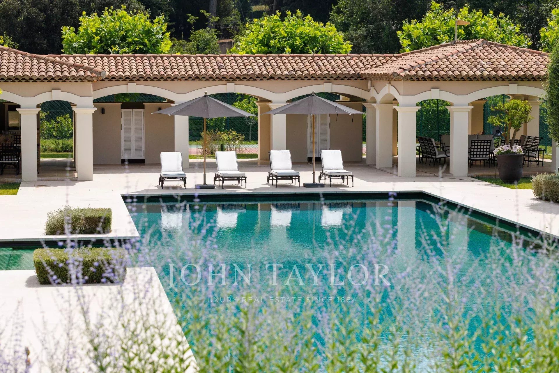 The villa's pleasant exteriors feature both covered and uncovered terraces. The outdoor pool area boasts a huge pool-house with summer kitchen, changing rooms and covered terrace. The pool measures 25m x 8m and is at the same height as the pool house. Easy access to the tennis court.