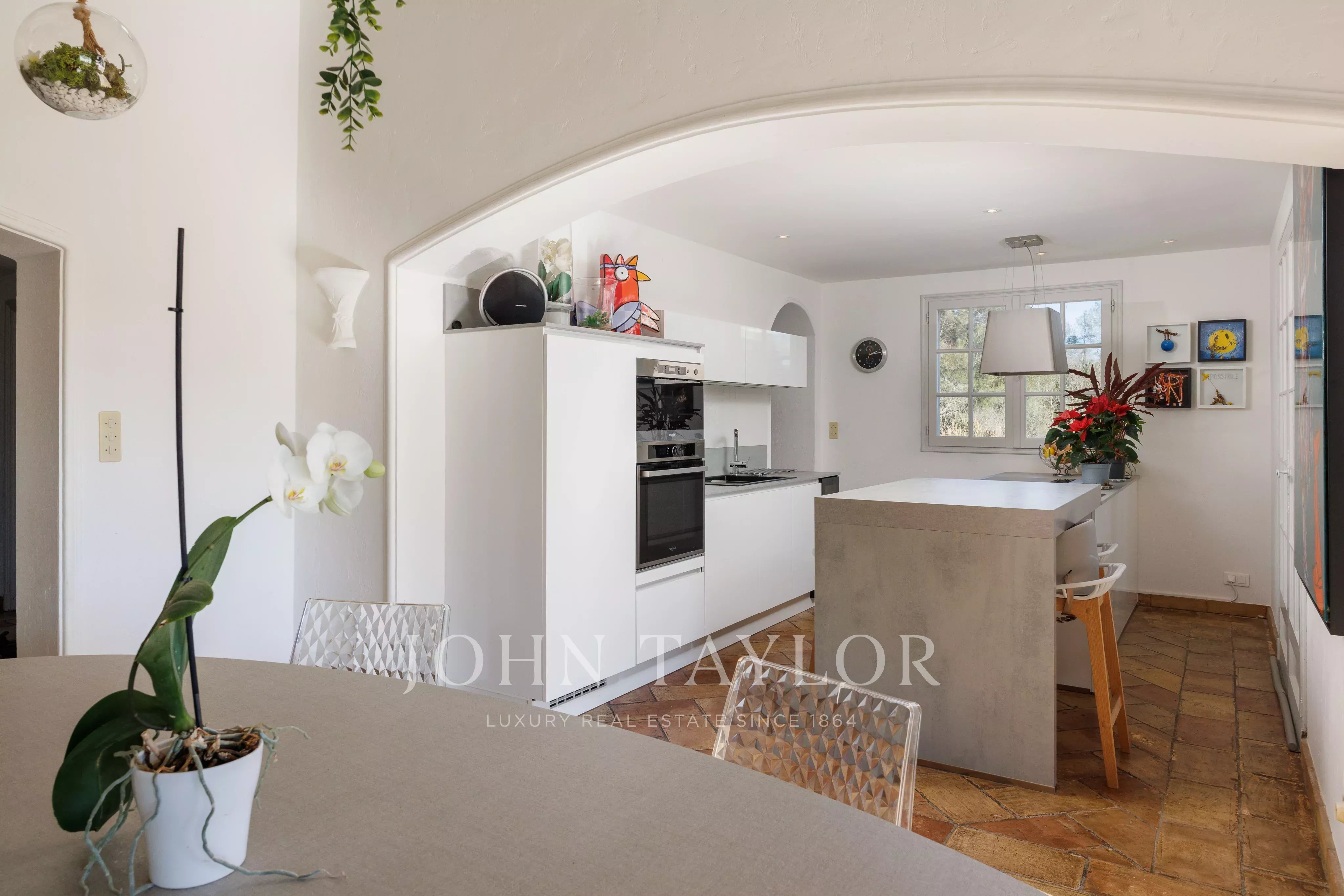 This space benefits from a large private garden, in front of the living room, equipped with a beautiful summer kitchen with a covered terrace as well as an irregularly shaped infinity pool. Landscaped garden and noble materials!