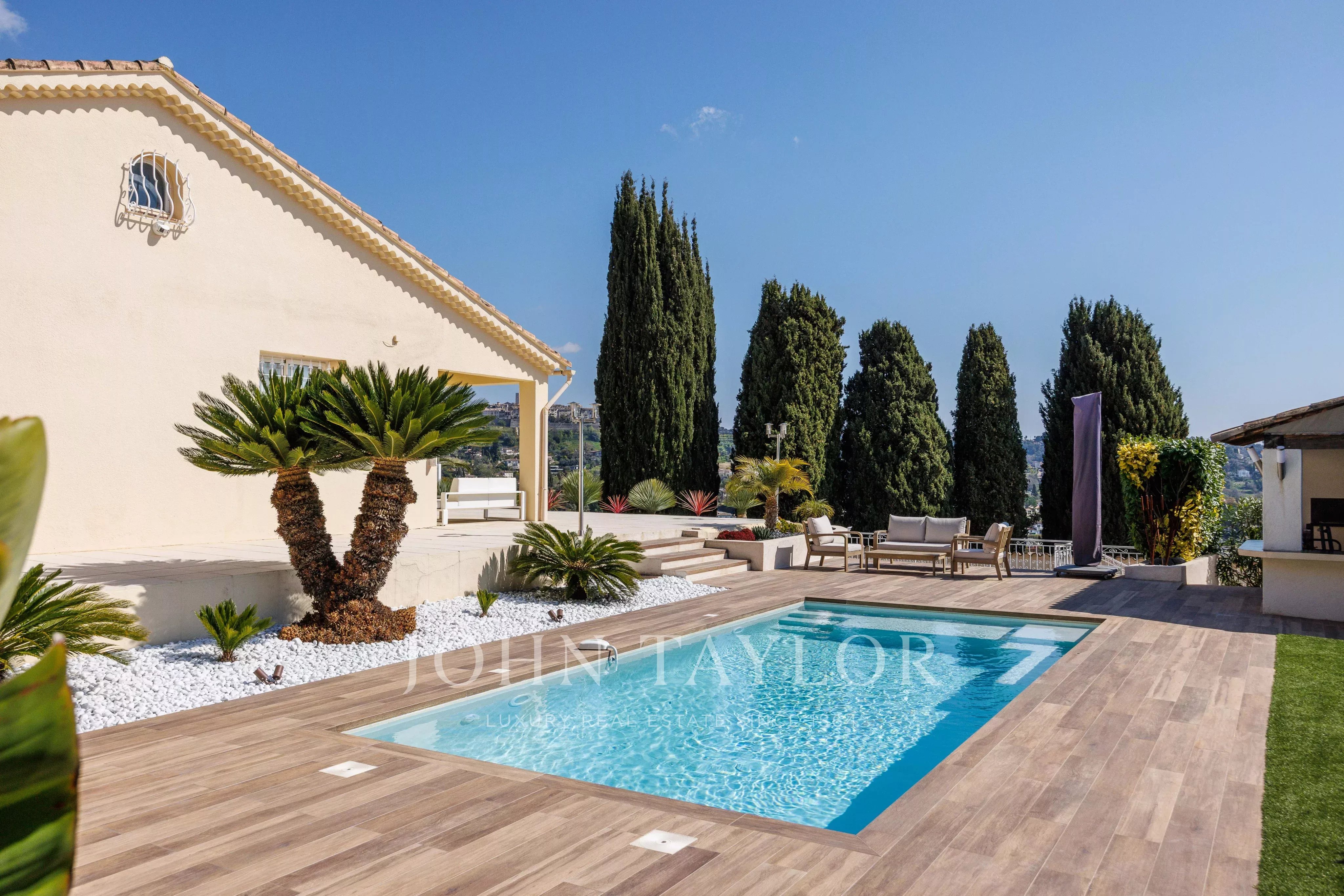 Ideally located within walking distance of La Colle-sur-Loup and benefiting from a magnificent view of the Saint-Paul de Vence village and the surrounding hills, this beautiful approximately 188 m2 single-story villa completely renovated is built on a beautiful easily maintained garden of about 2,200 m2 with a swimming pool, pool house, boule court, and garages for 5 cars.