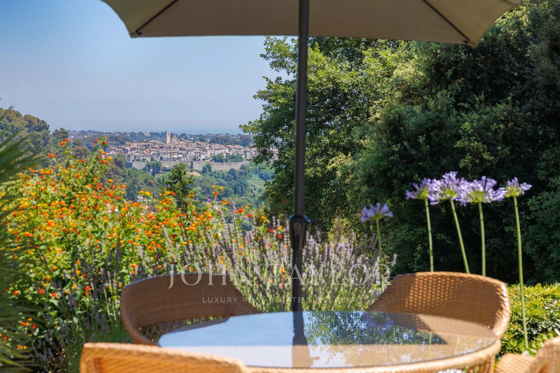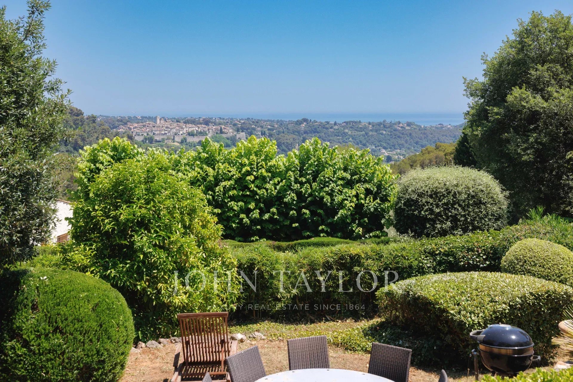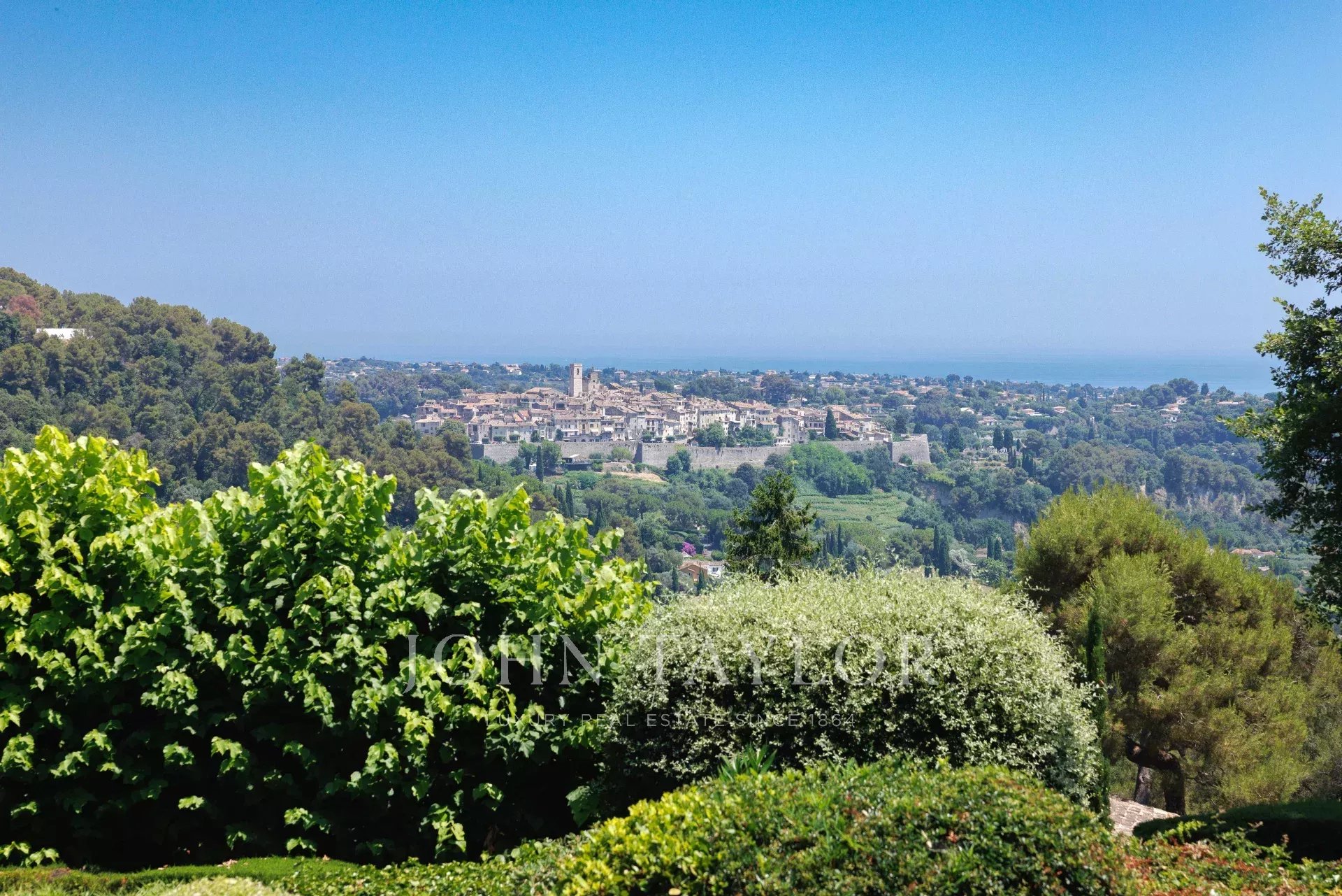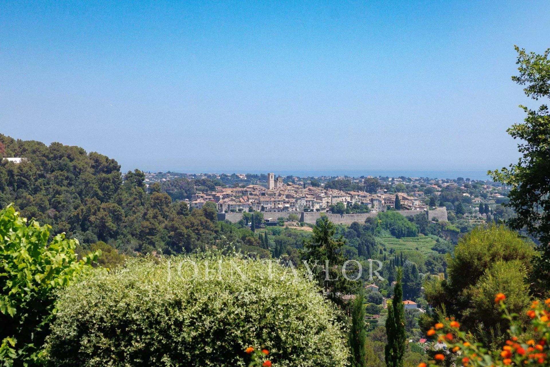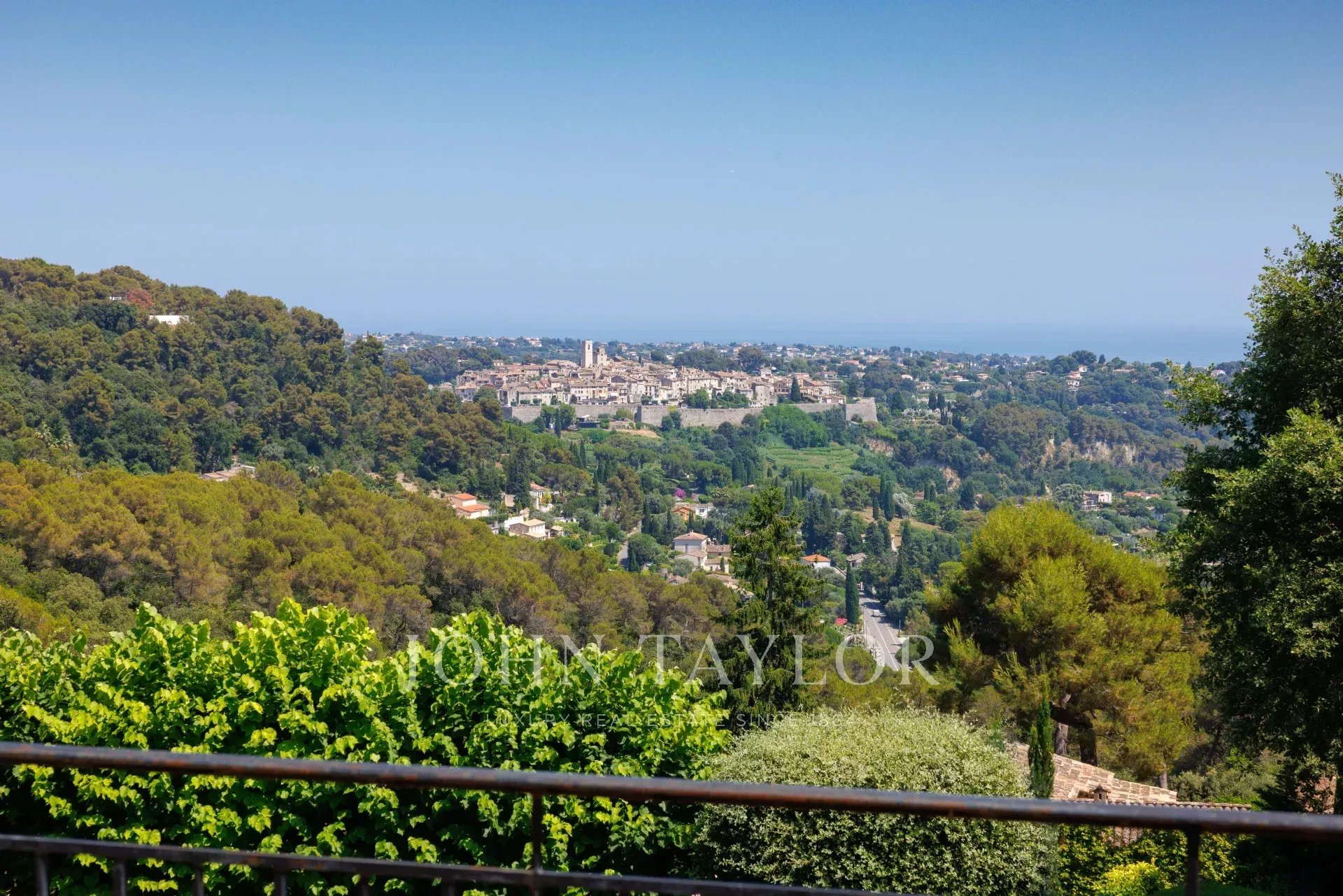 In one of the most sought-after neighborhoods of our beautiful region, in the quiet of residential heights, this 235 m² family property offers an exceptional setting on 2,850 m² of landscaped grounds with swimming pool. It enjoys breathtaking views over the emblematic village of Saint-Paul de Vence to the sea, as well as optimal sunshine throughout the day.