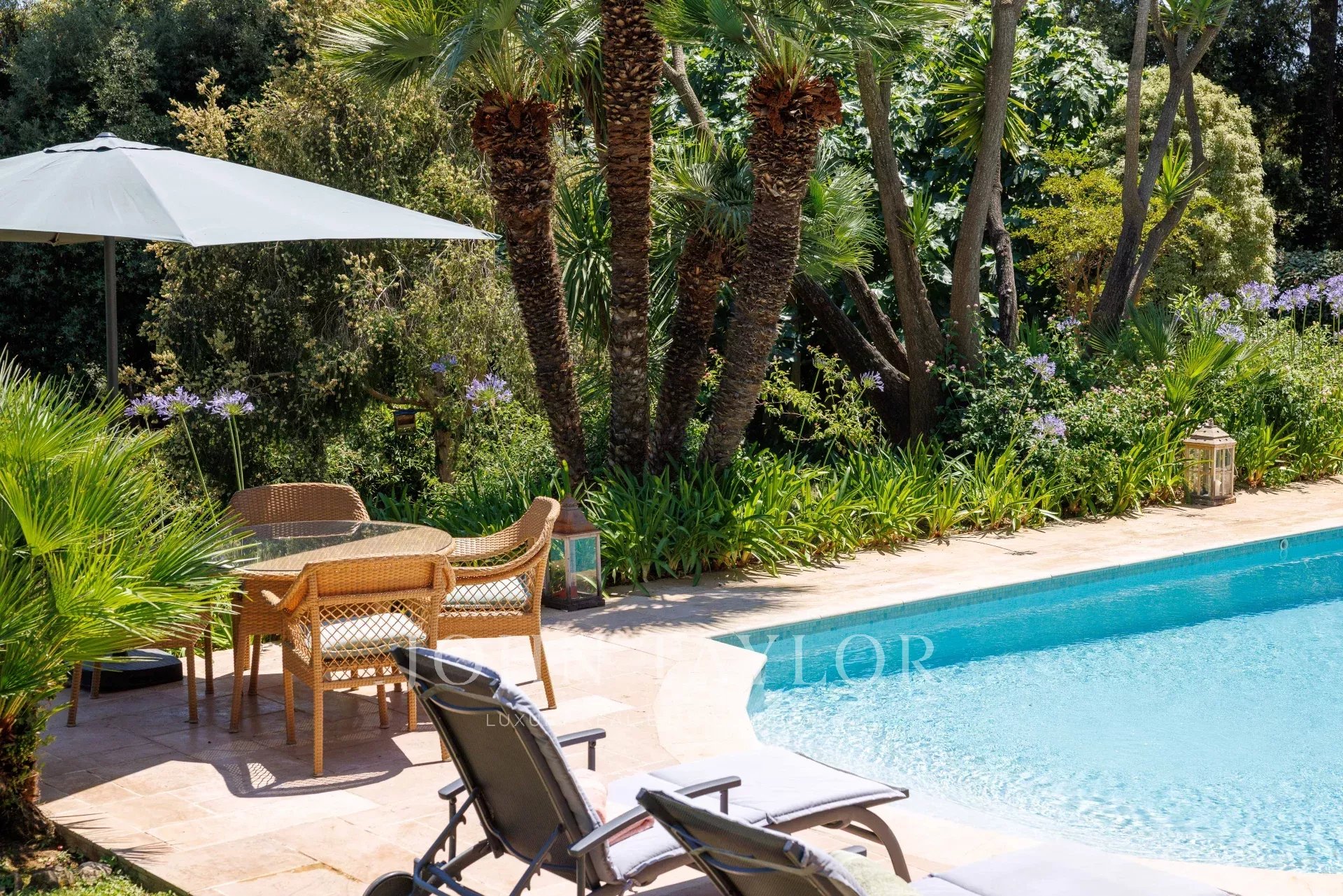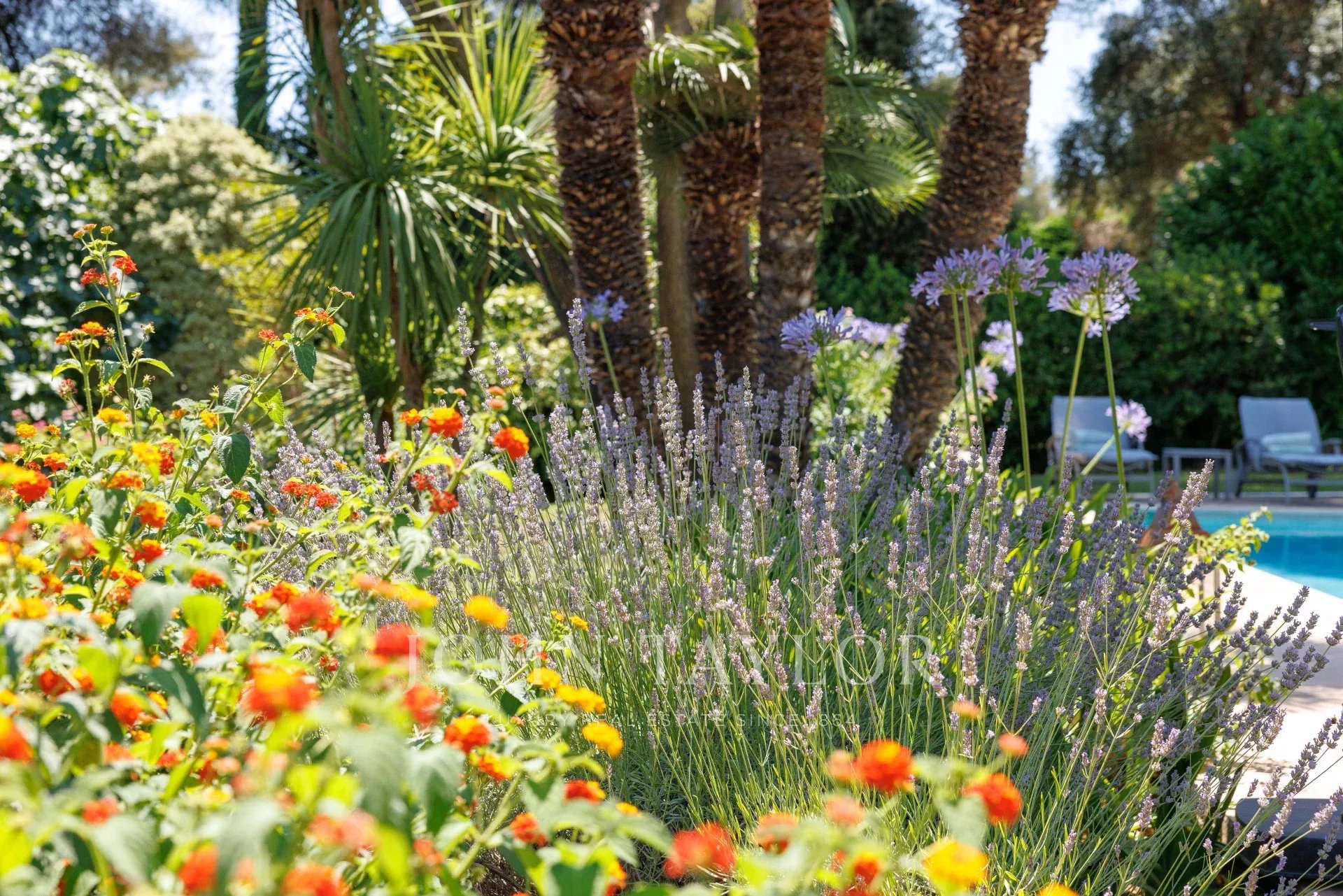 Outside, the perfectly manicured garden offers several different settings: a swimming pool bordered by terraces, a large lawn with a second relaxation area, and a reception area at the rear of the house.