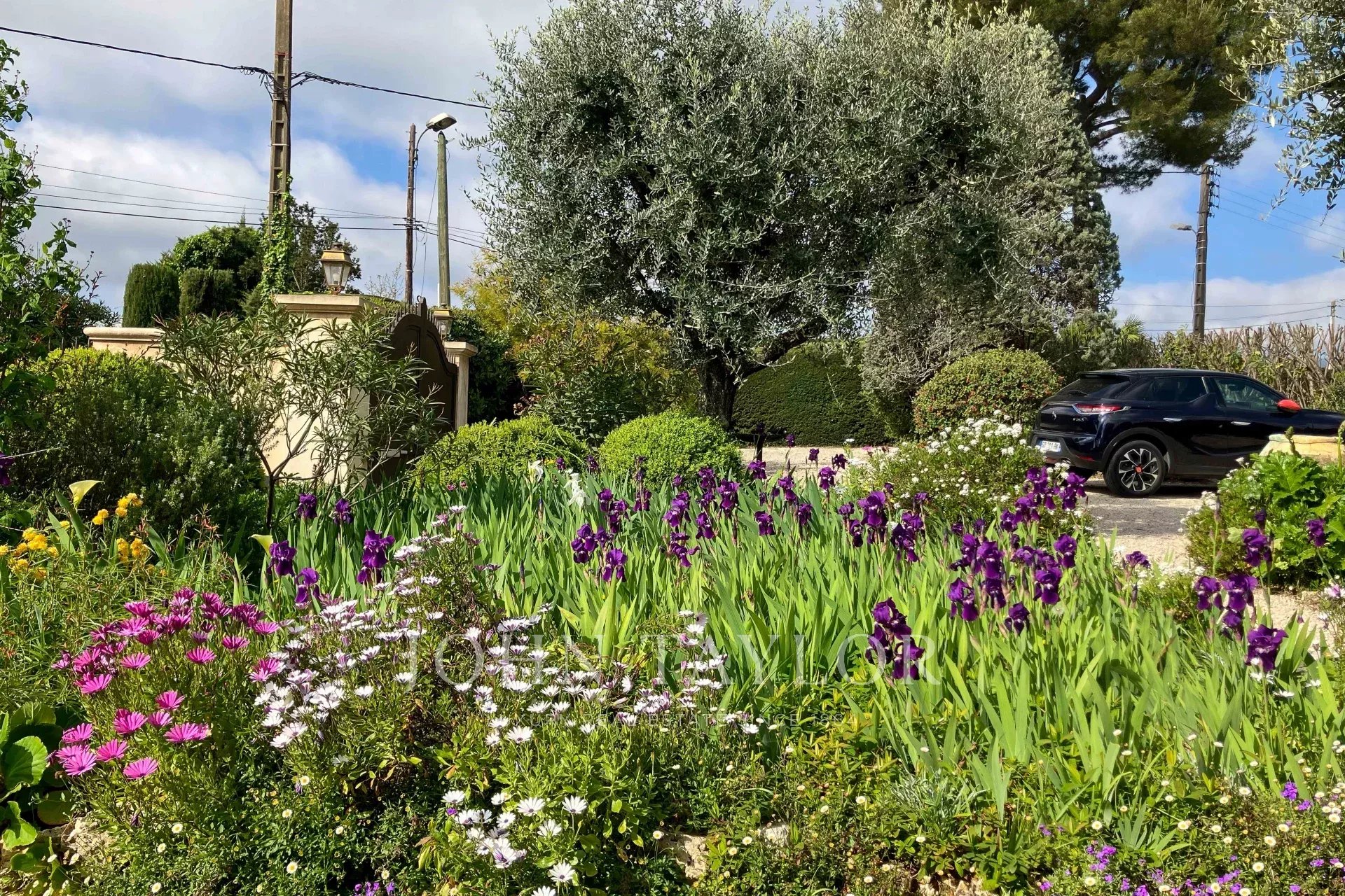 The landscaped garden to the EAST of the house, with paved paths and a petanque court.