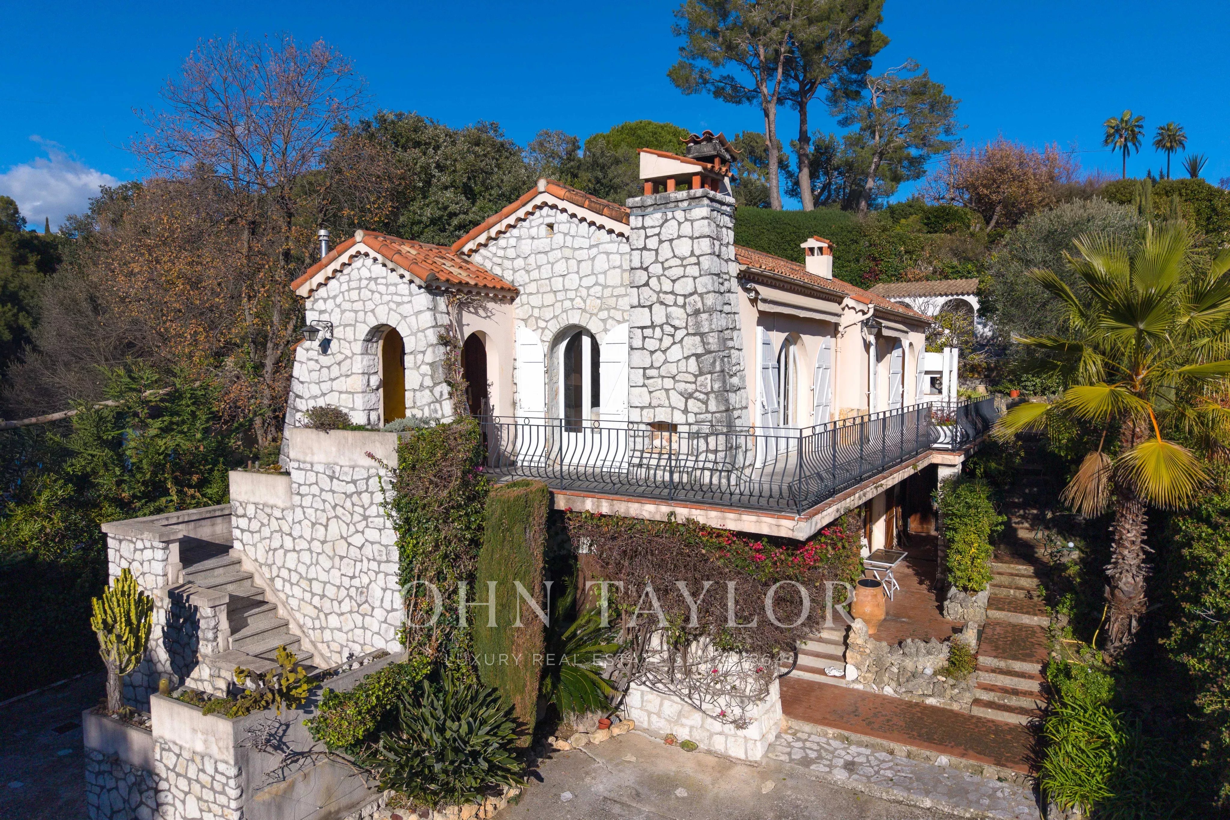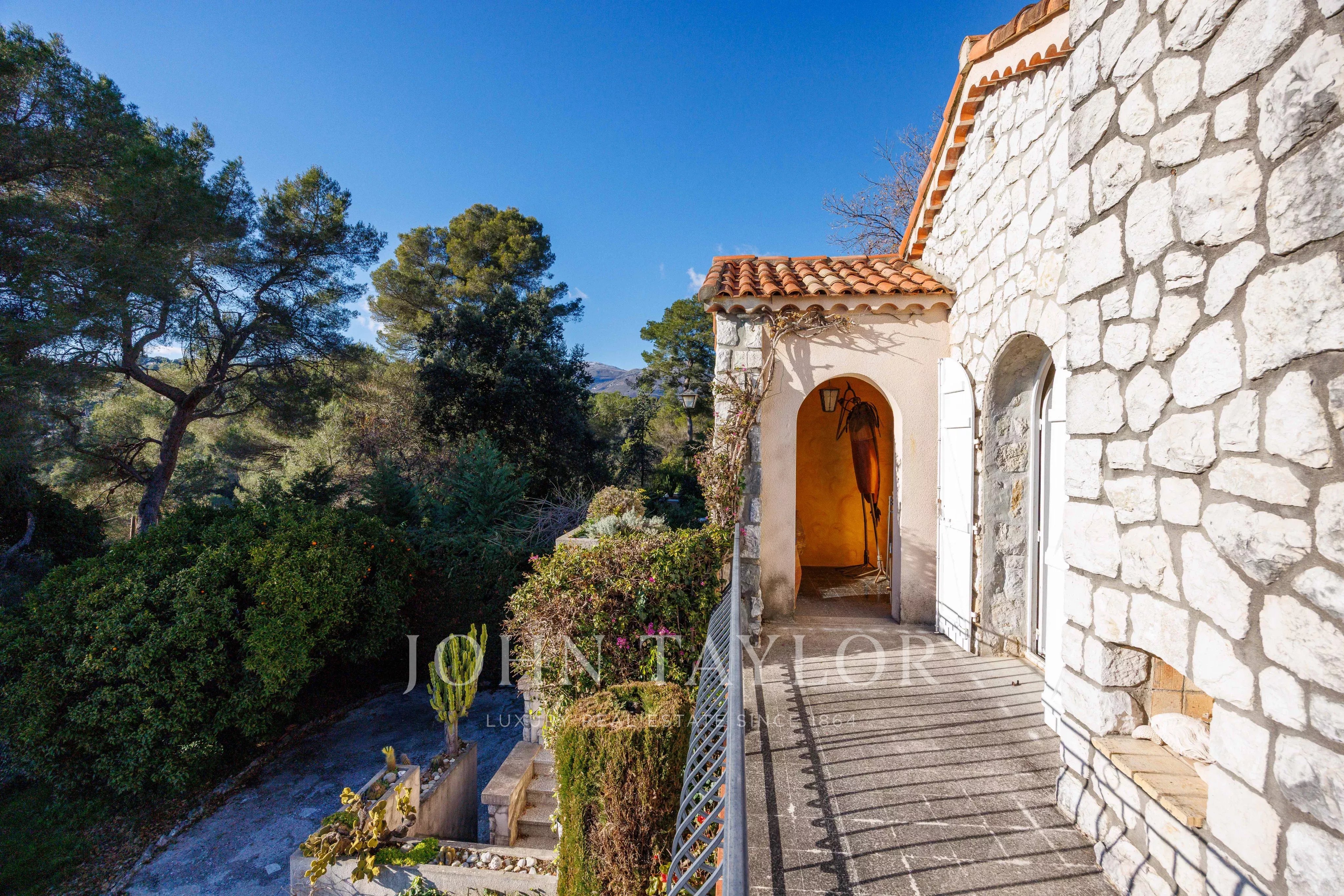 Ideally situated in the quiet, residential heights of Saint-Paul-de-Vence, in a sought-after neighborhood, this charming, partially stone-built house of approx. 141 m² offers unobstructed views all the way to the sea and Cap d'Antibes, with optimal southeast and southwest exposure. It features an infinity pool, whirlpool and pool house.