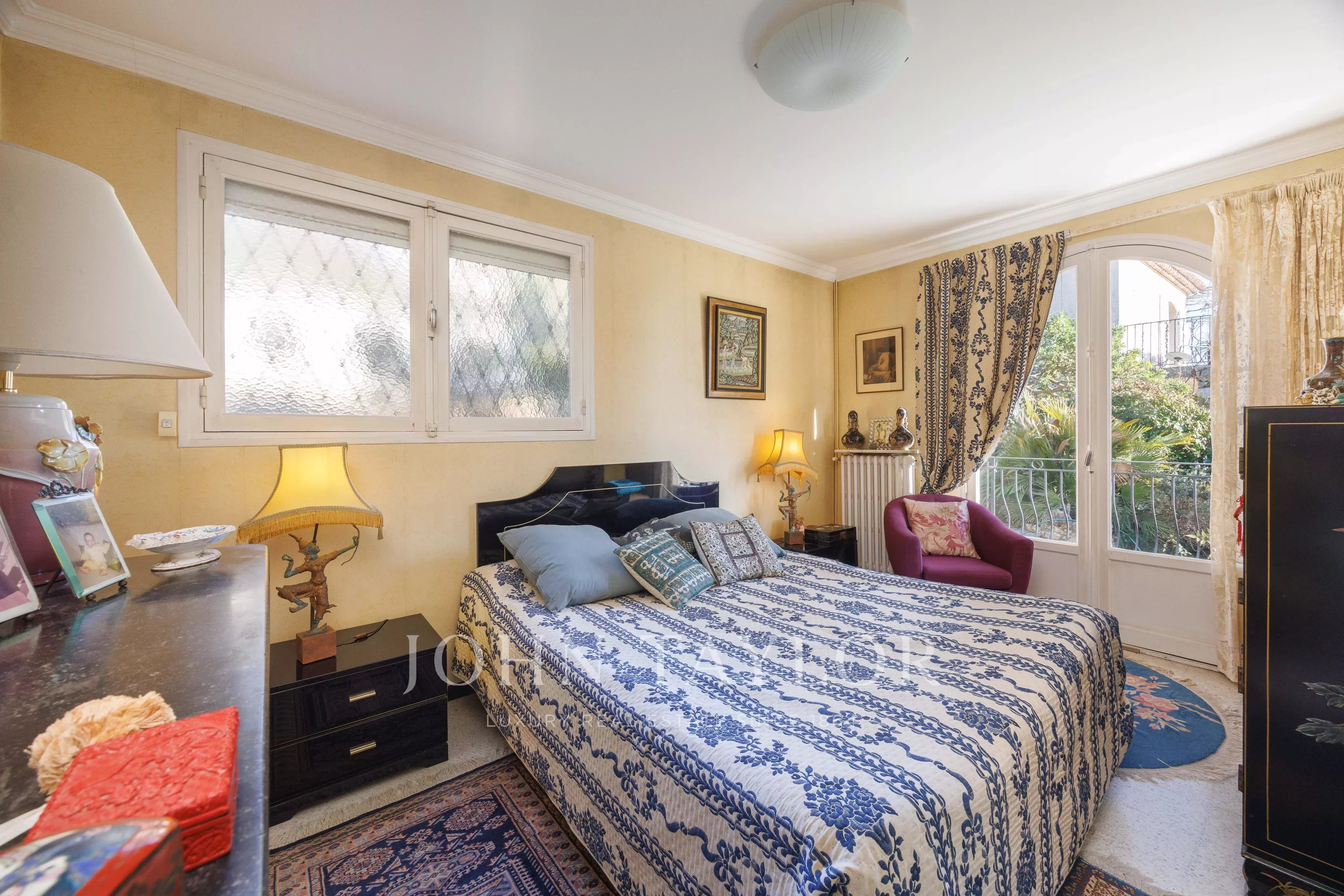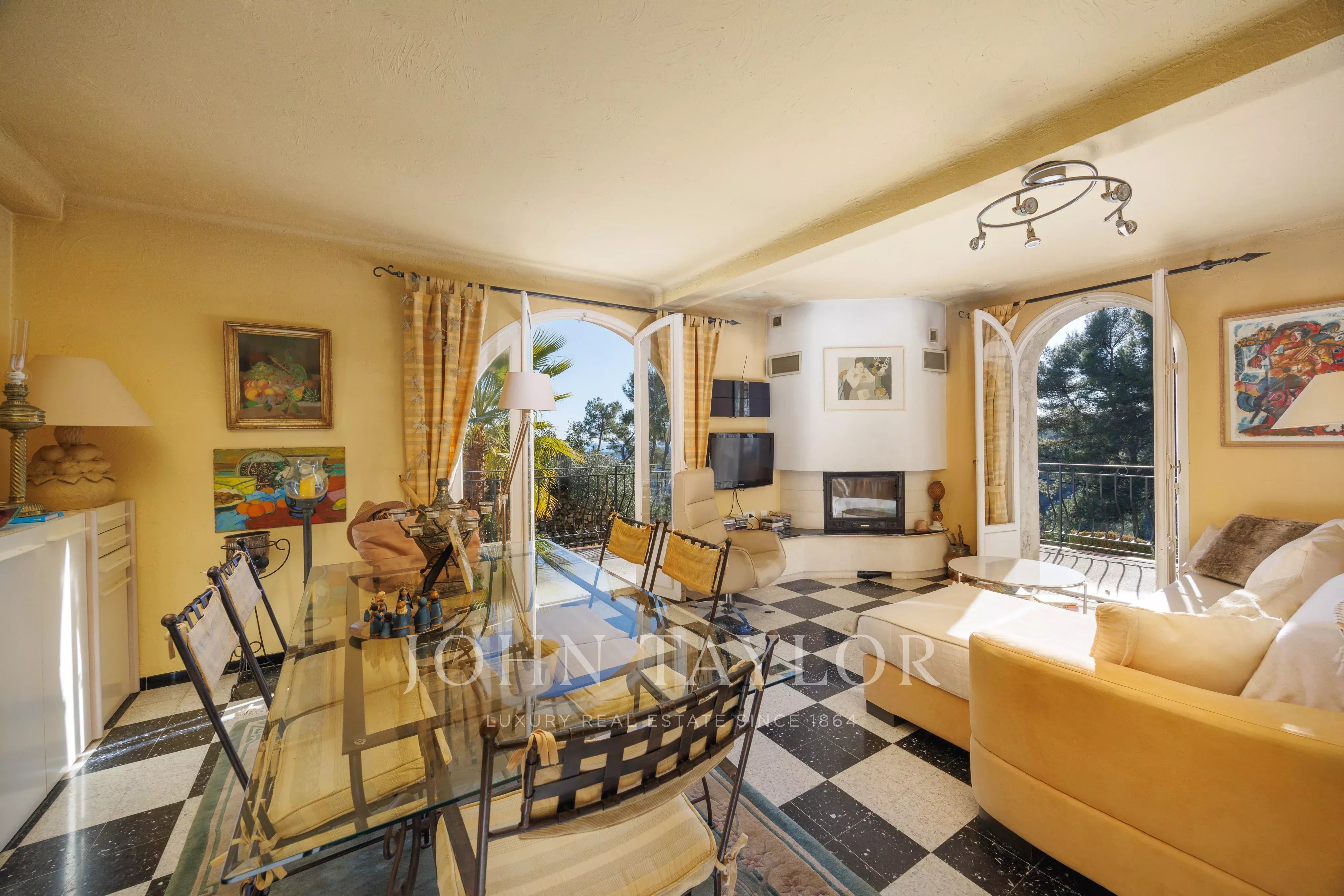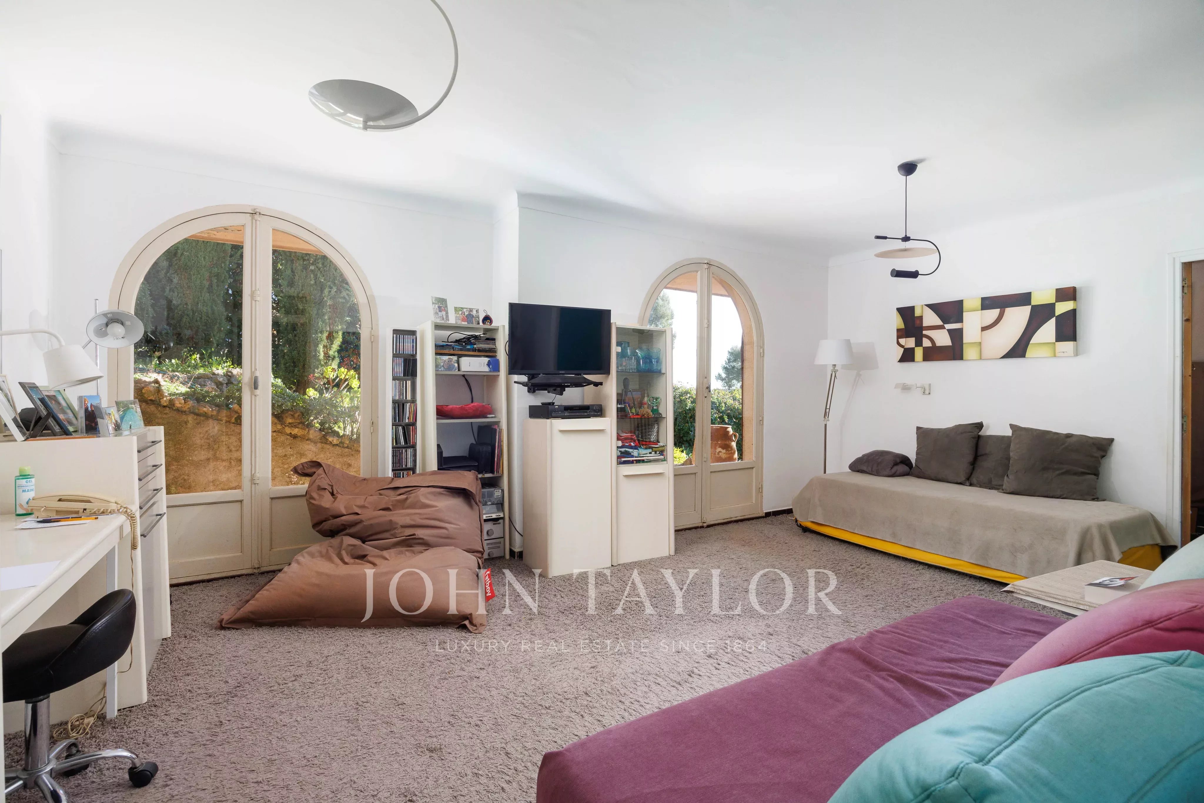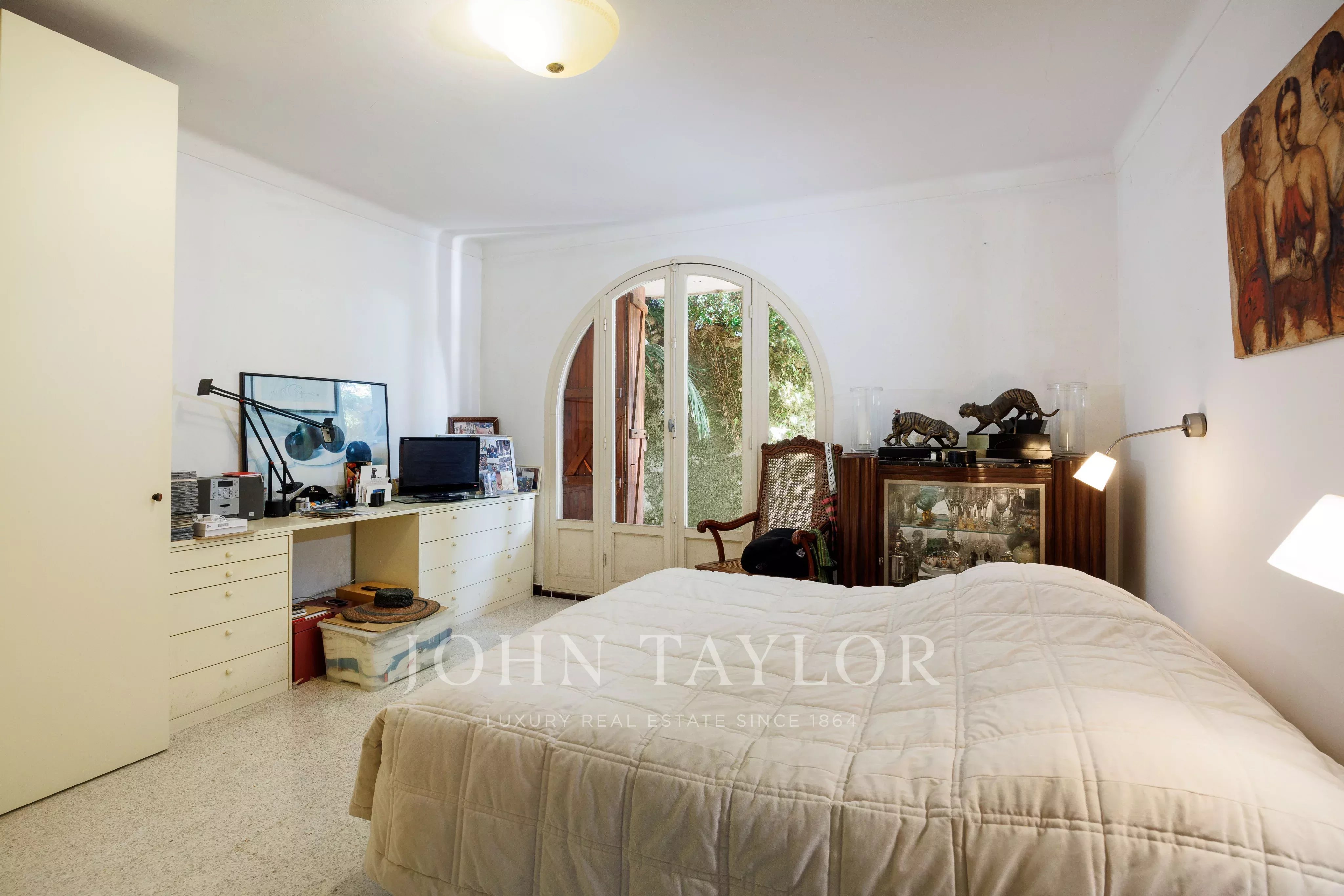 The upper garden level houses the living areas: a bright living room with fireplace, opening onto the terrace and garden, a kitchen that can easily be opened onto the living room, as well as a master bedroom, dressing room and shower room. On the first floor, a bedroom and a vast modular space allowing the creation of two additional bedrooms, today with kitchenette corner, all opening onto covered terraces, completed by a music room, a cellar, a laundry room and a boiler room.