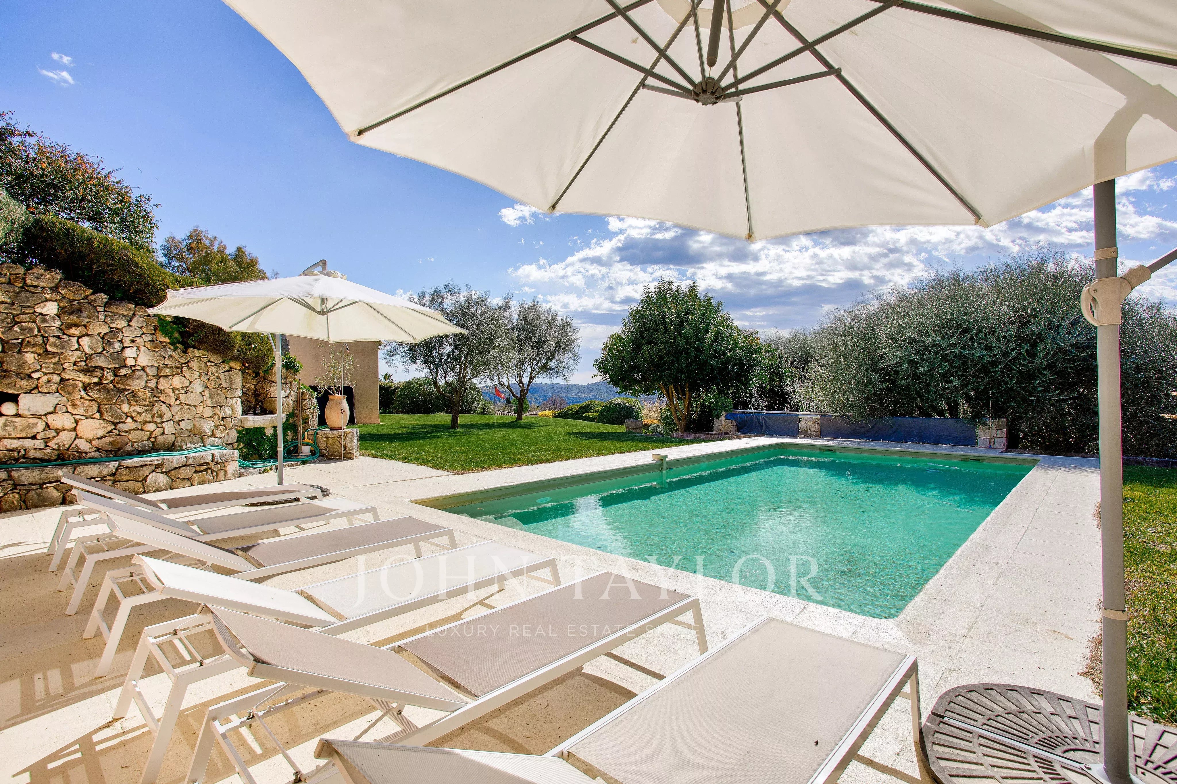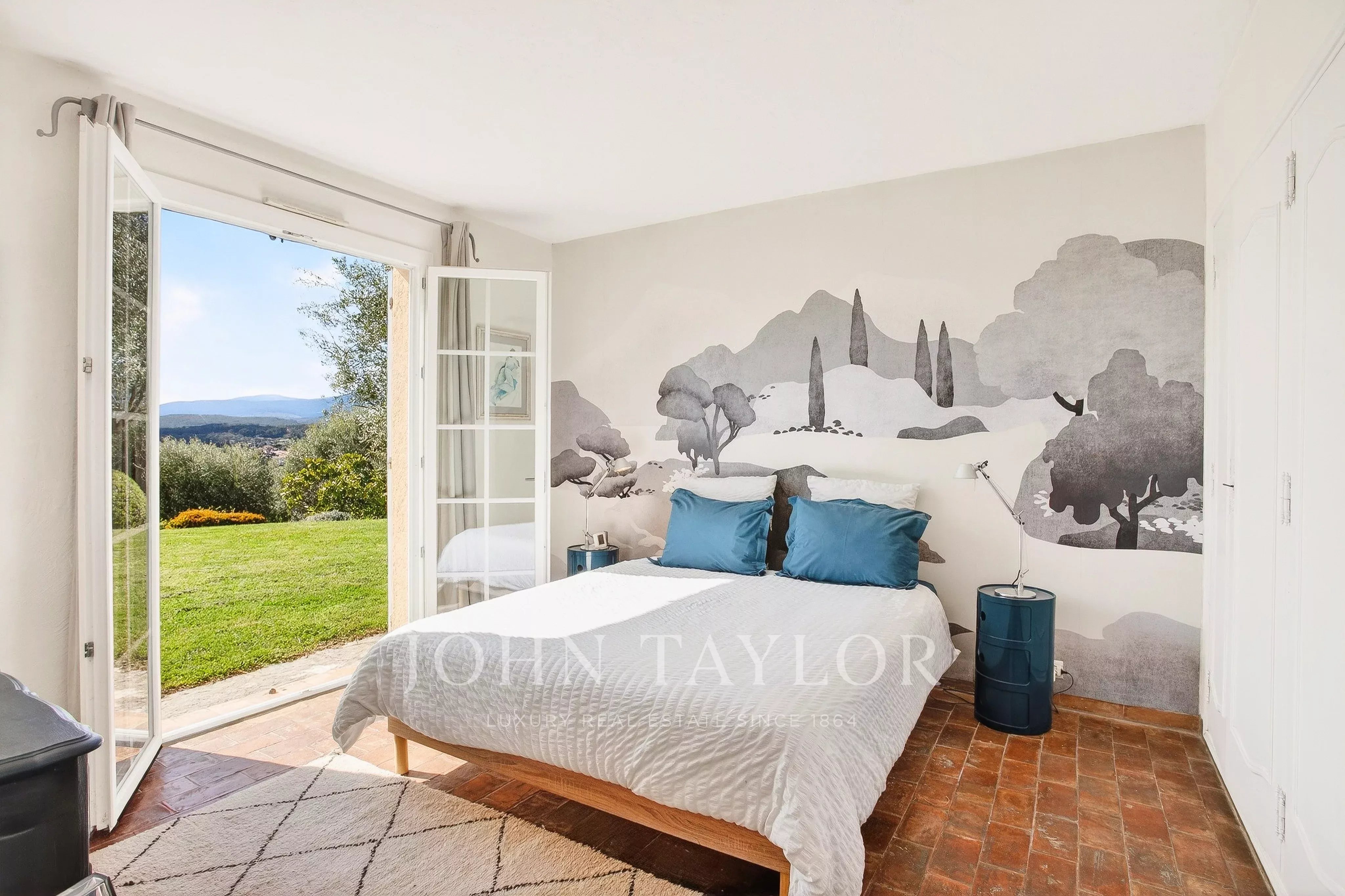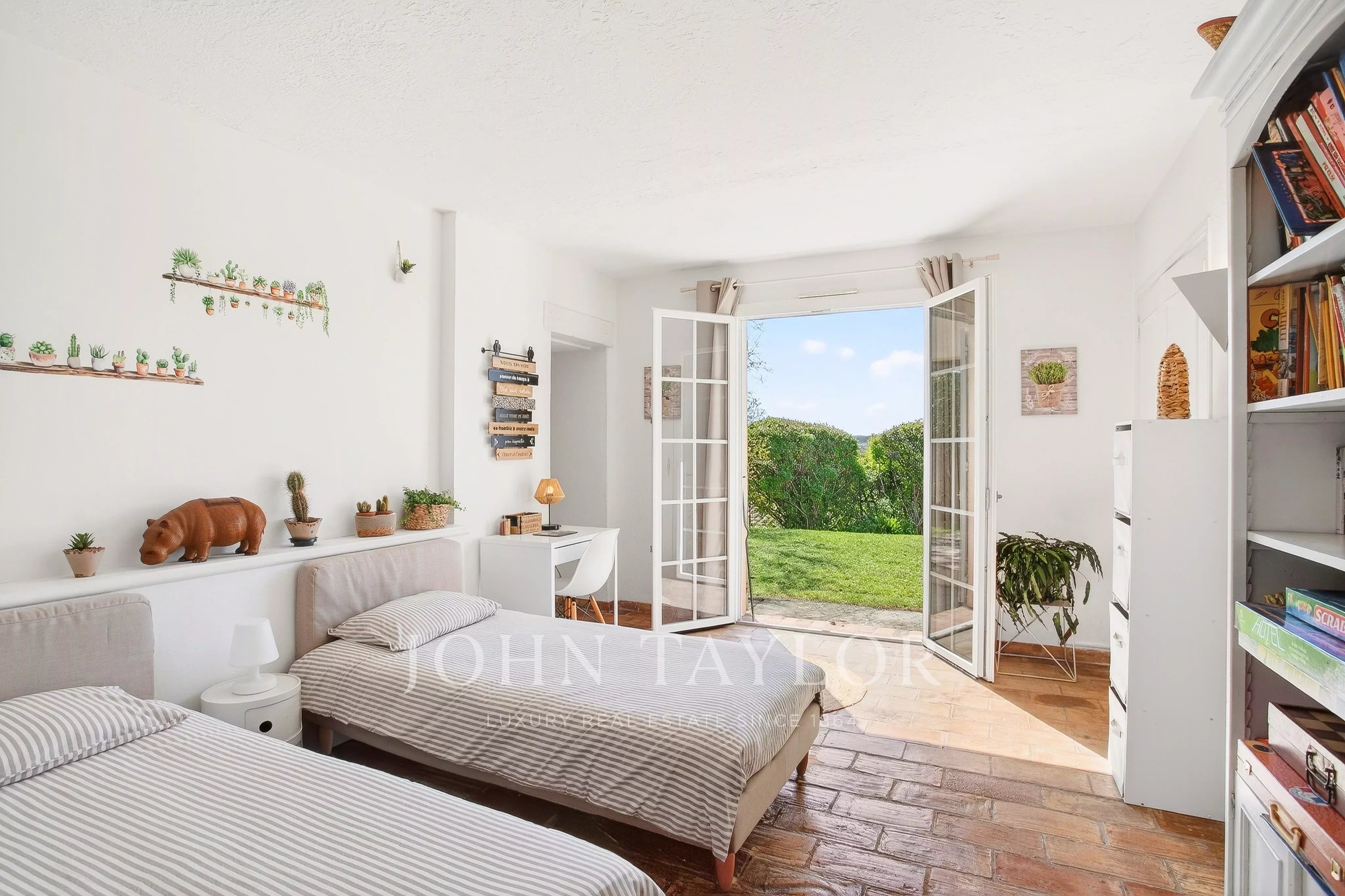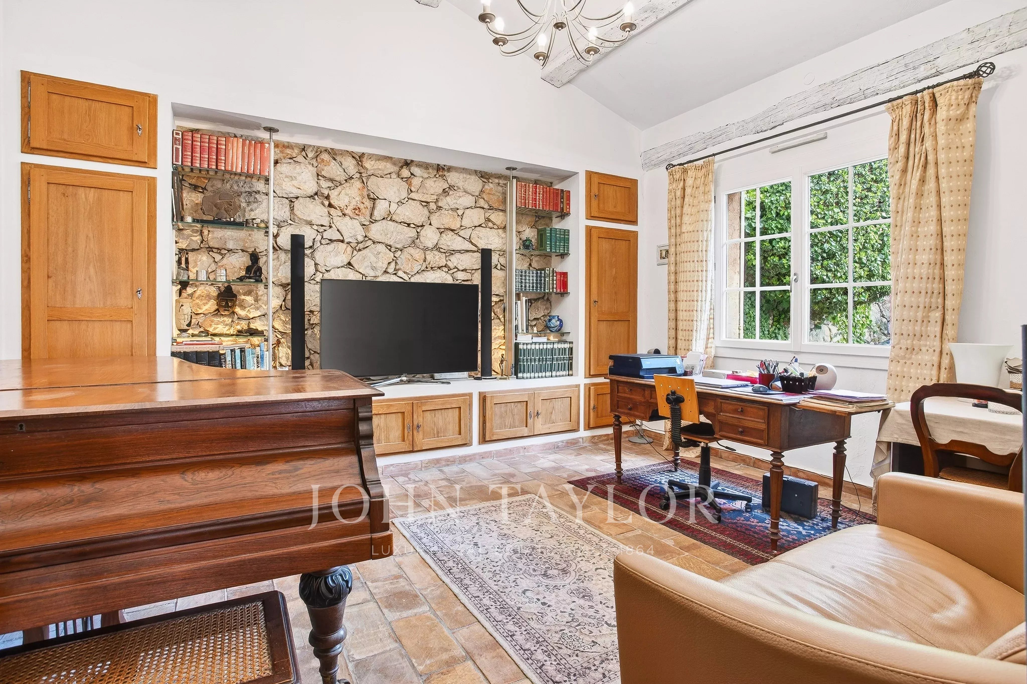 Located on the heights of Saint-Paul de Vence, within a small estate of two properties, this charming single-storey home of 175 sqm, set on a flat plot of 2,358 sqm, offers 4 en-suite bedrooms, a study, a swimming pool, a carport, and open views in a peaceful and green environment.