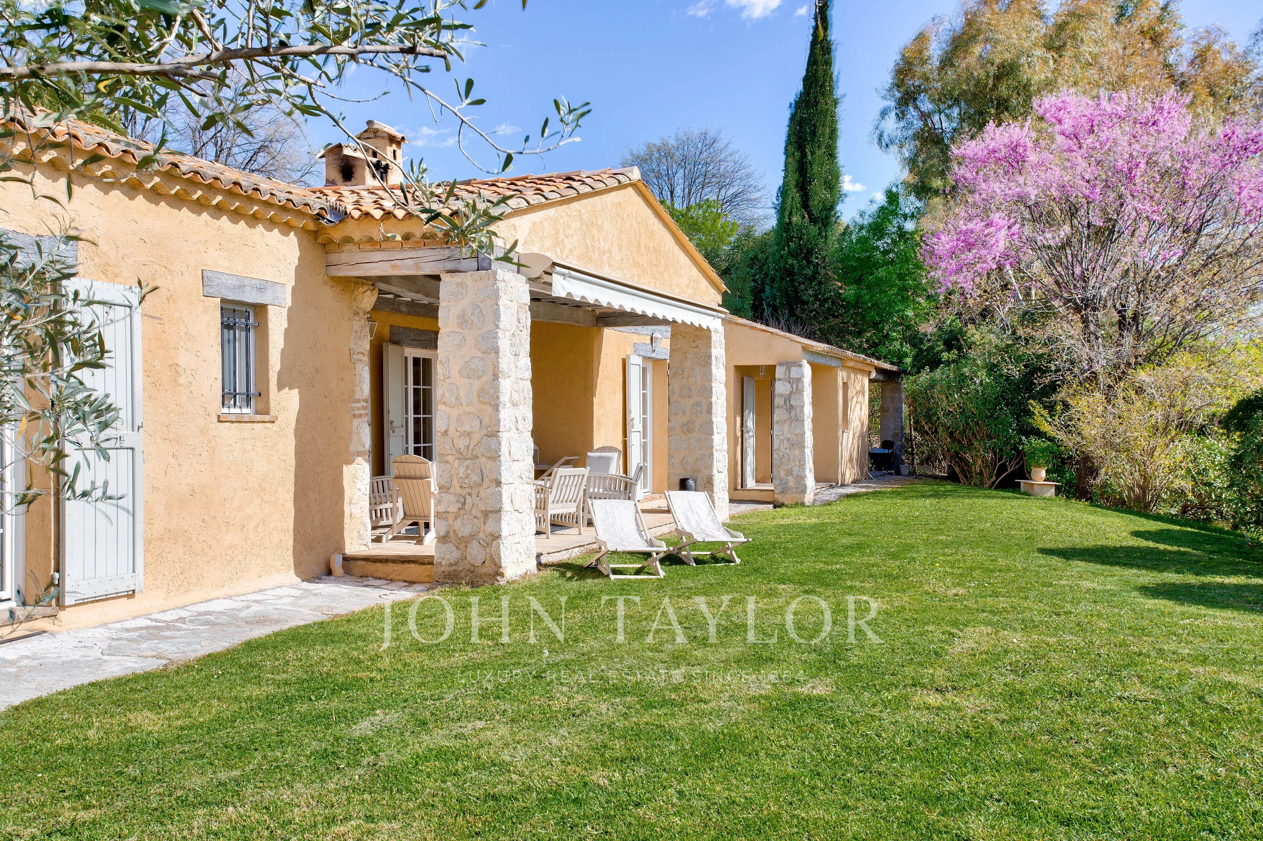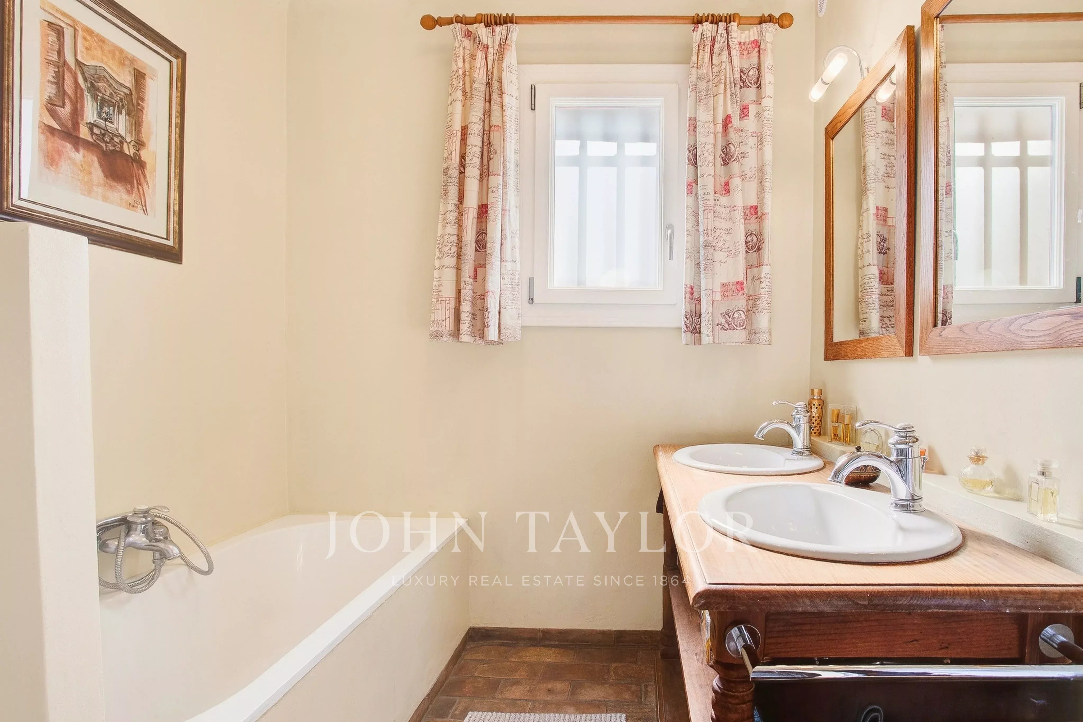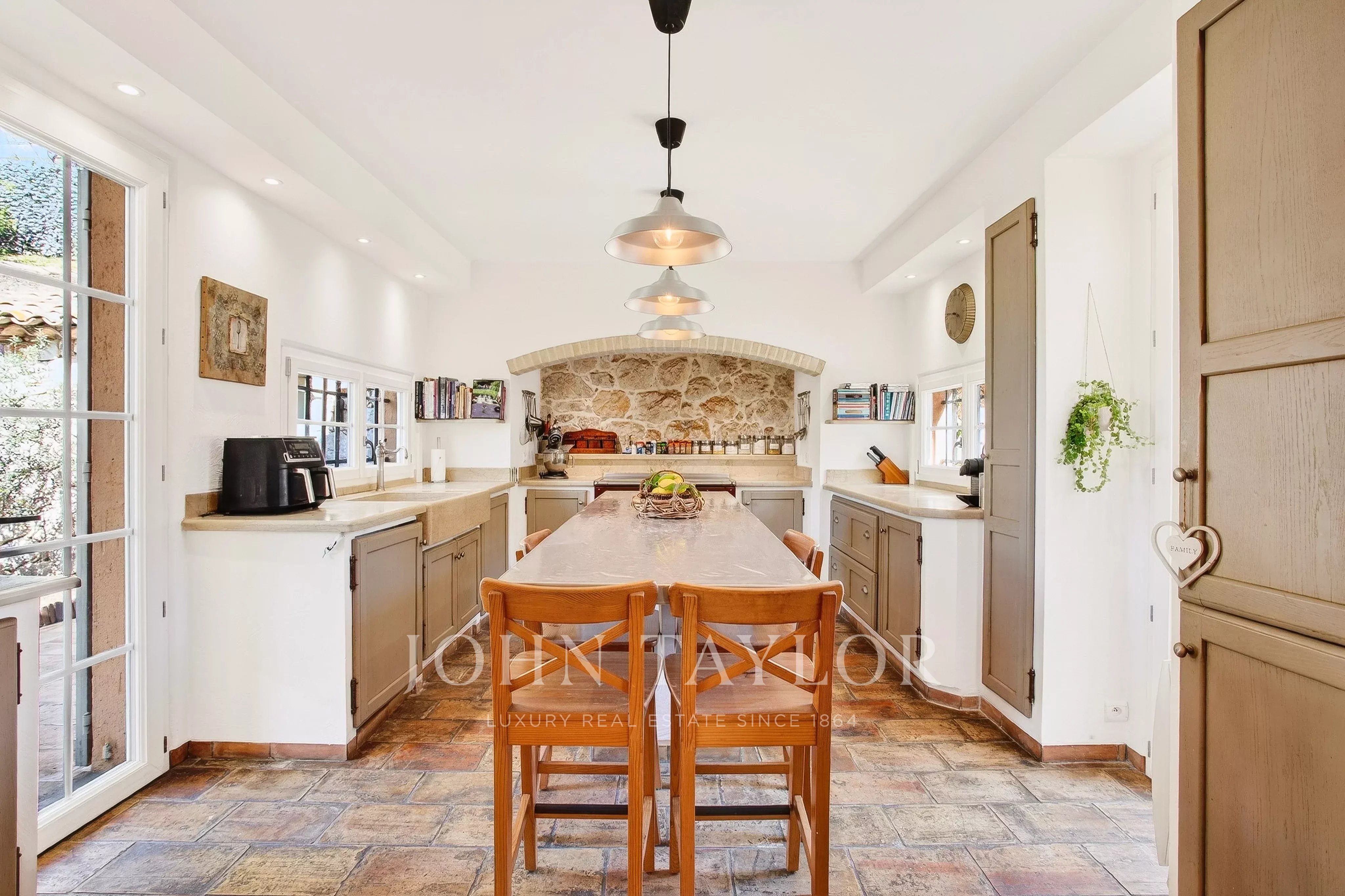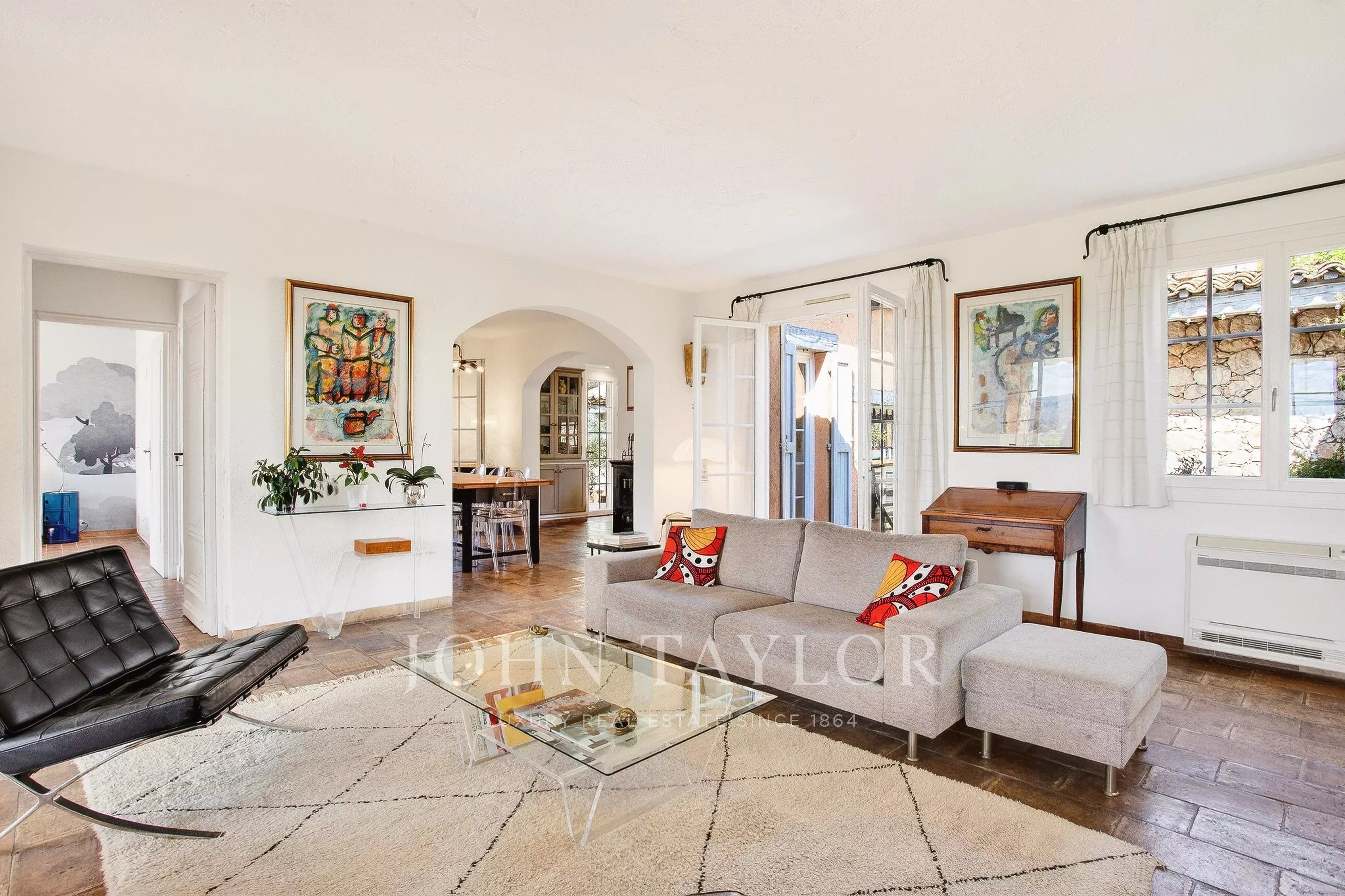Located on the heights of Saint-Paul de Vence, within a small estate of two properties, this charming single-storey home of 175 sqm, set on a flat plot of 2,358 sqm, offers 4 en-suite bedrooms, a study, a swimming pool, a carport, and open views in a peaceful and green environment.