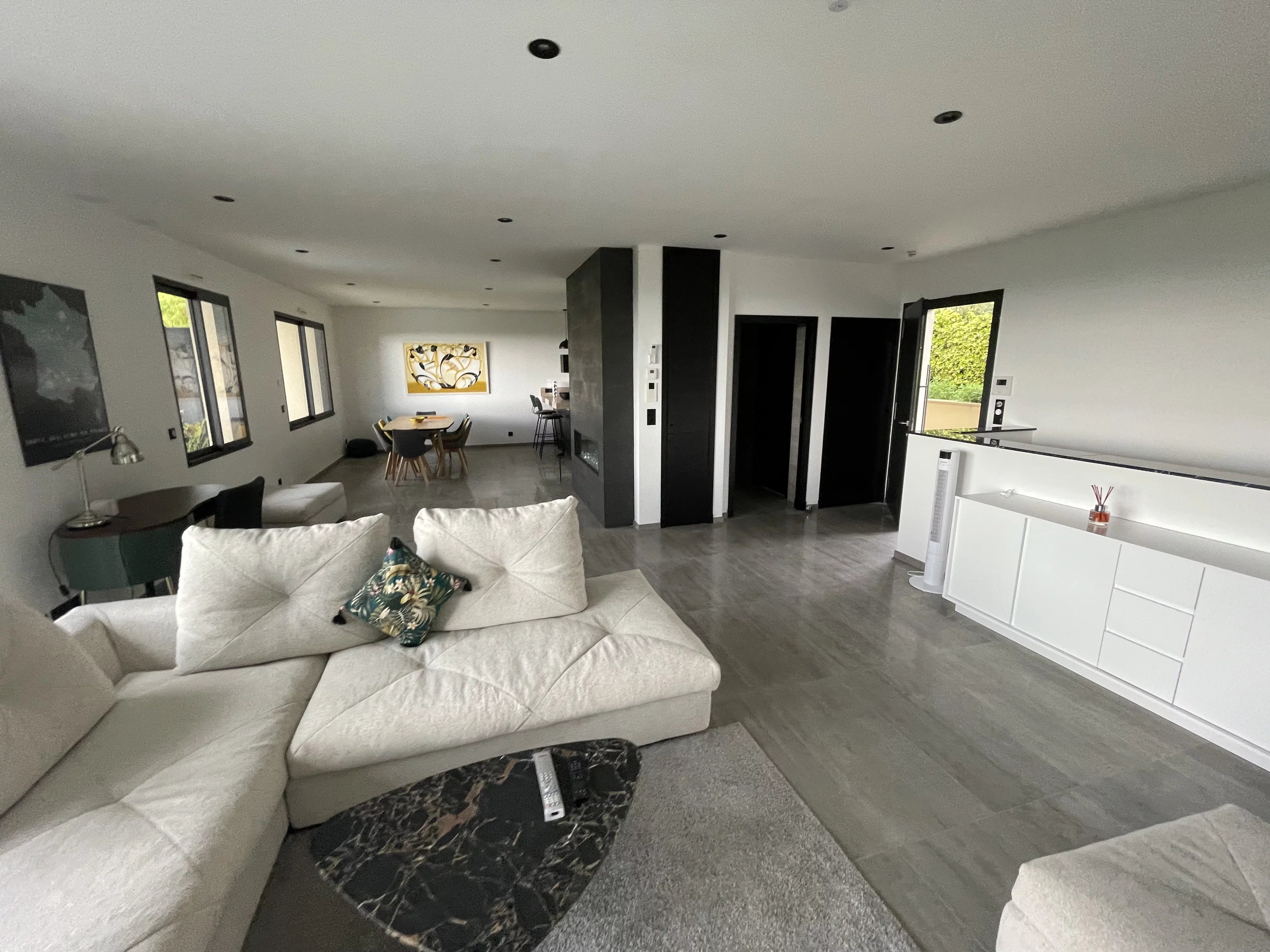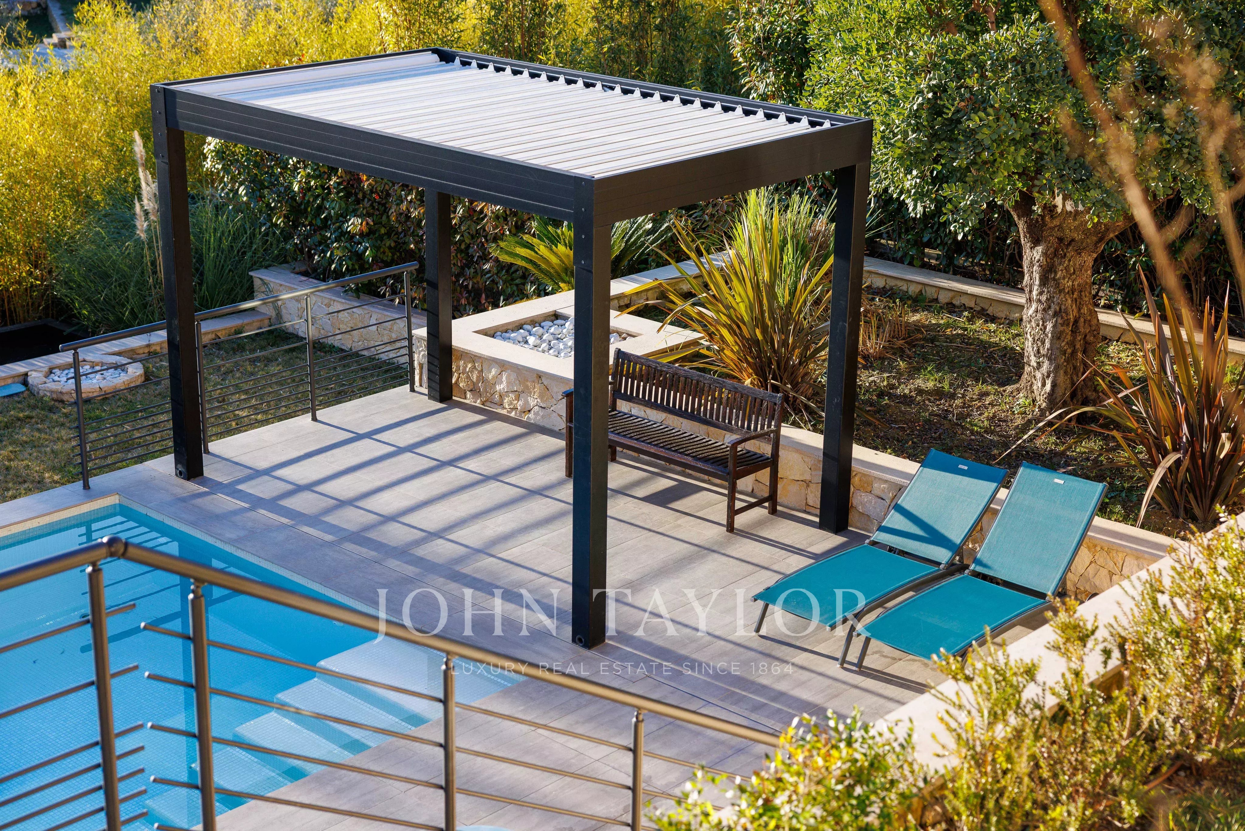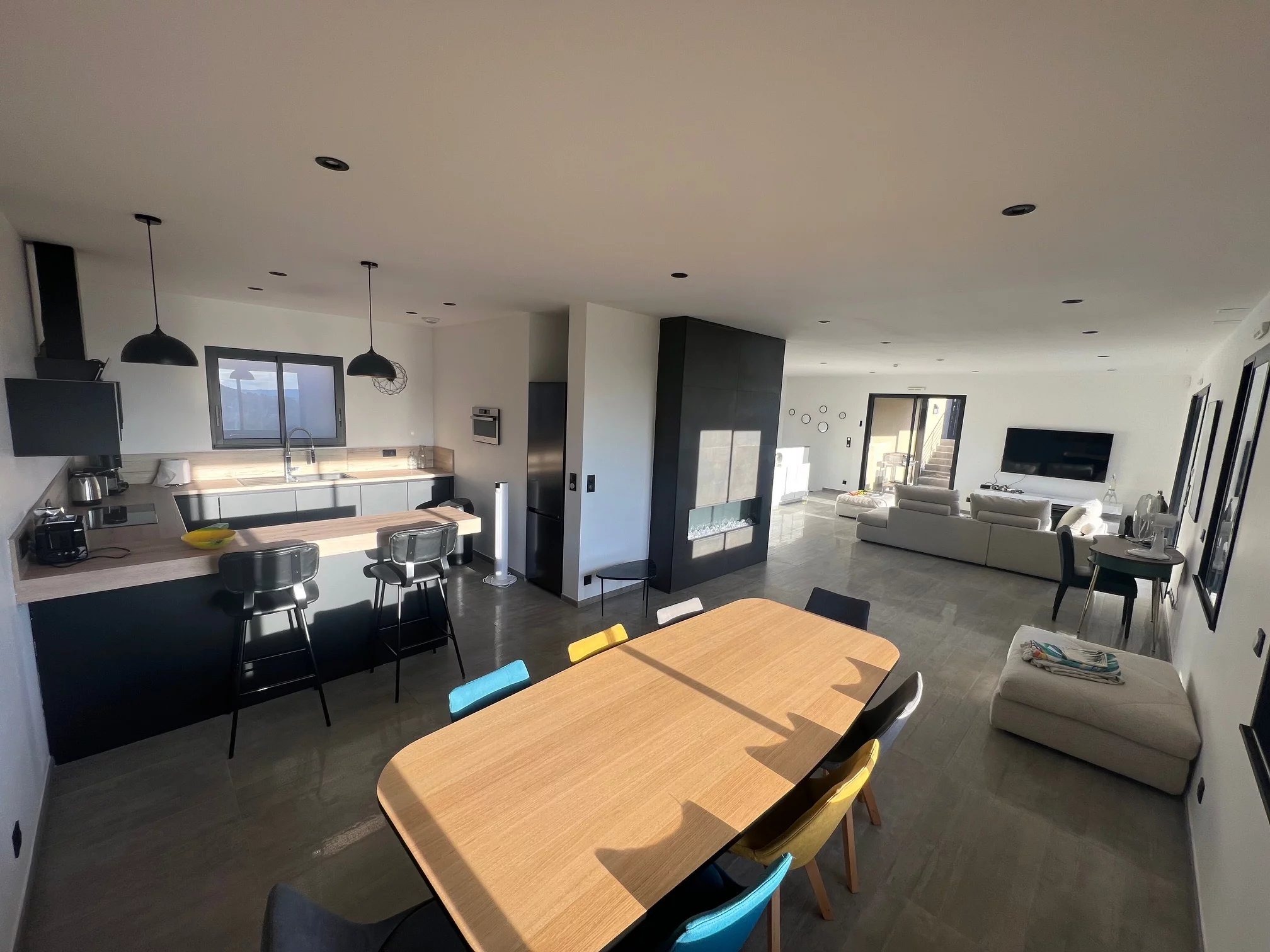 High-end amenities throughout: underfloor heating, reversible air conditioning via heat pump, electric fireplace, aluminum double-glazed windows, centralized electric shutters, alarm system, video intercom, fiber optic internet, LED lighting inside and out, RJ45 and USB outlets, bioclimatic pergola, 7.5 x 4 m heated pool, mains drainage and electric awnings.