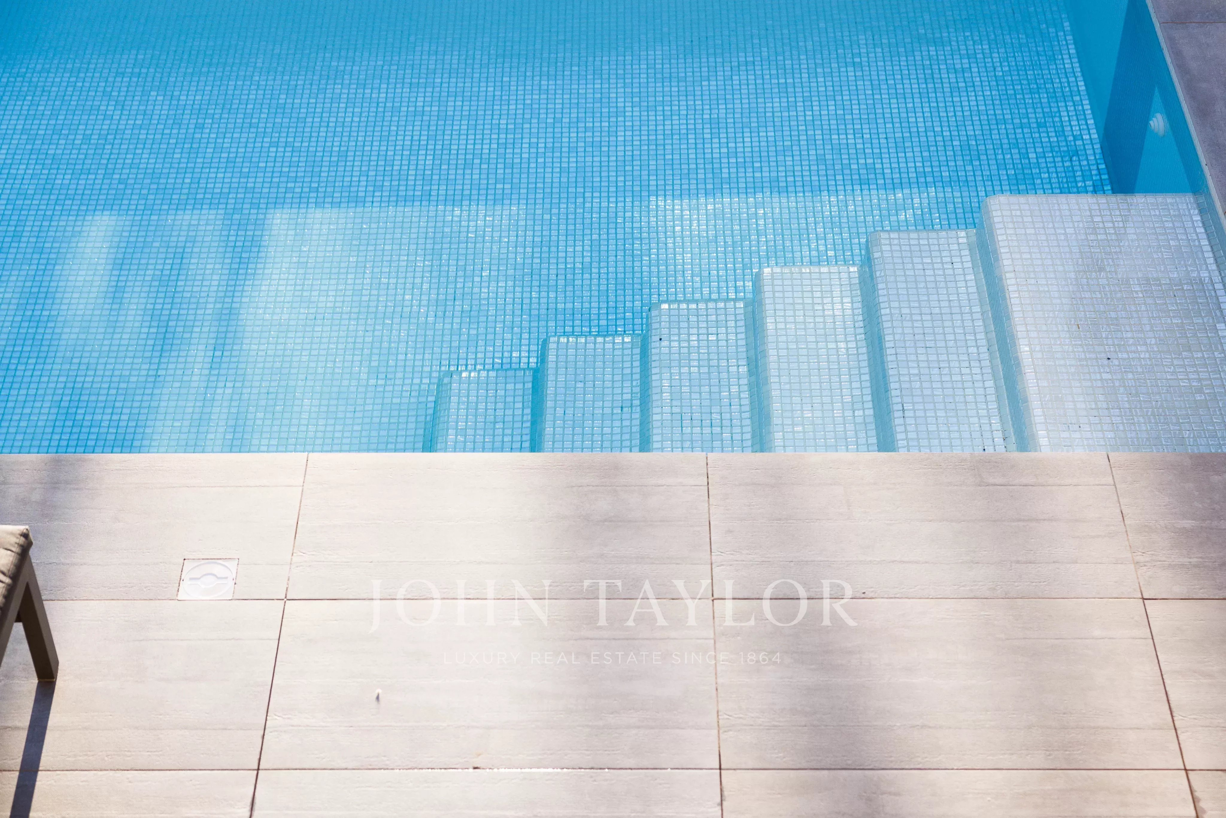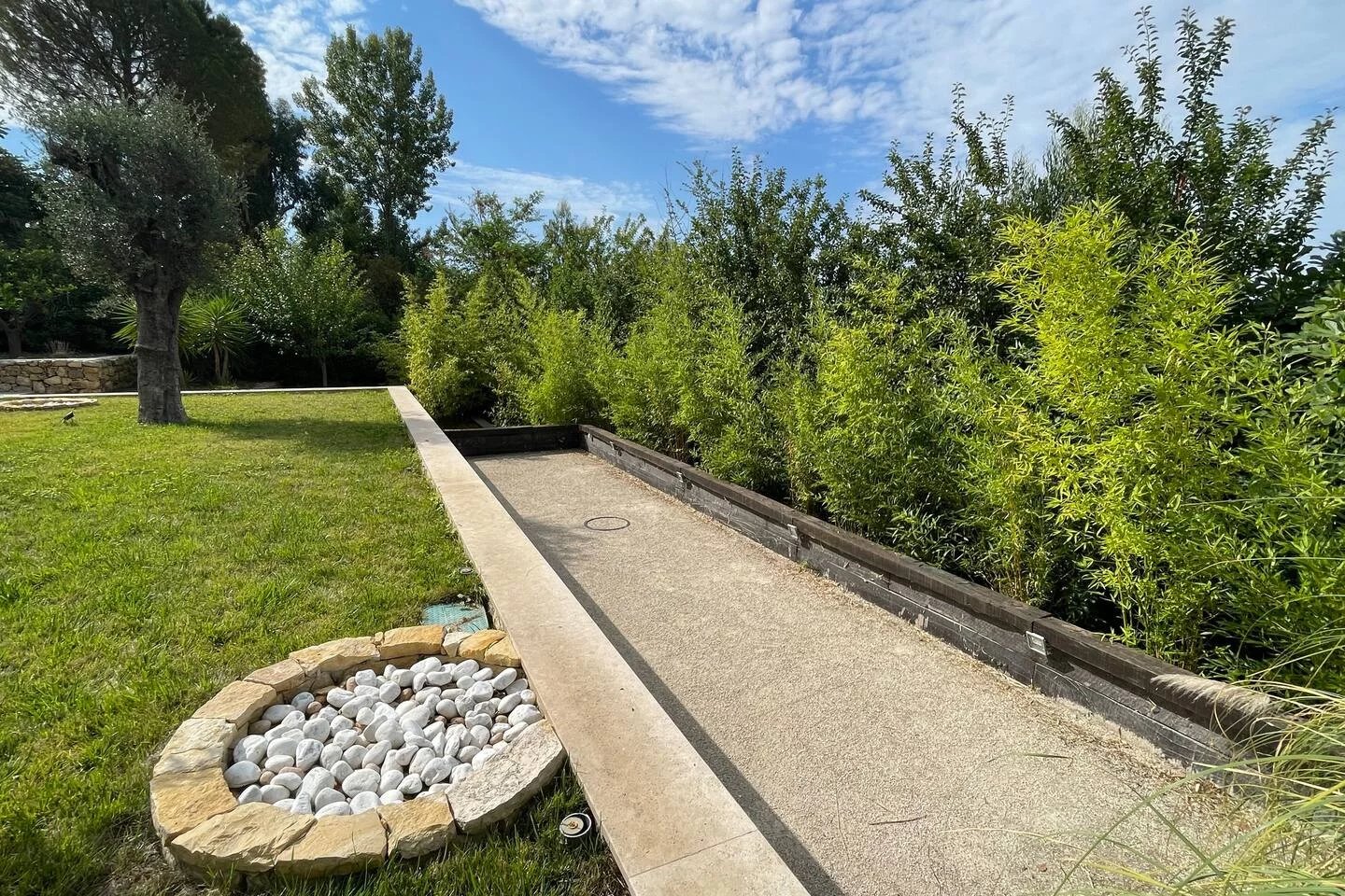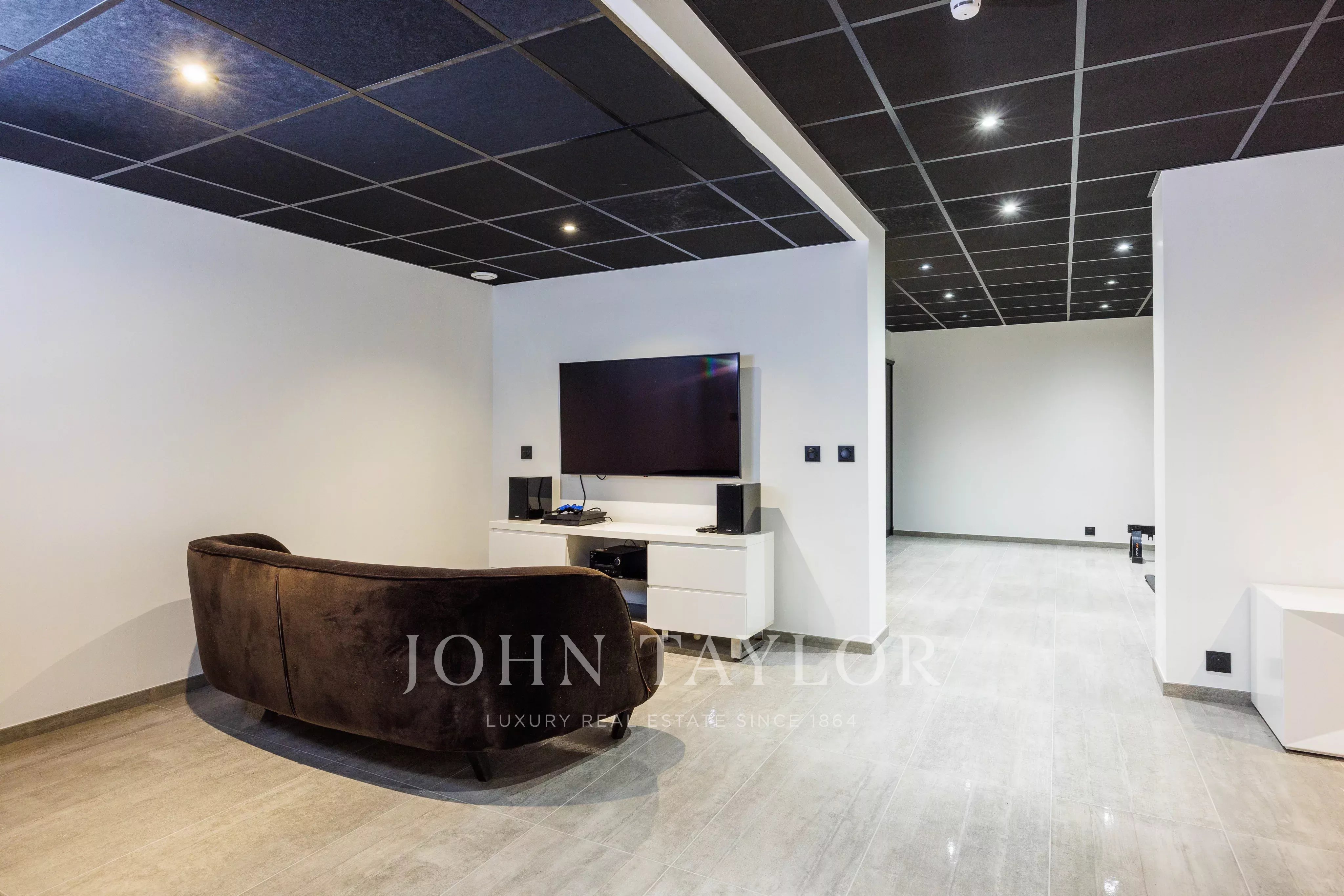 High-end amenities throughout: underfloor heating, reversible air conditioning via heat pump, electric fireplace, aluminum double-glazed windows, centralized electric shutters, alarm system, video intercom, fiber optic internet, LED lighting inside and out, RJ45 and USB outlets, bioclimatic pergola, 7.5 x 4 m heated pool, mains drainage and electric awnings.
