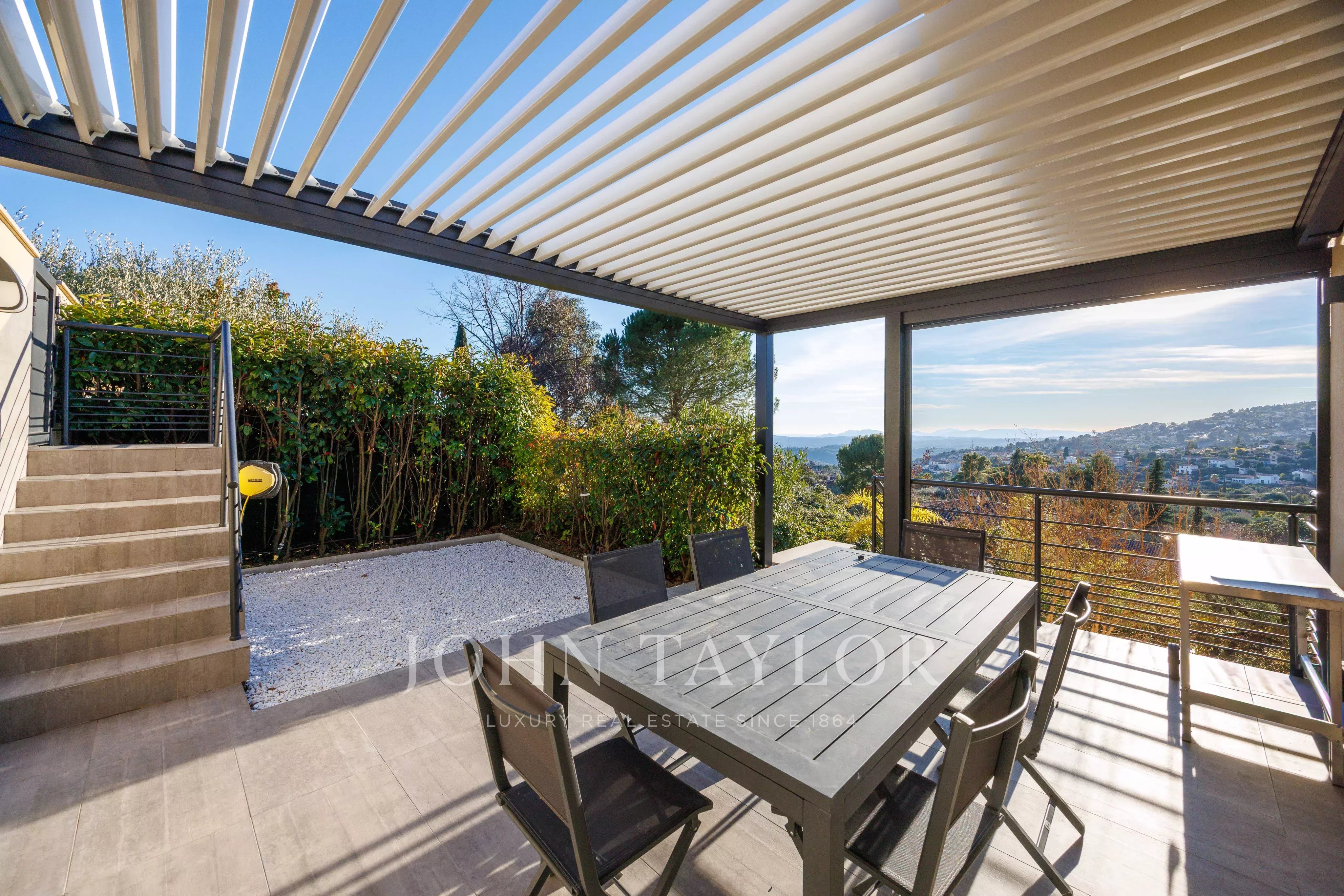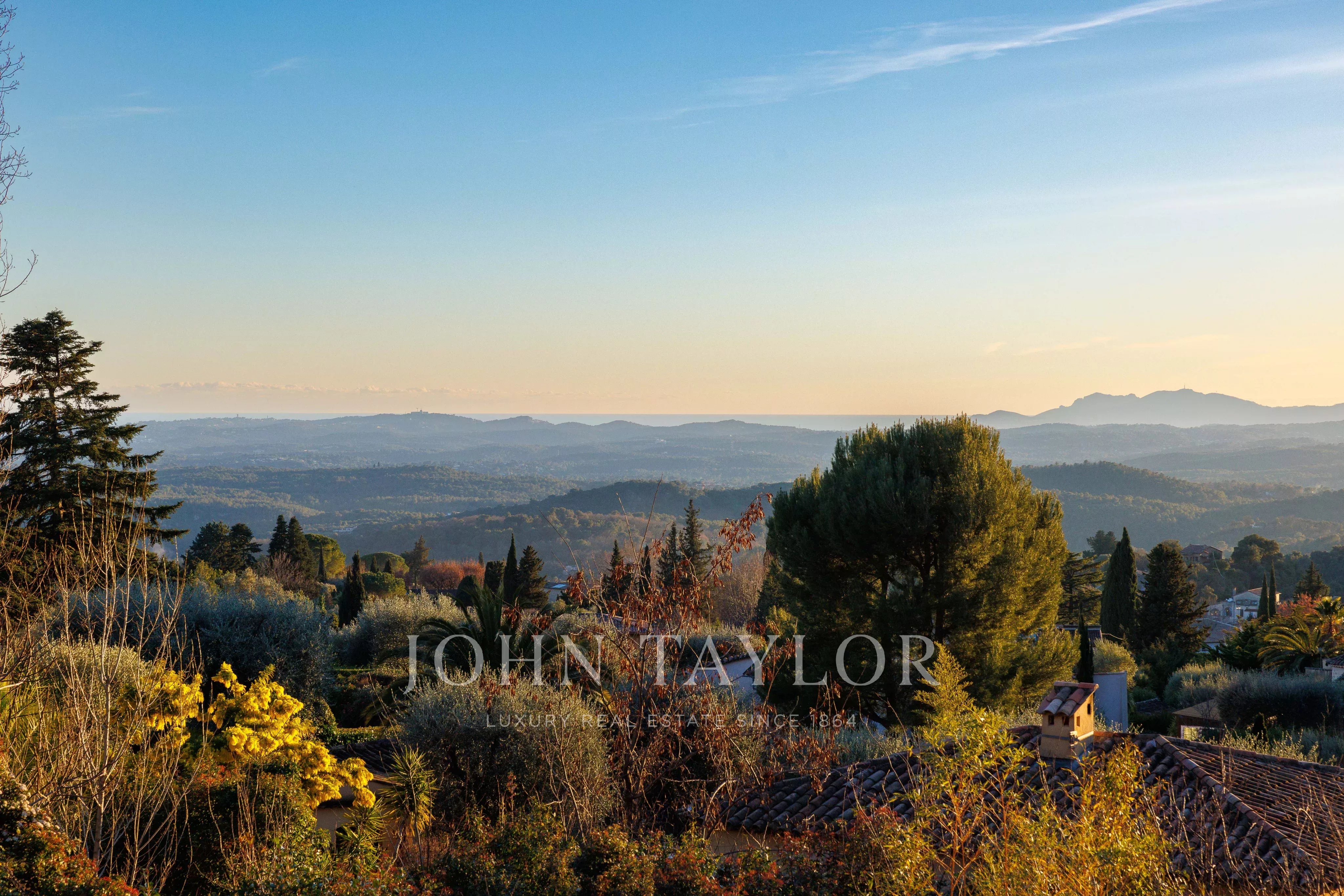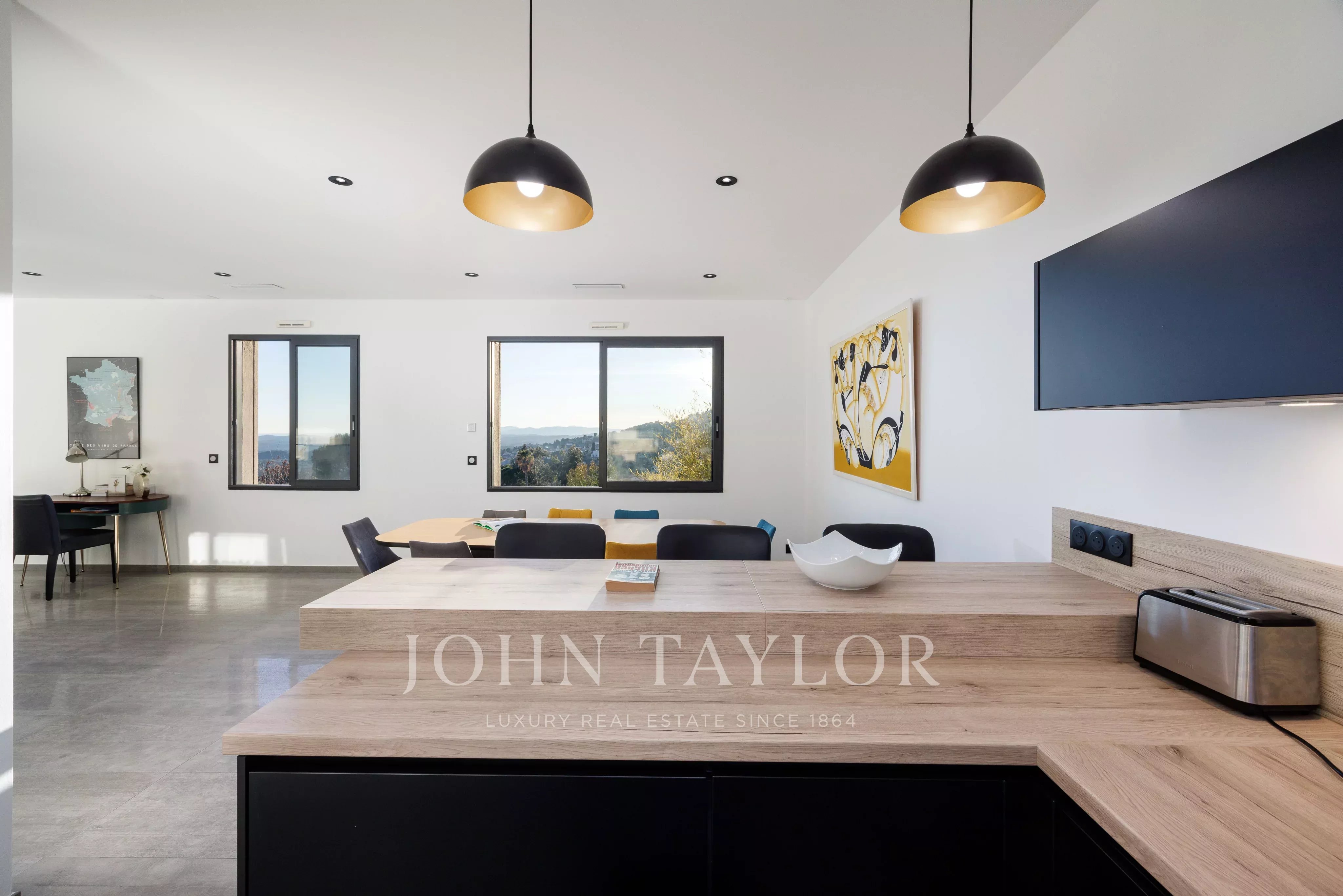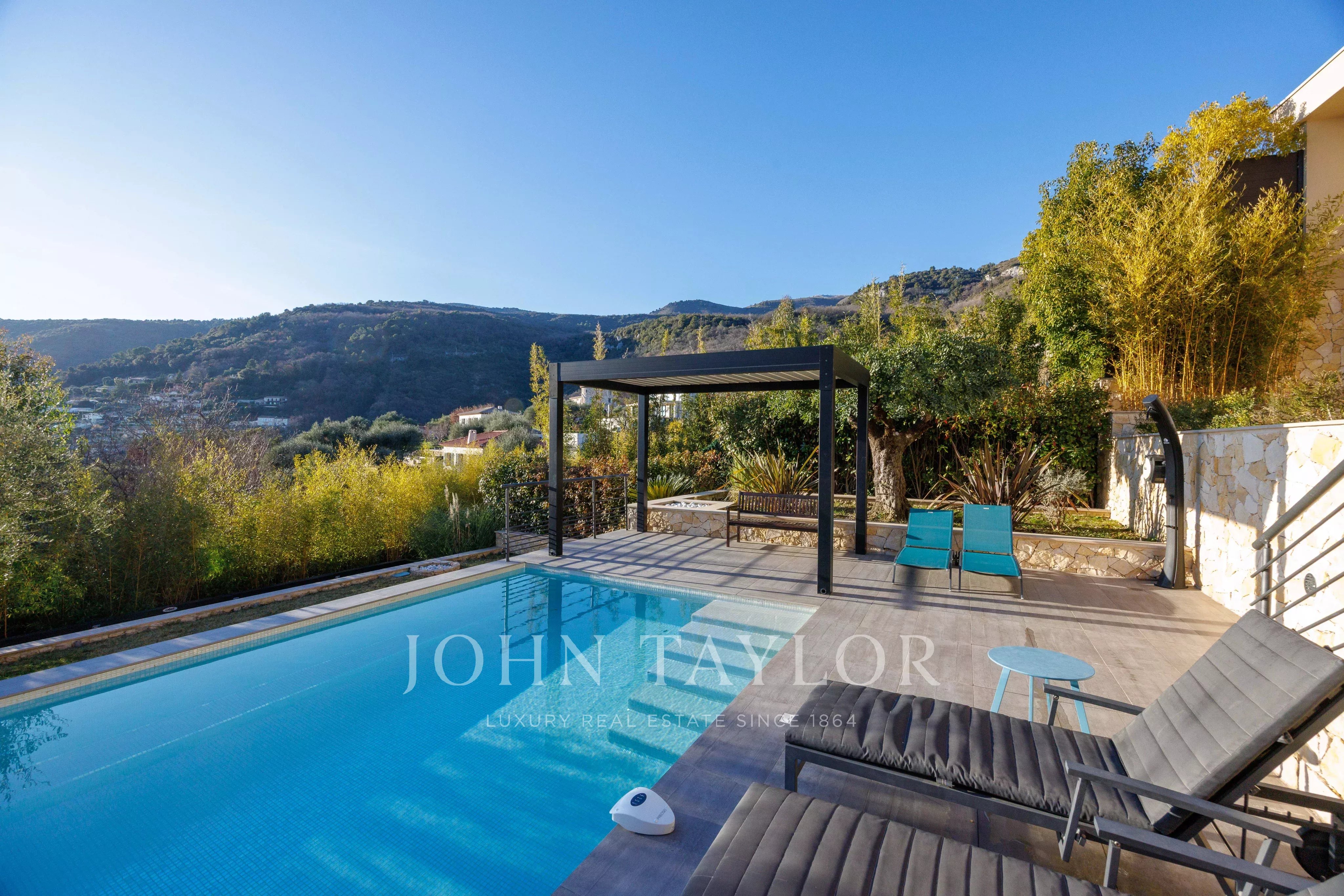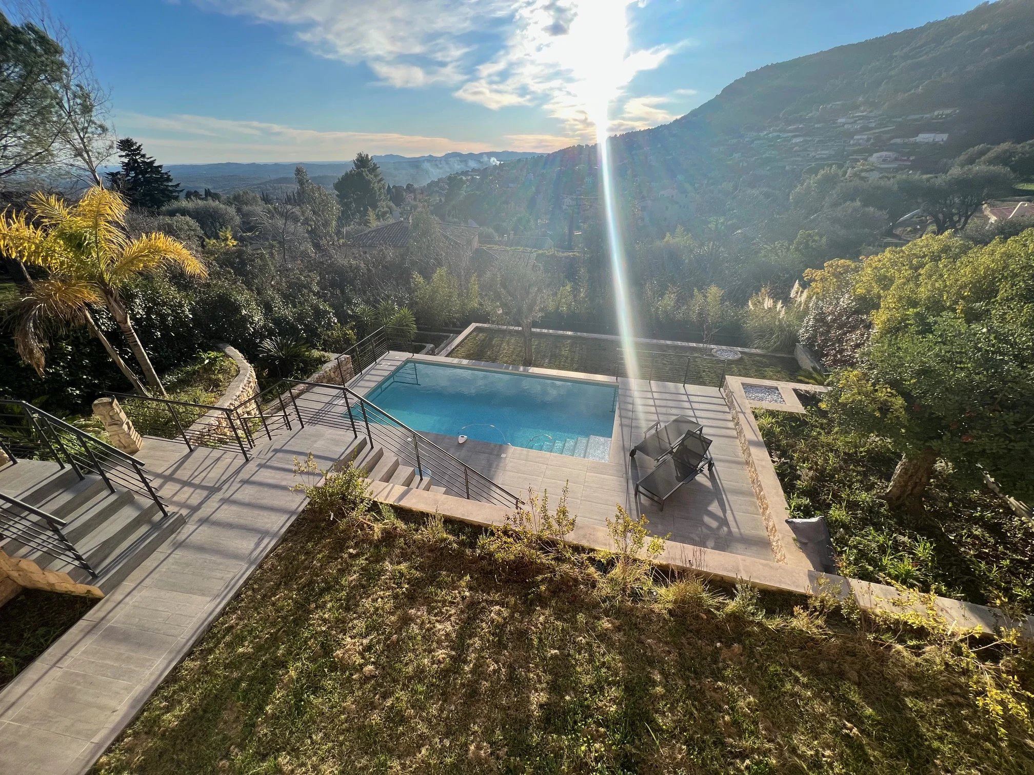 Panoramic villa within walking distance of the village of Tourrettes-sur-Loup, offering stunning views over the village, the mountains and the sea. The property features 4 bedrooms, including a master suite, and a spacious, light-filled living area, all set on a 859 sqm plot with a heated swimming pool.