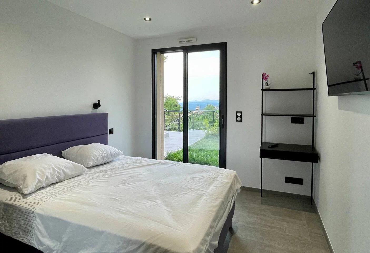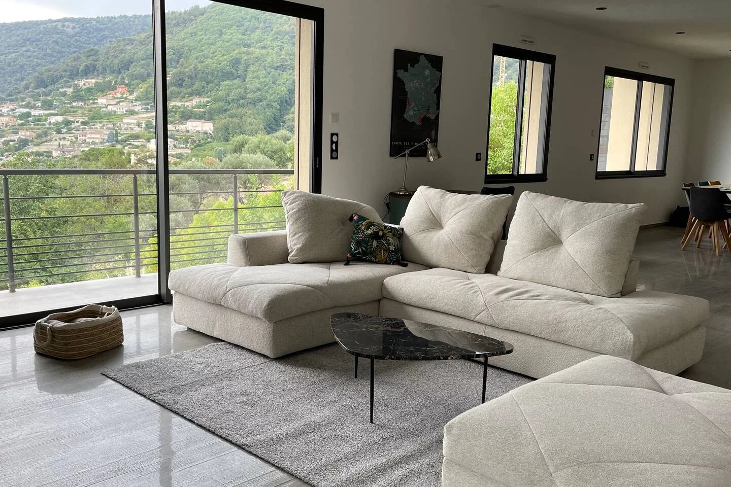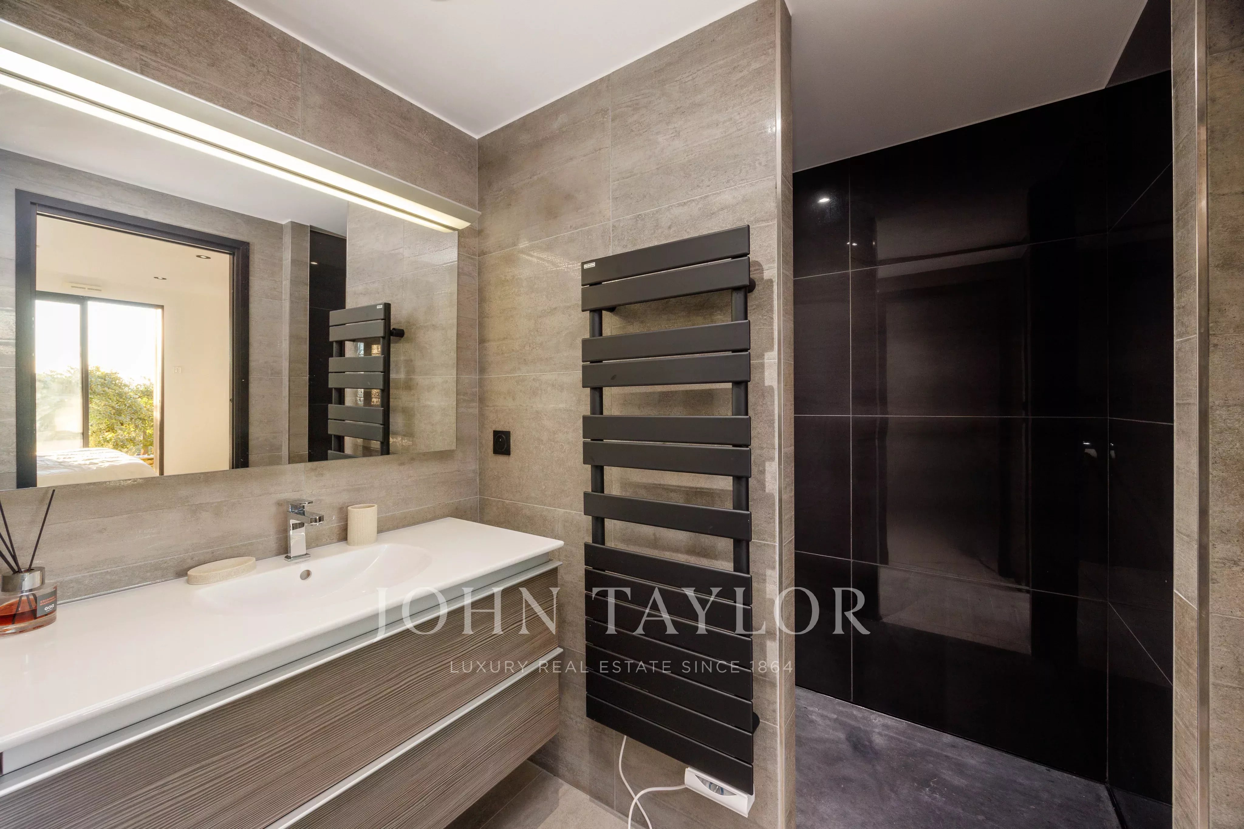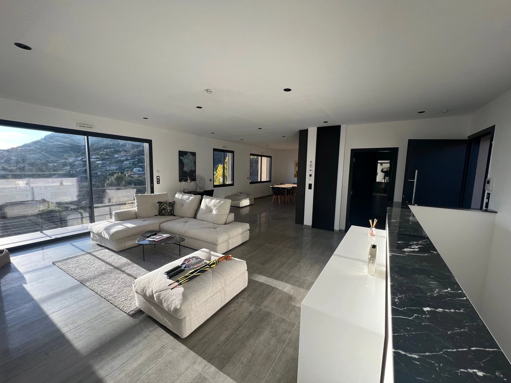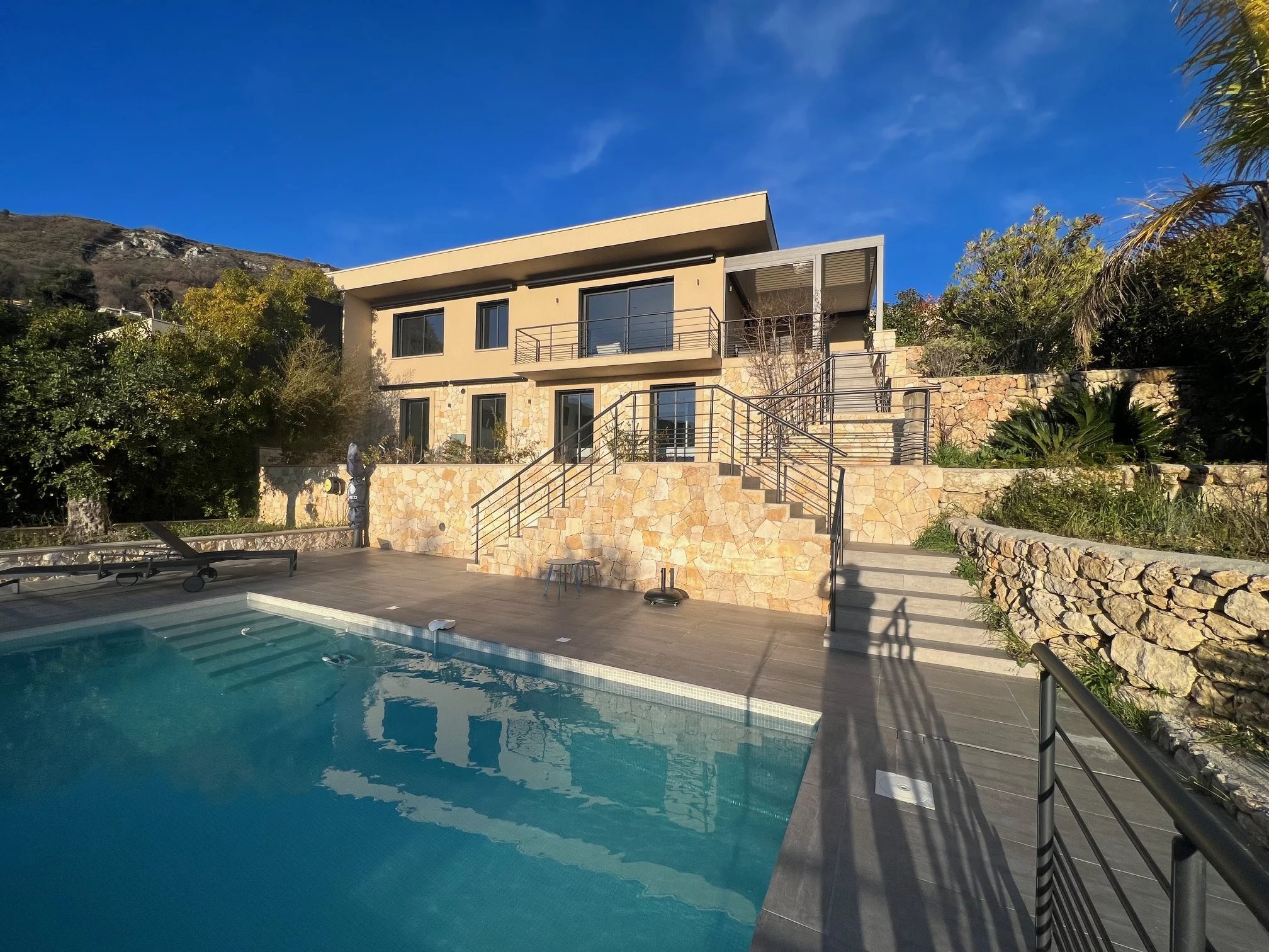 Panoramic villa within walking distance of the village of Tourrettes-sur-Loup, offering stunning views over the village, the mountains and the sea. The property features 4 bedrooms, including a master suite, and a spacious, light-filled living area, all set on a 859 sqm plot with a heated swimming pool.
