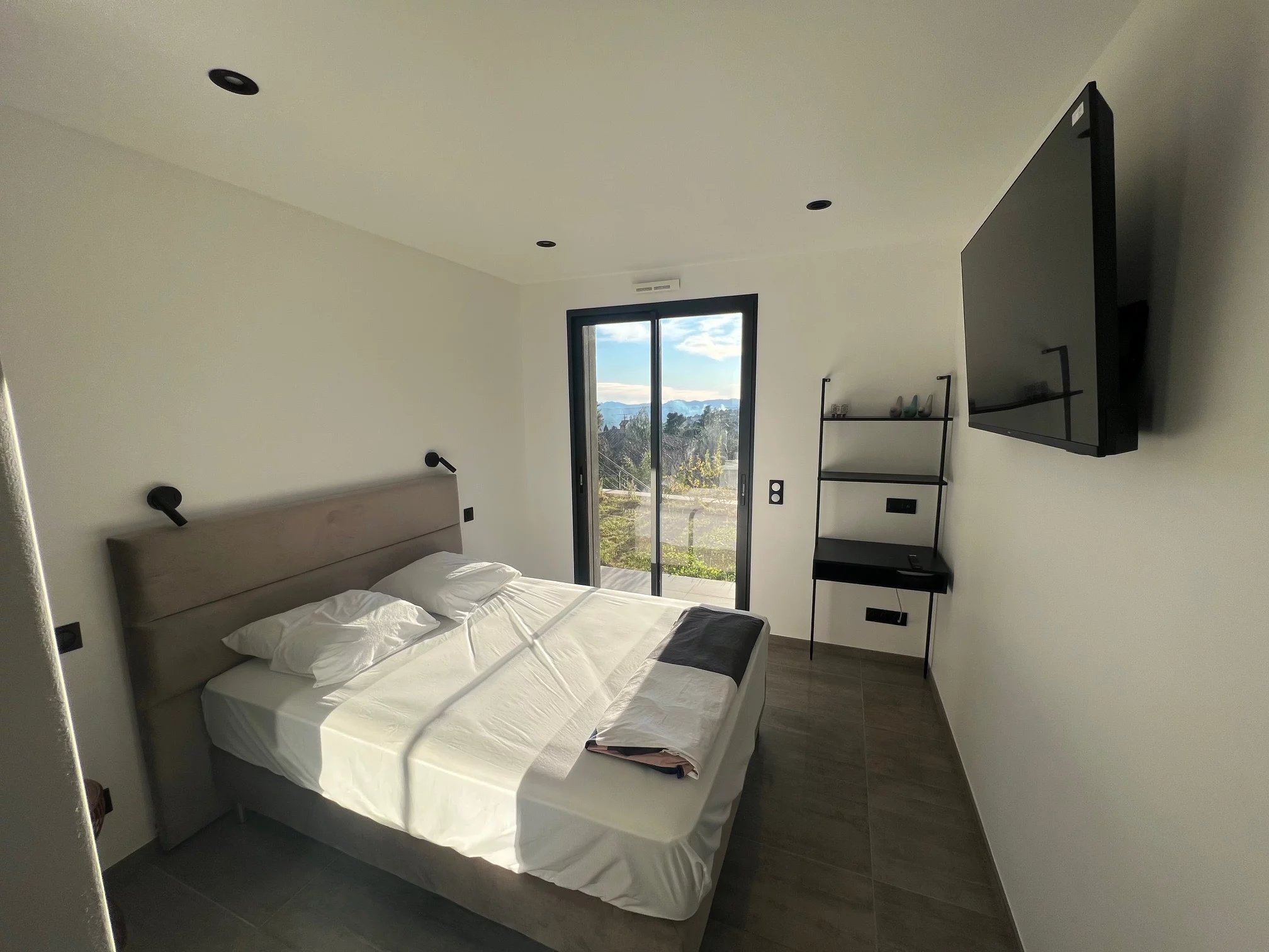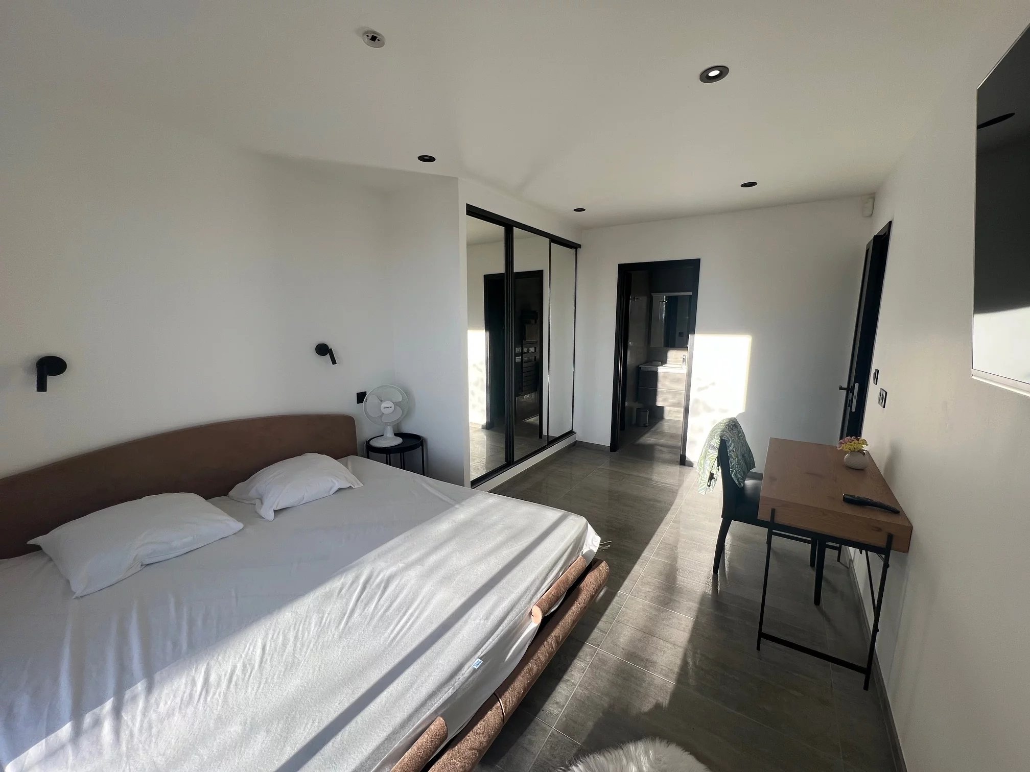On the main level, the villa offers an entrance hall leading to a bright living room with large sliding doors, an open-plan kitchen with dining area, a guest WC, and two terraces, one of which is covered by a bioclimatic pergola.