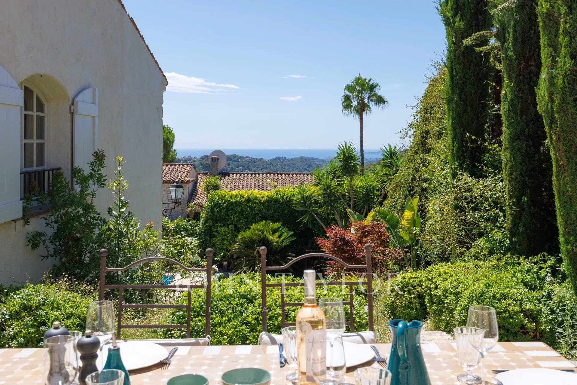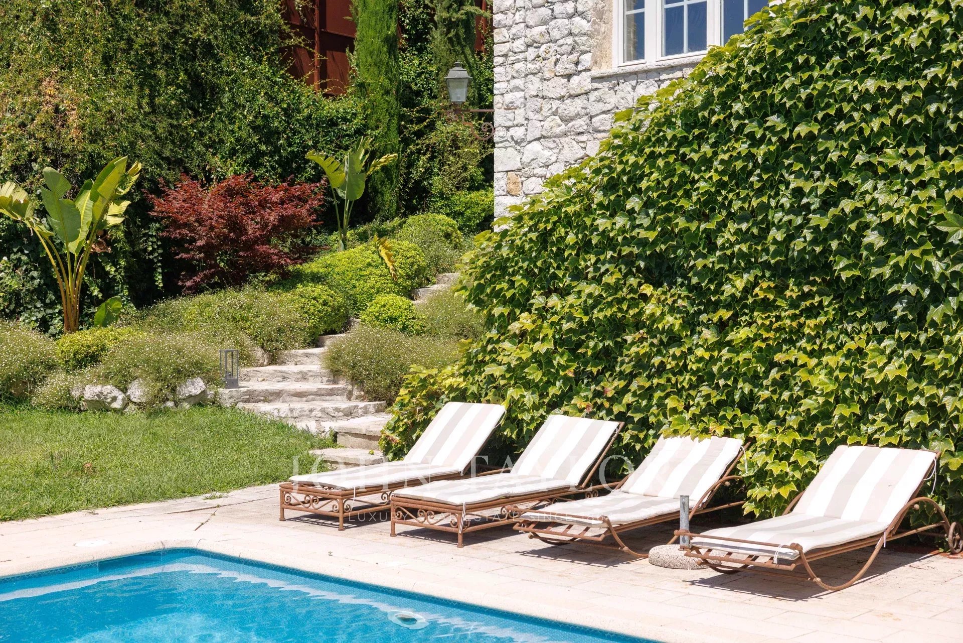 The garden was designed in its entirety by the renowned landscape architect Jean Mus and offers several areas, including a large courtyard with shelter for two vehicles and fountain, a dining area connected to the kitchen with sea views of Cap d'Antibes, the beautiful living room terrace and the pool area with pool house and terrace, ideal for relaxing and playing with friends and family!
