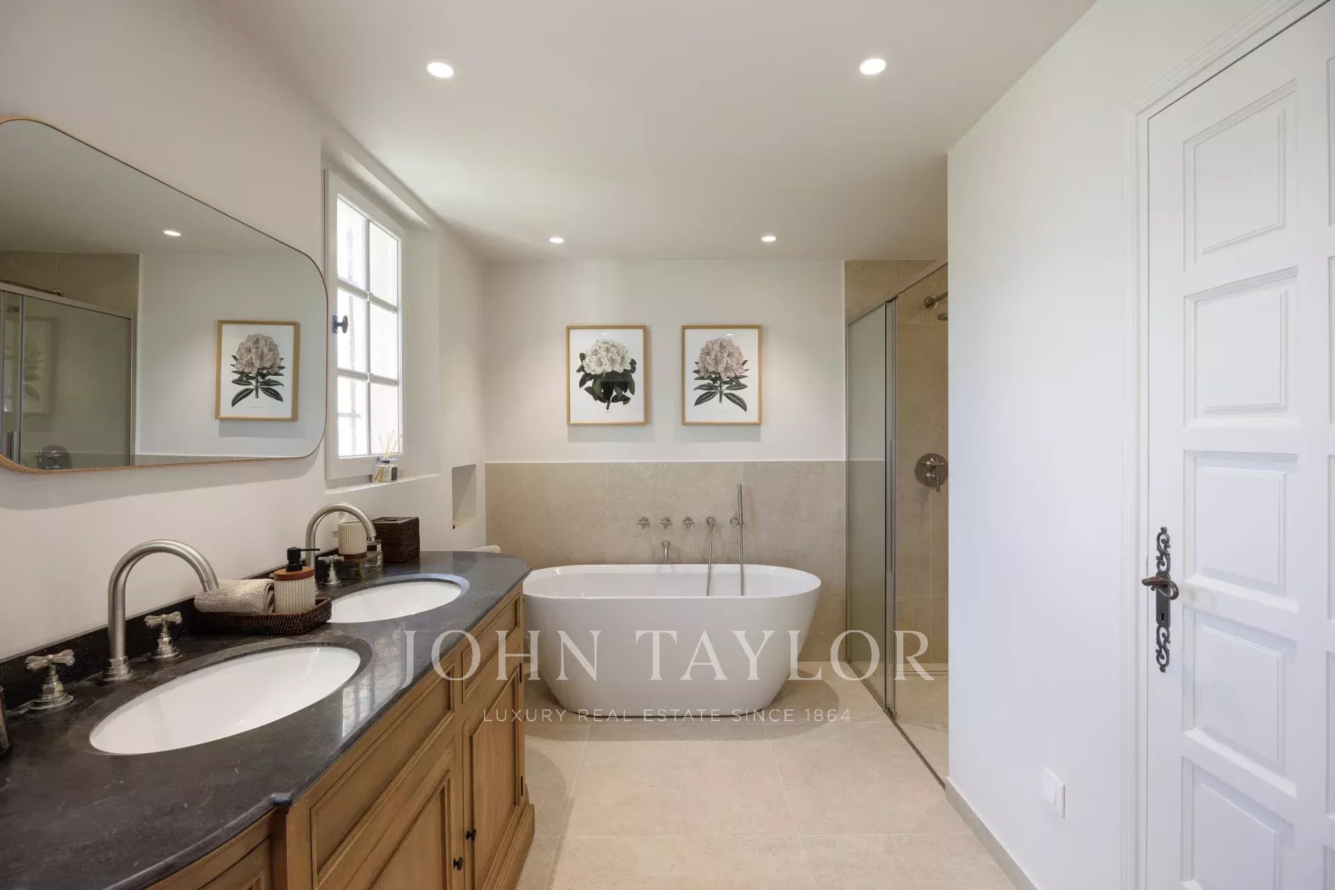 The villa features a true entrance hall, a generous, sunlit living room with fireplace and dining area, a beautiful veranda and a large kitchen with utility/laundry room. The Master Suite is just a few steps up, with a large bedroom, bathroom/shower, dressing room and office in the turret. The lower floors include 3 bedrooms with en suite bath/shower rooms, a second office, a yoga room, a billiard room with wine cellar and access to the pool house with kitchen totaling almost 30 m².