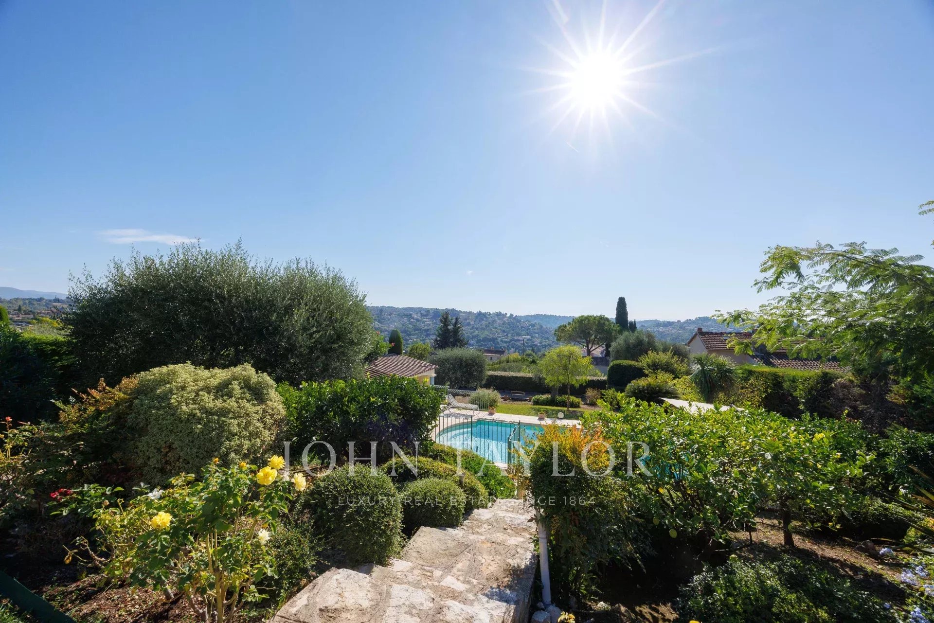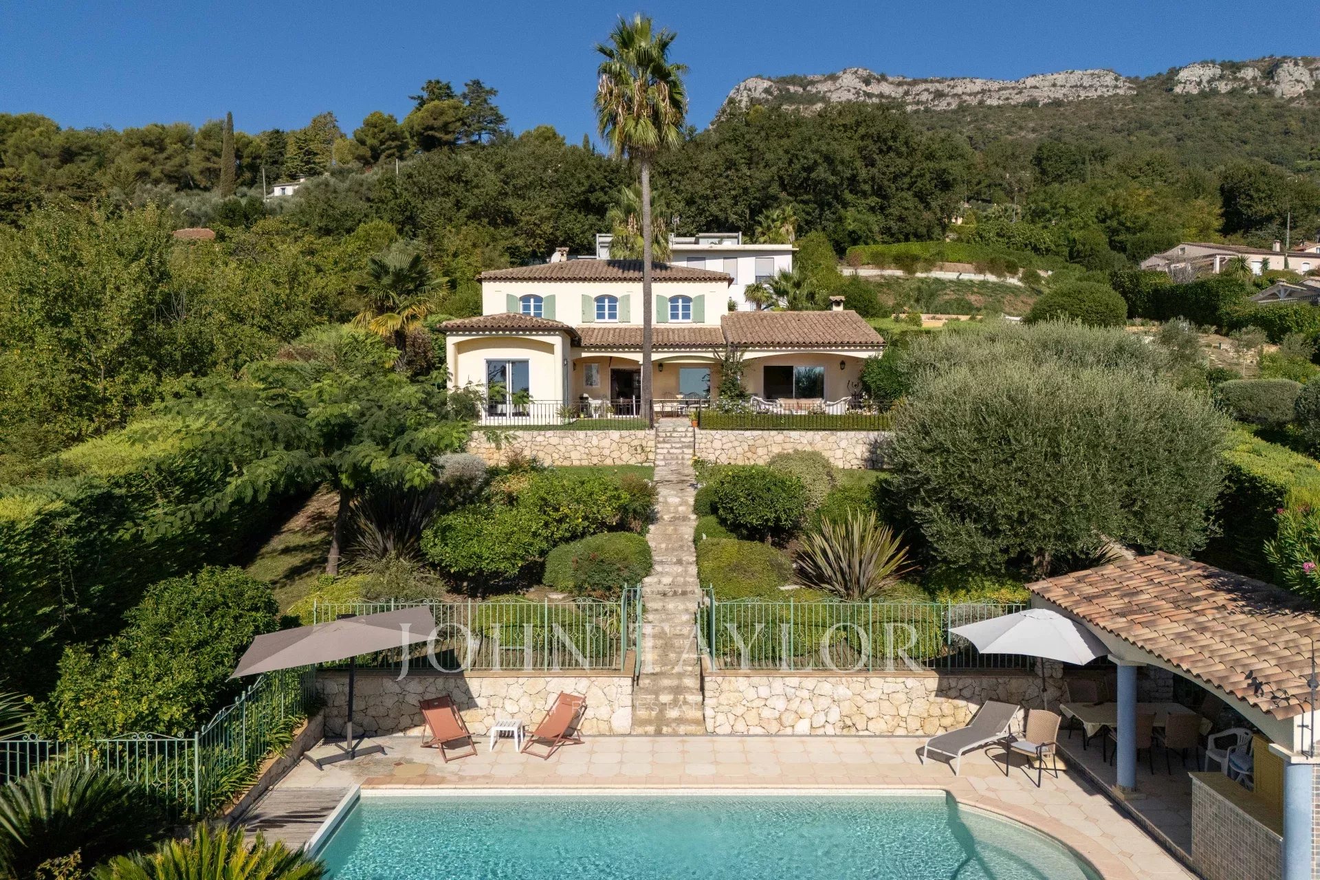 Located in a gated estate within a quiet and residential neighborhood, this charming villa combines absolute tranquility with an exceptional setting. It offers complete privacy and panoramic views of the surrounding hills stretching all the way to the sea. Set on a 2,036 sq.m southeast-facing plot, the house of approximately 175 sq.m of living space features four bedrooms, three bathrooms, an office, a laundry room, a garage, a covered parking area, and a swimming pool.