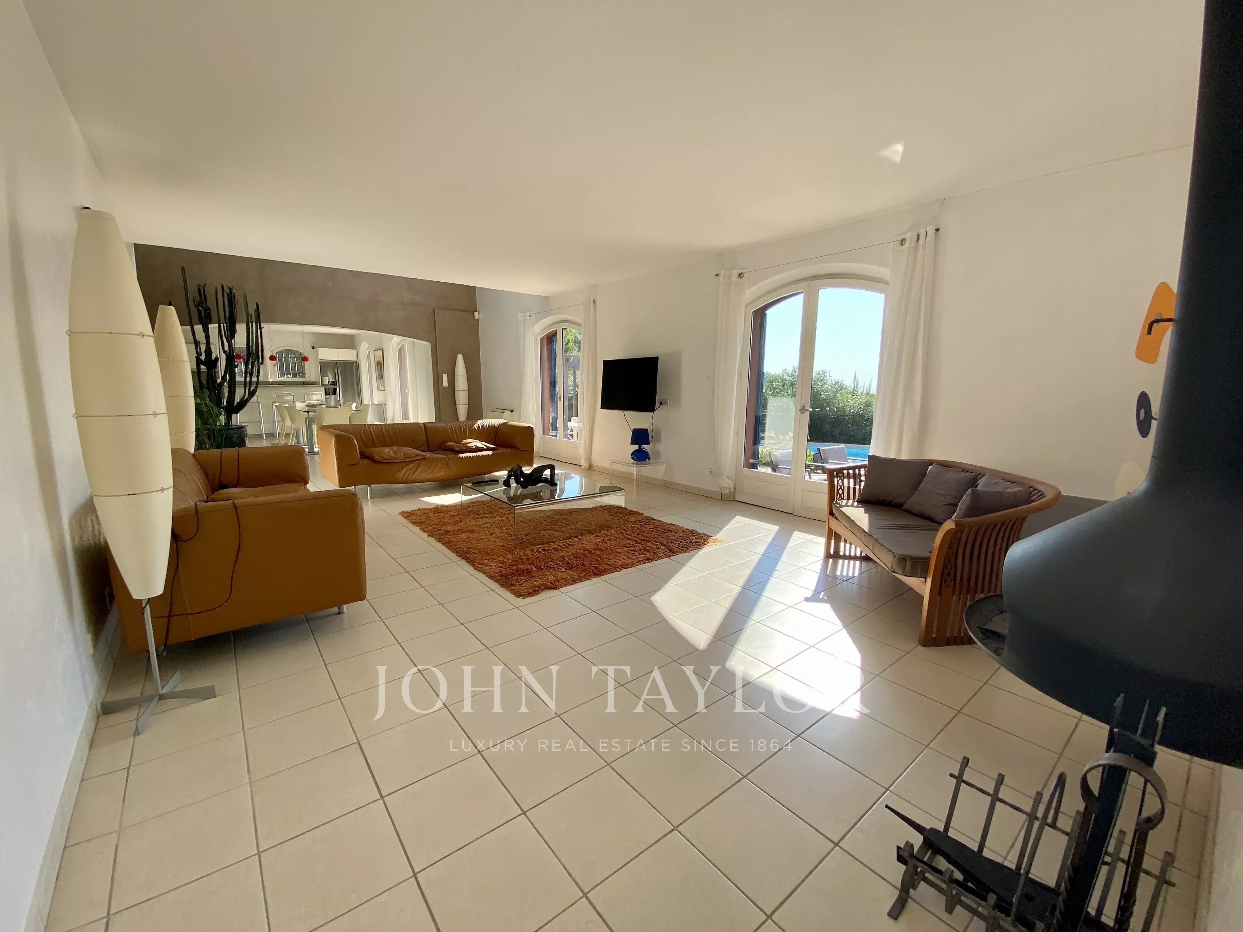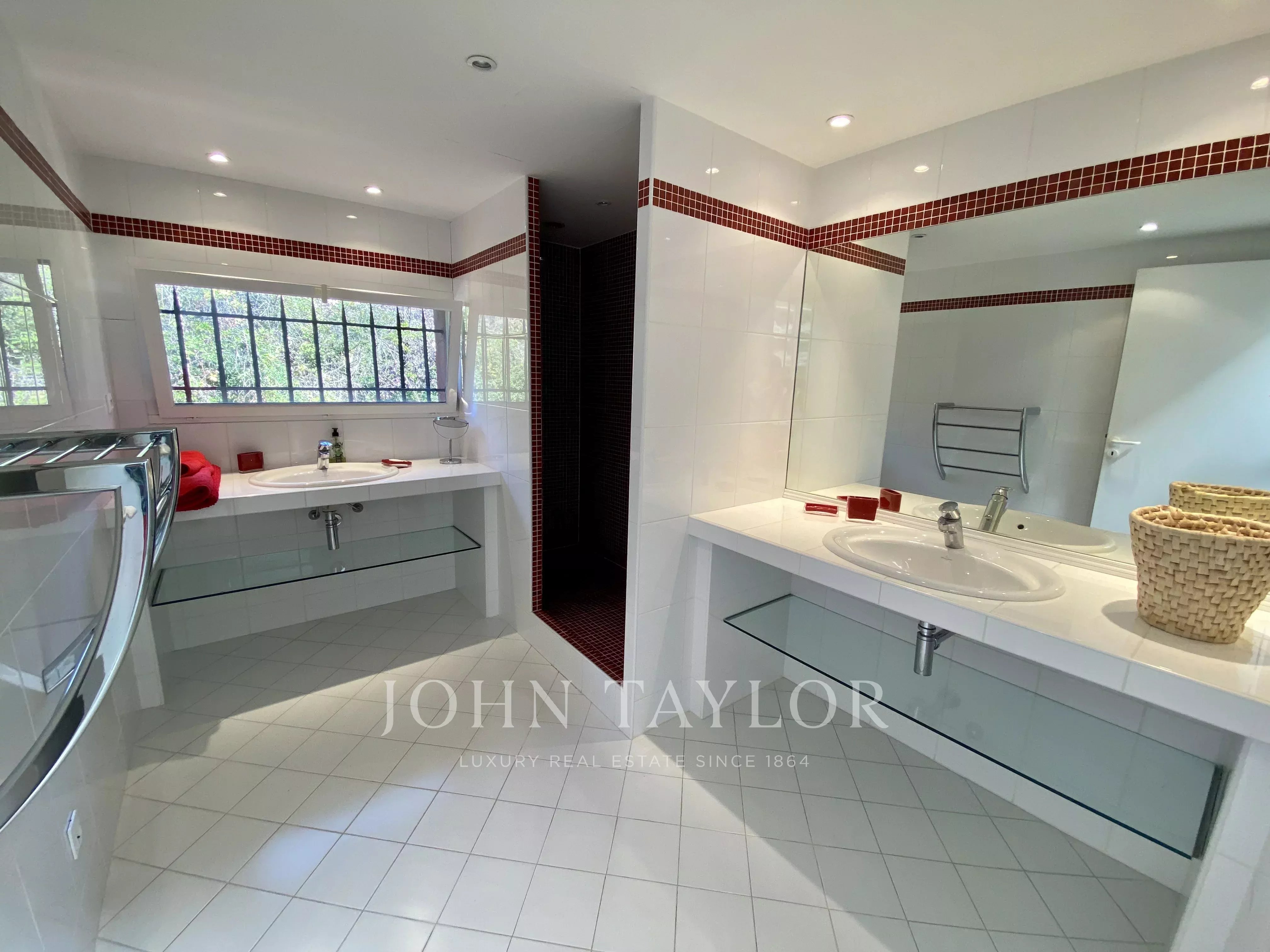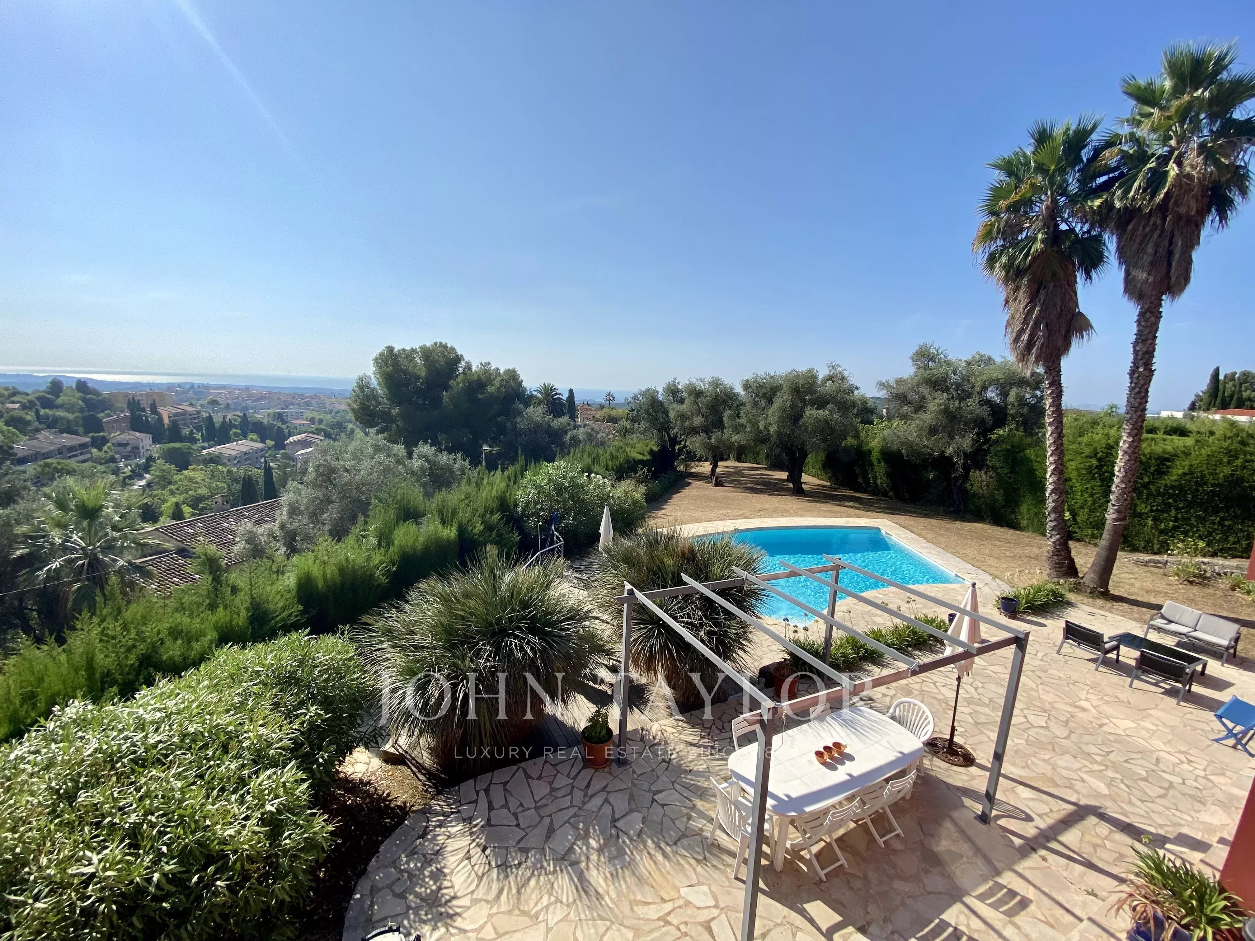 Situated just a few hundred meters from Vence town center and boasting panoramic views over the Baou to the sea, this modern property of approx. 230 m2 benefits from a beautiful flat garden of approx. 1,700 m2 with swimming pool and garage.