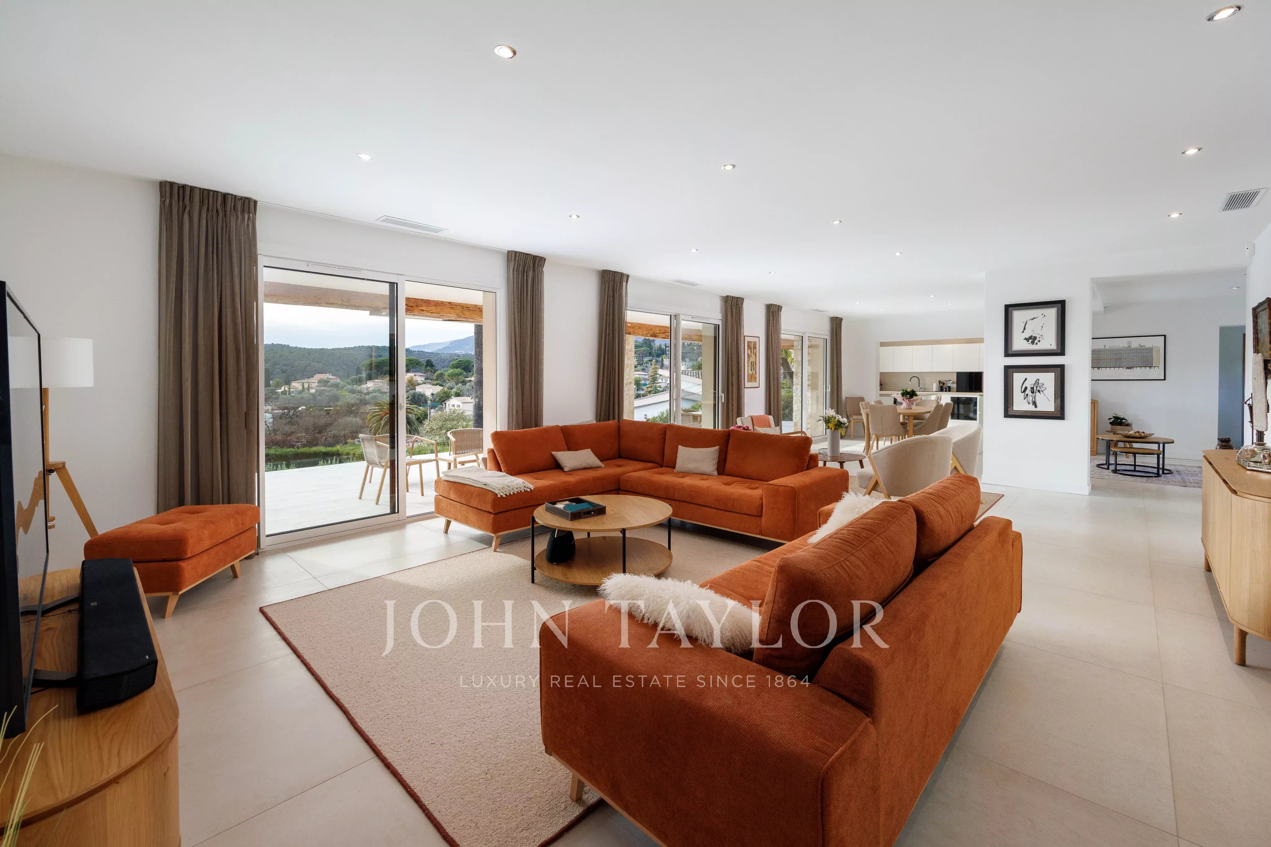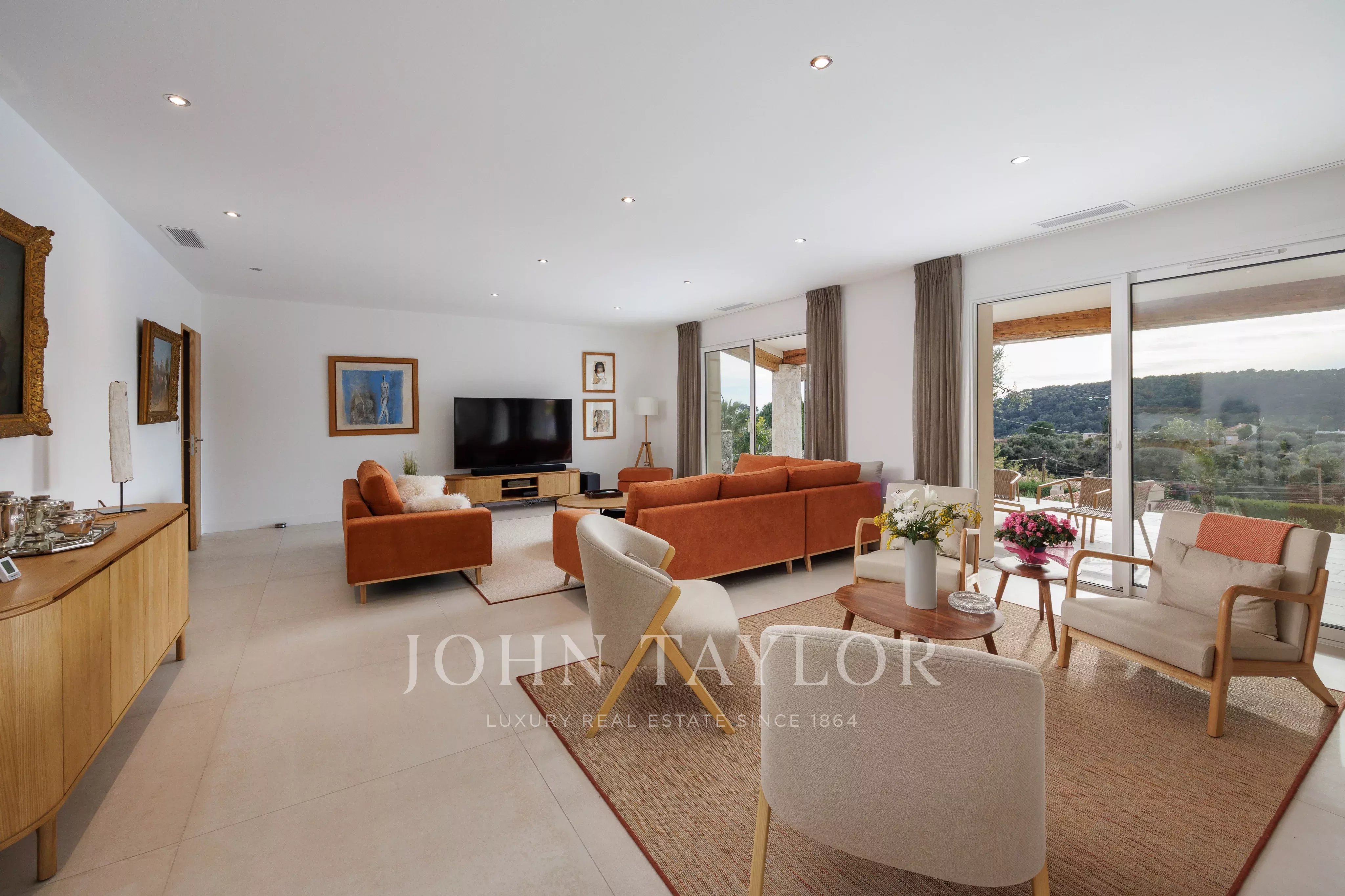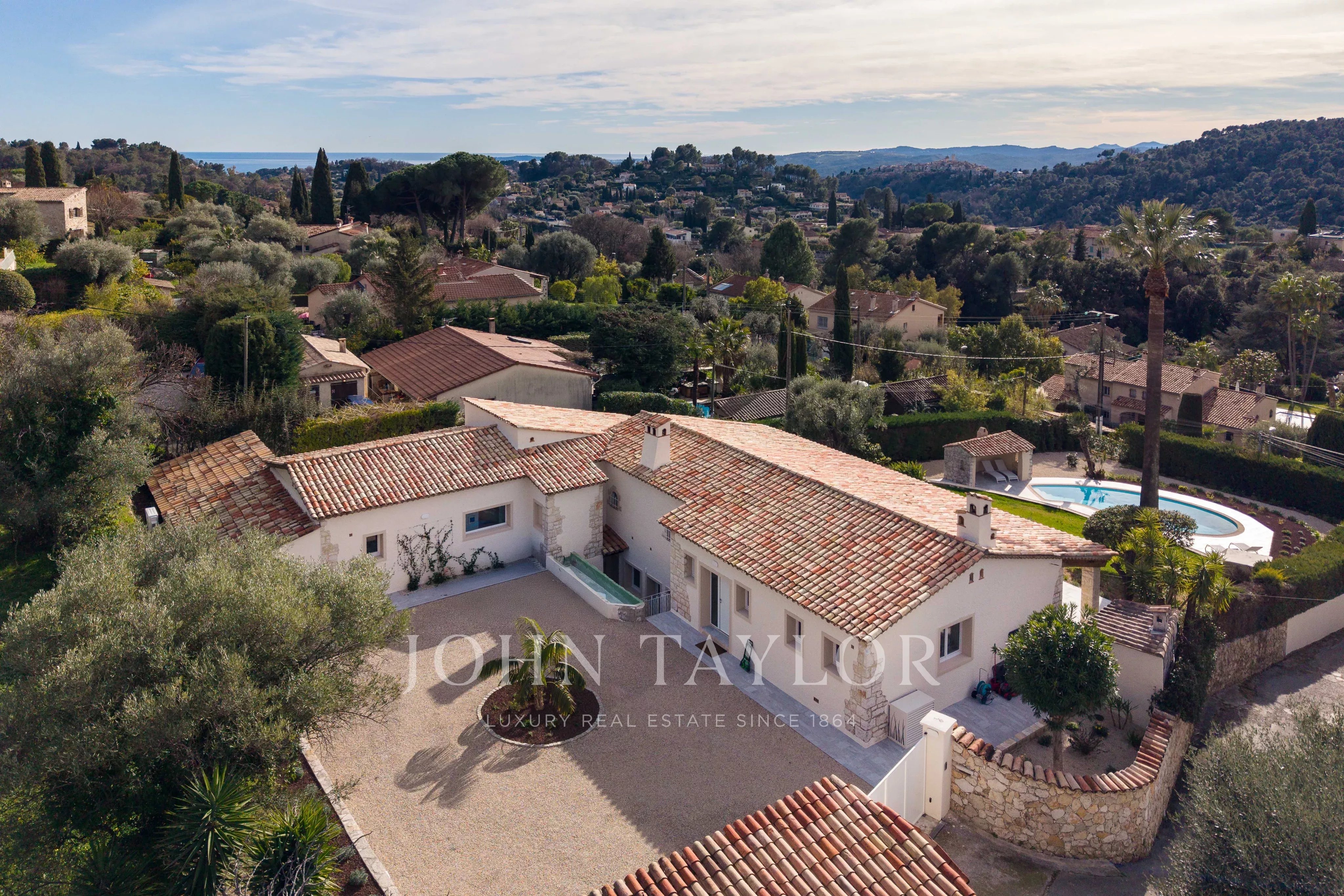 Completely renovated single-storey house, located in a quiet residential area with unobstructed panoramic views over the village of Saint-Paul-de-Vence, this property of approx. 281 m² is set in grounds of approx. 2,120 m². It comprises six bedrooms, including an independent 3-room apartment, a swimming pool and a carport.