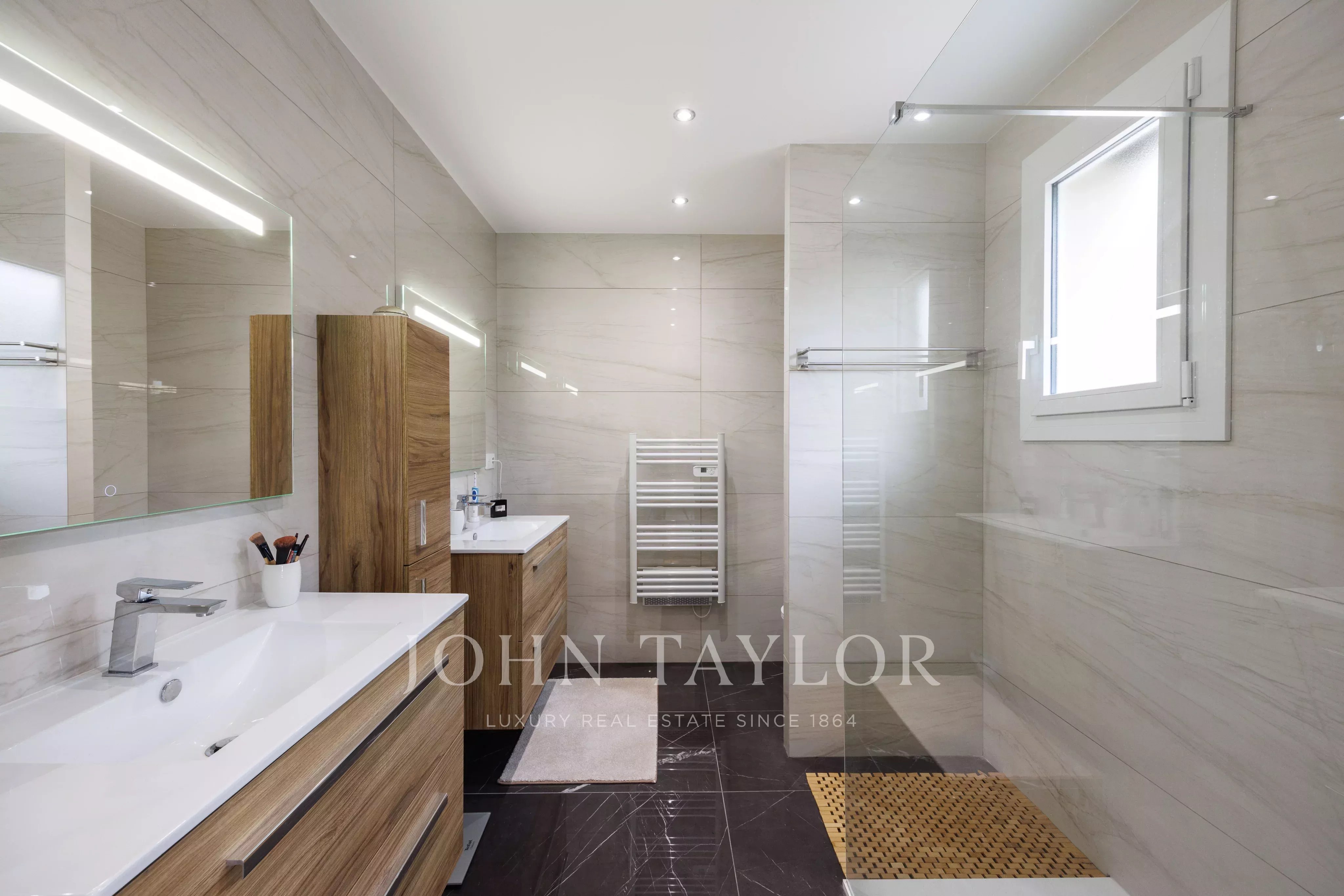An independent apartment of approximately. 70 sq.m on the lower level completes the ensemble. It features a living room with open kitchen, two en suite bedrooms with shower rooms and WCs, and a storage area. The entire property benefits from reversible air conditioning.