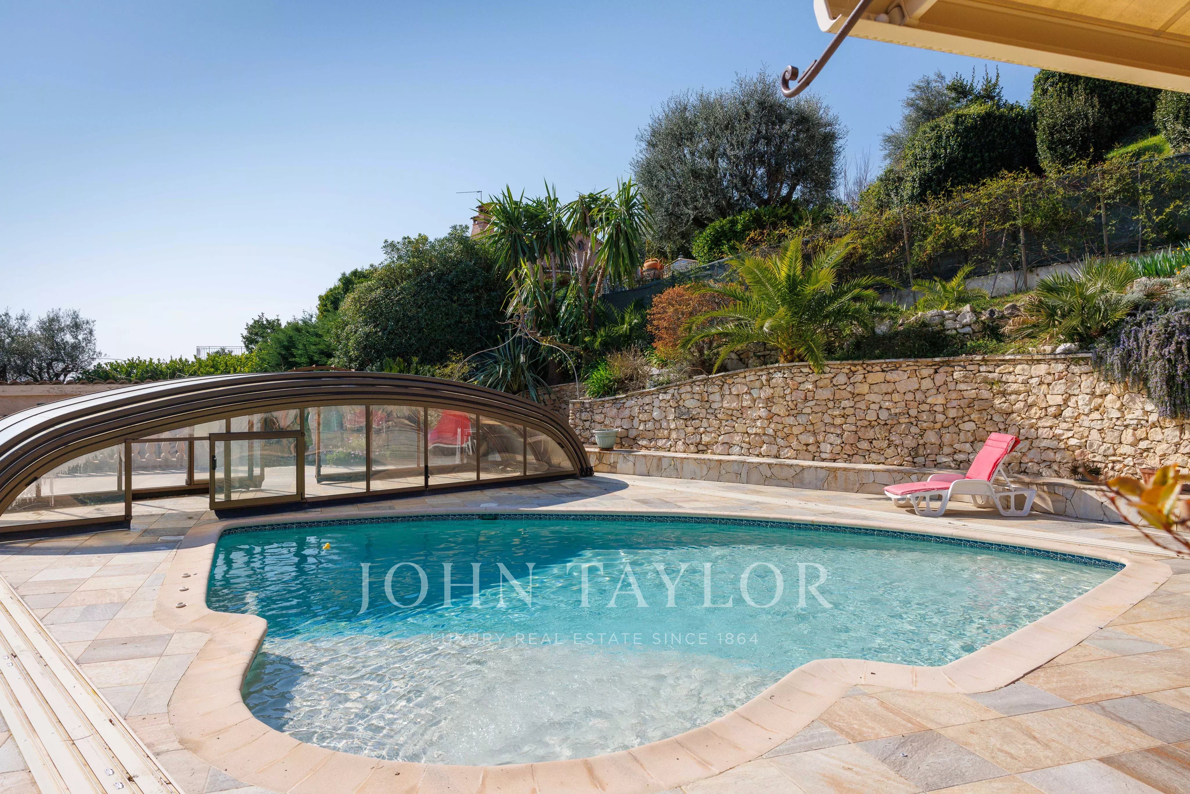 Outside, the pool and its large deck invite relaxation in a sunny setting, extended by a carefully landscaped garden with an unobstructed view of the hills and the sea.