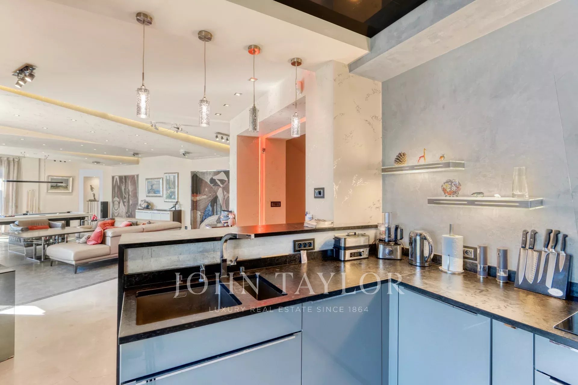 - Living room and open kitchen;