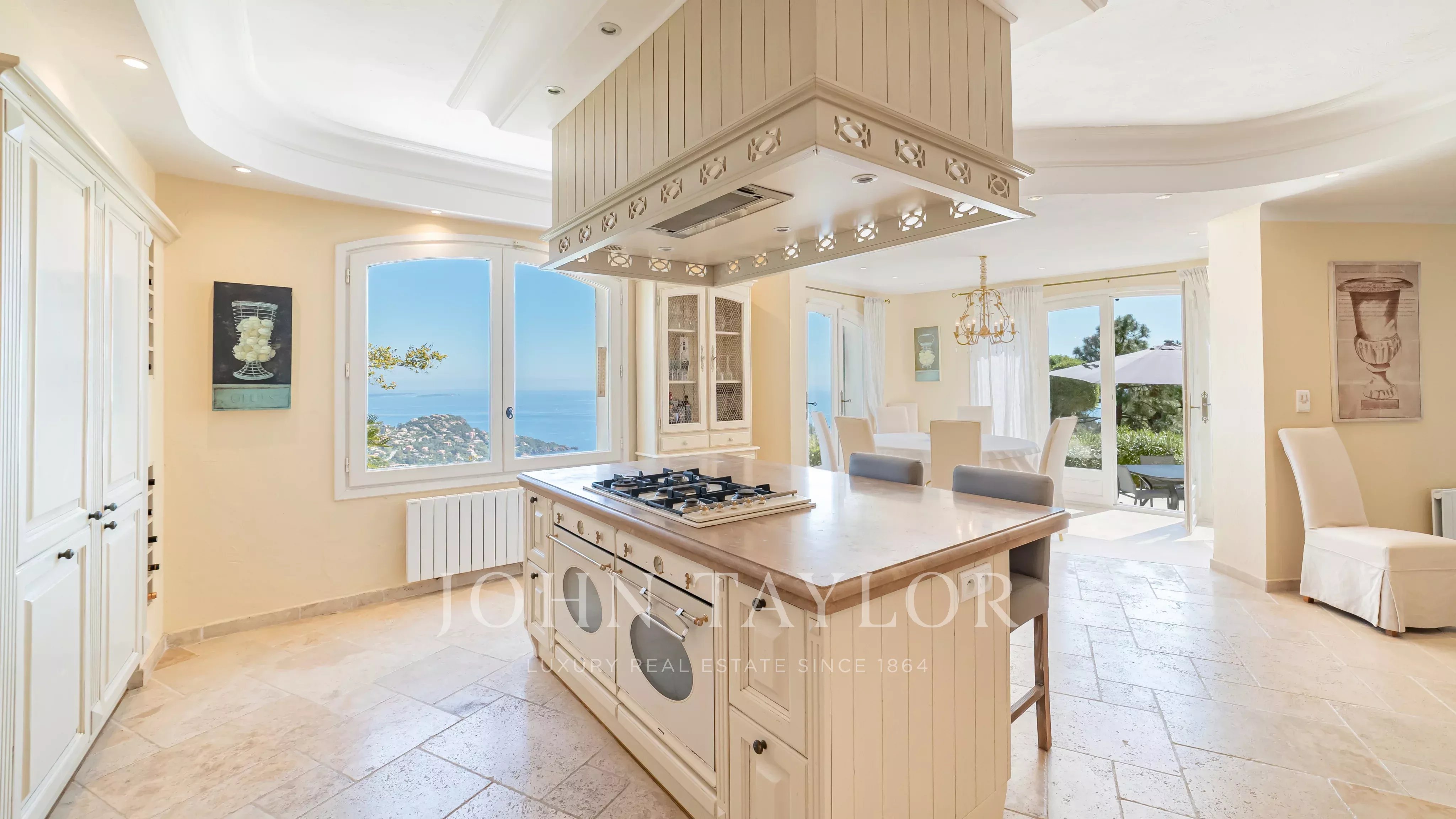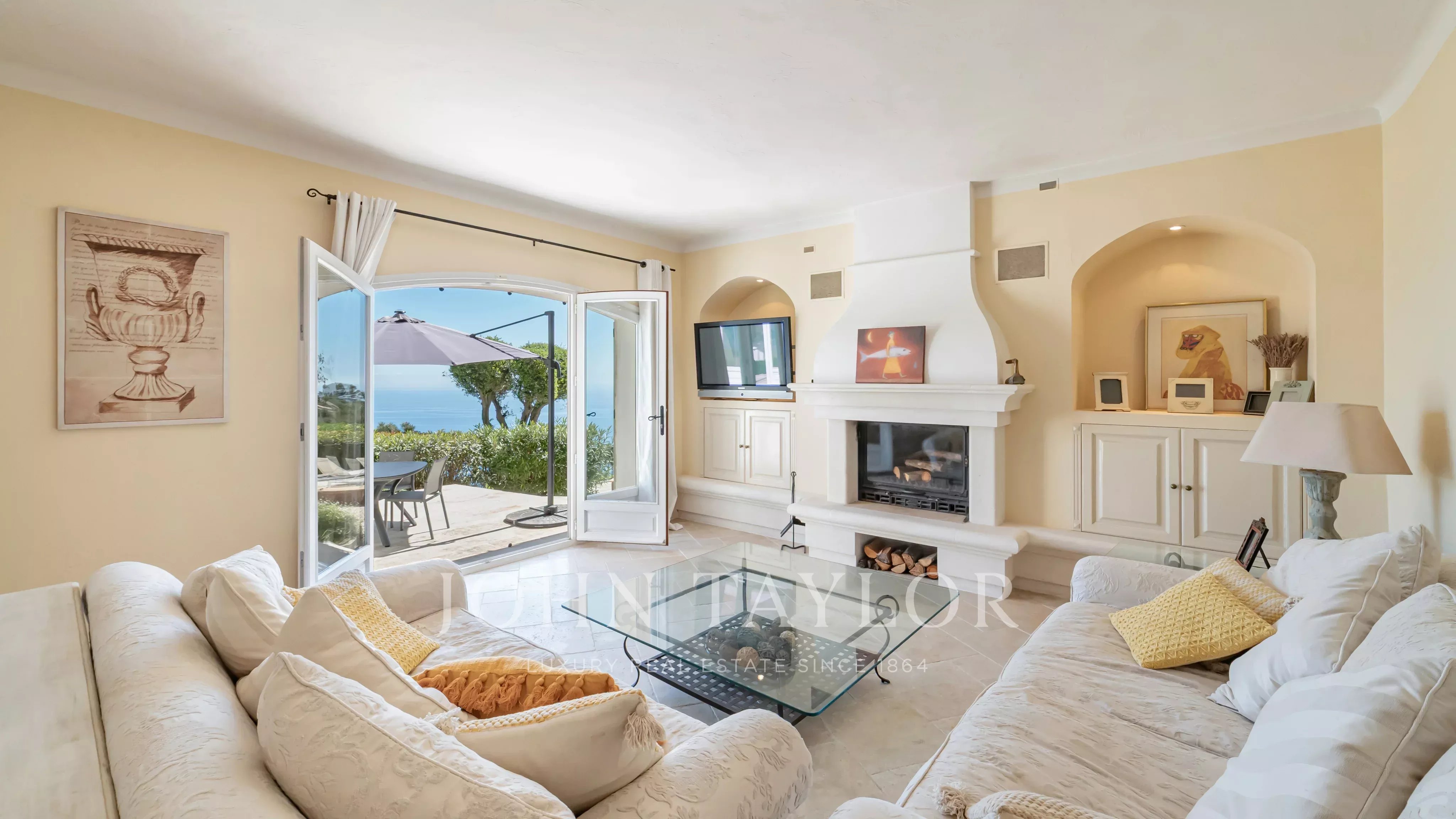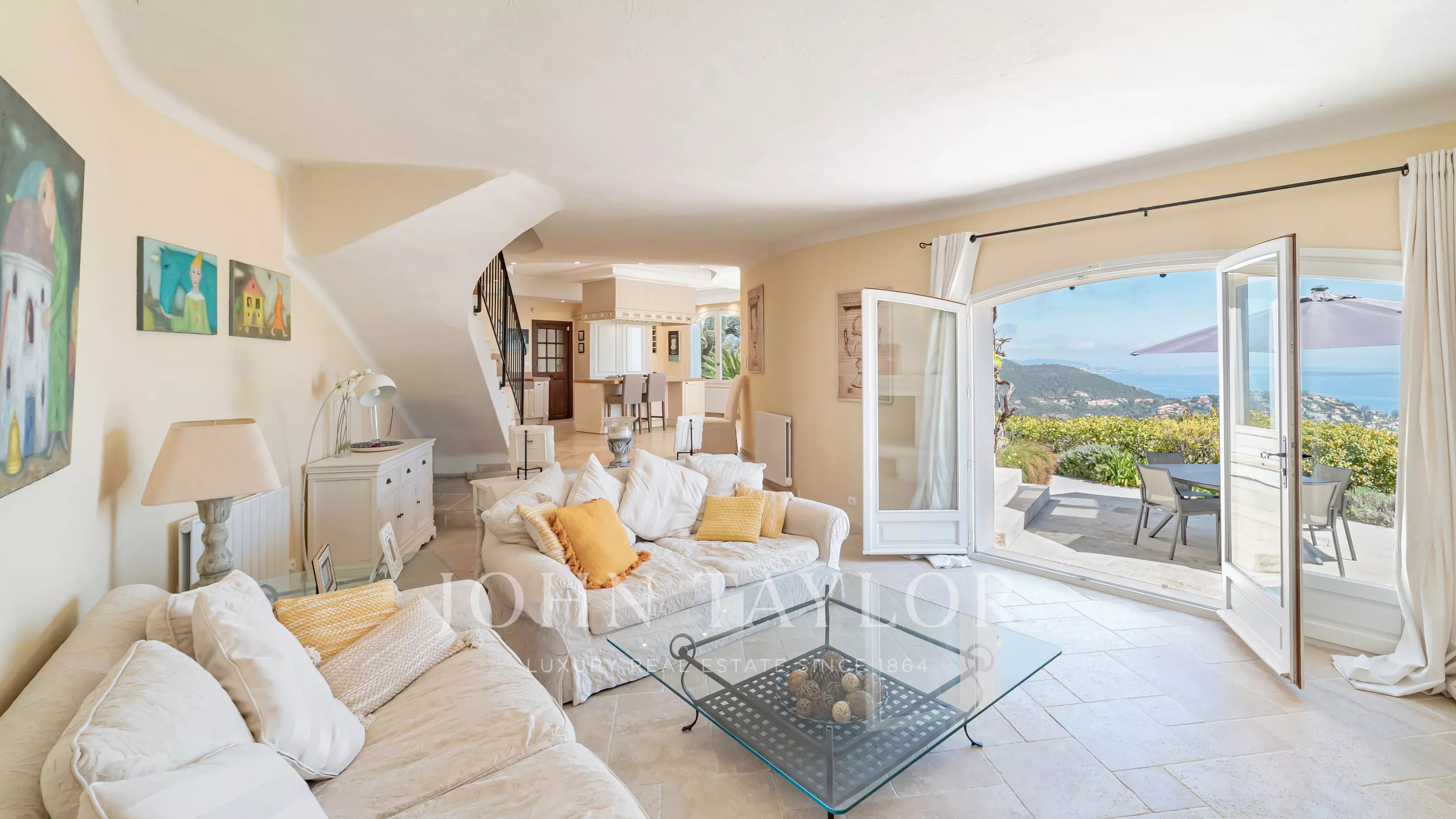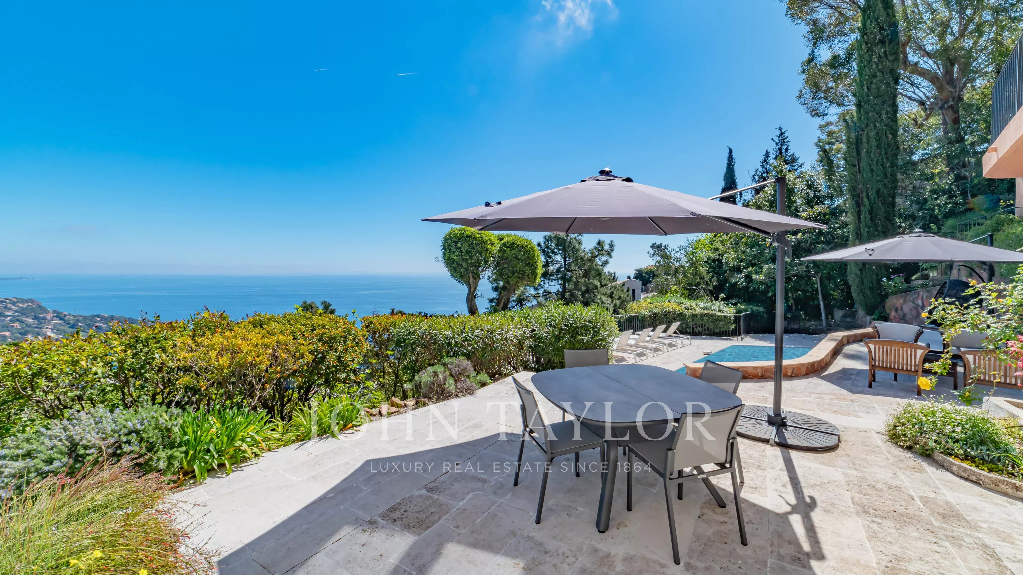 Generous terraces extend the interior spaces and are complemented by a swimming pool overlooking the Mediterranean.
