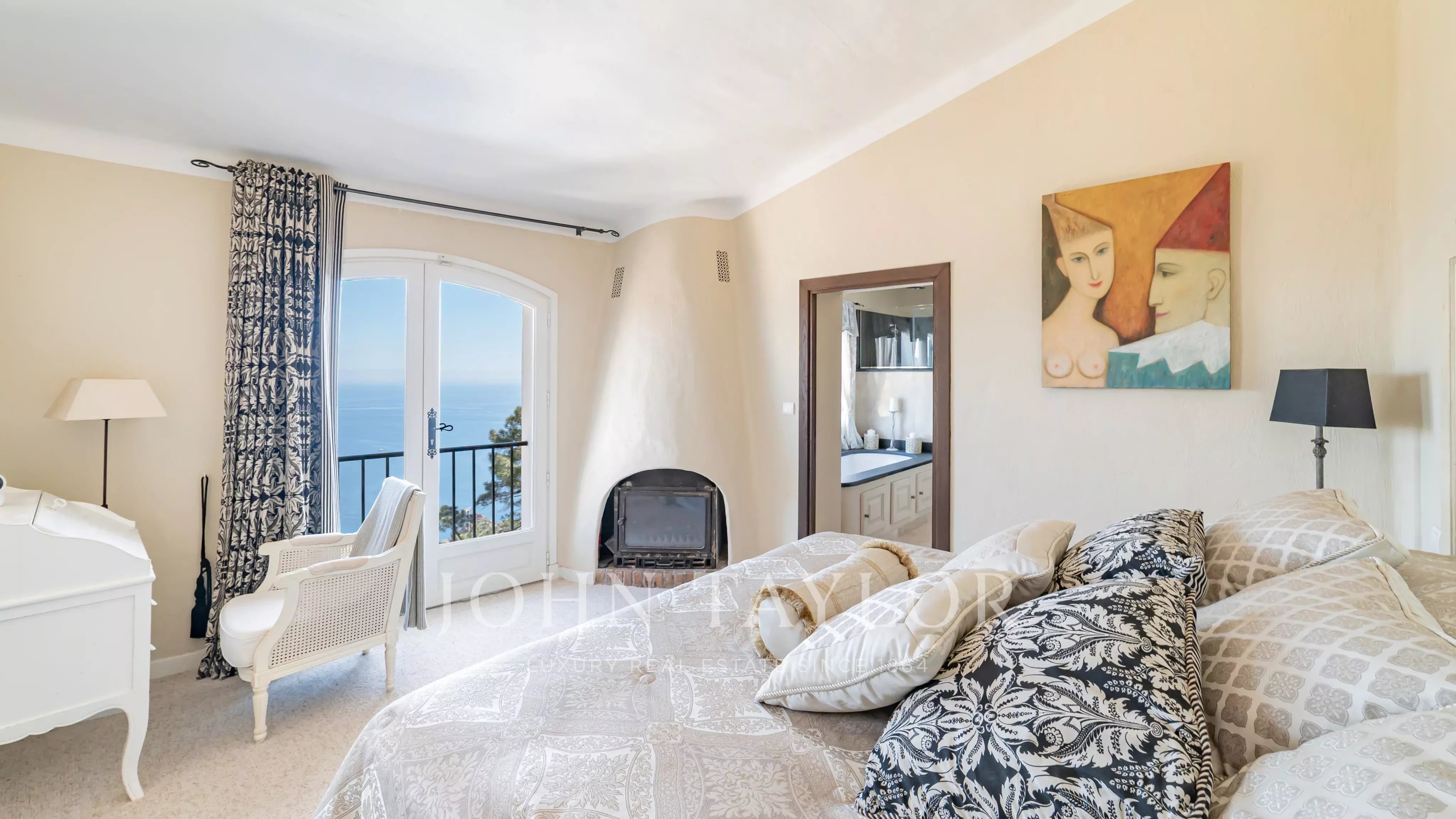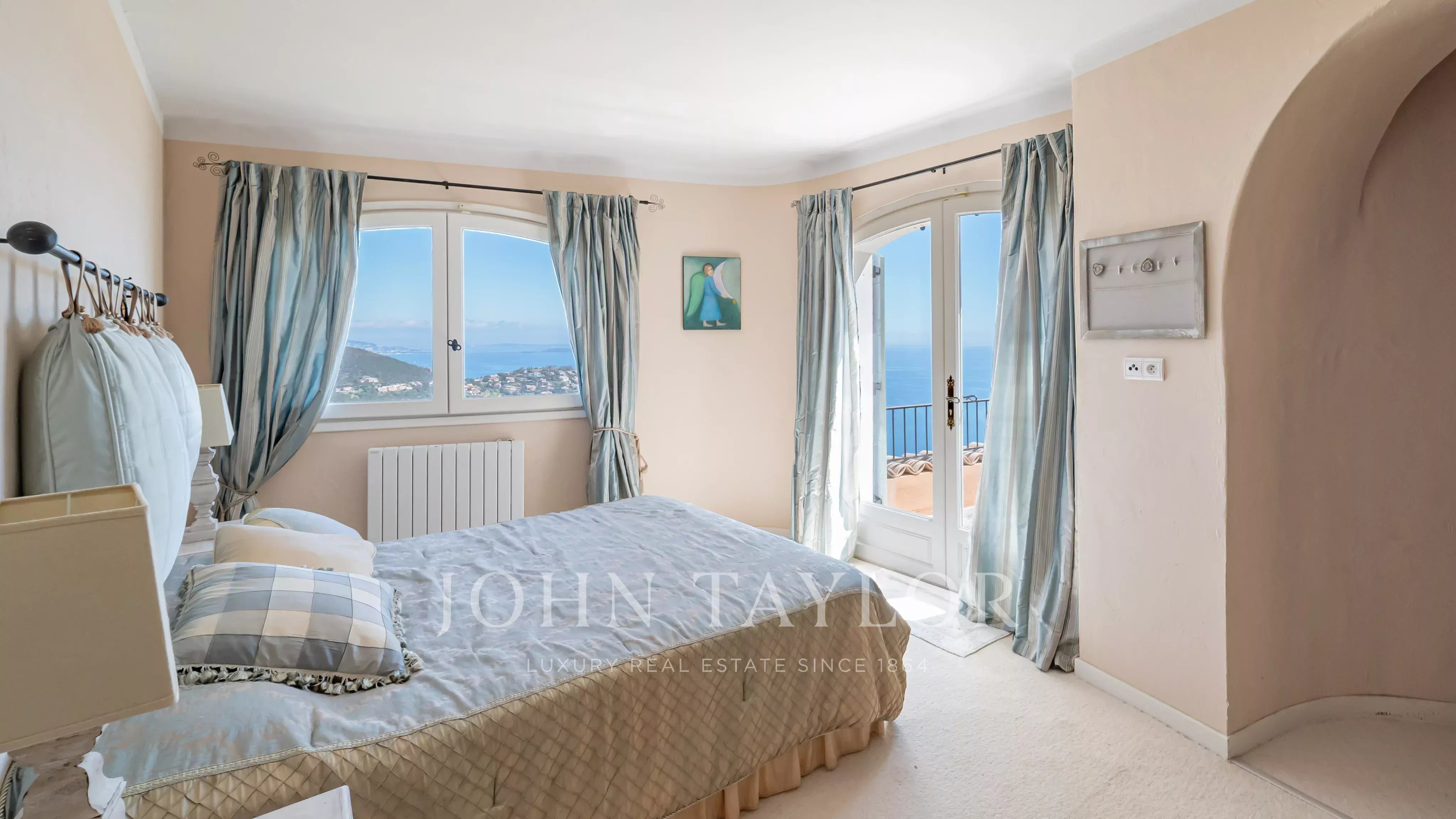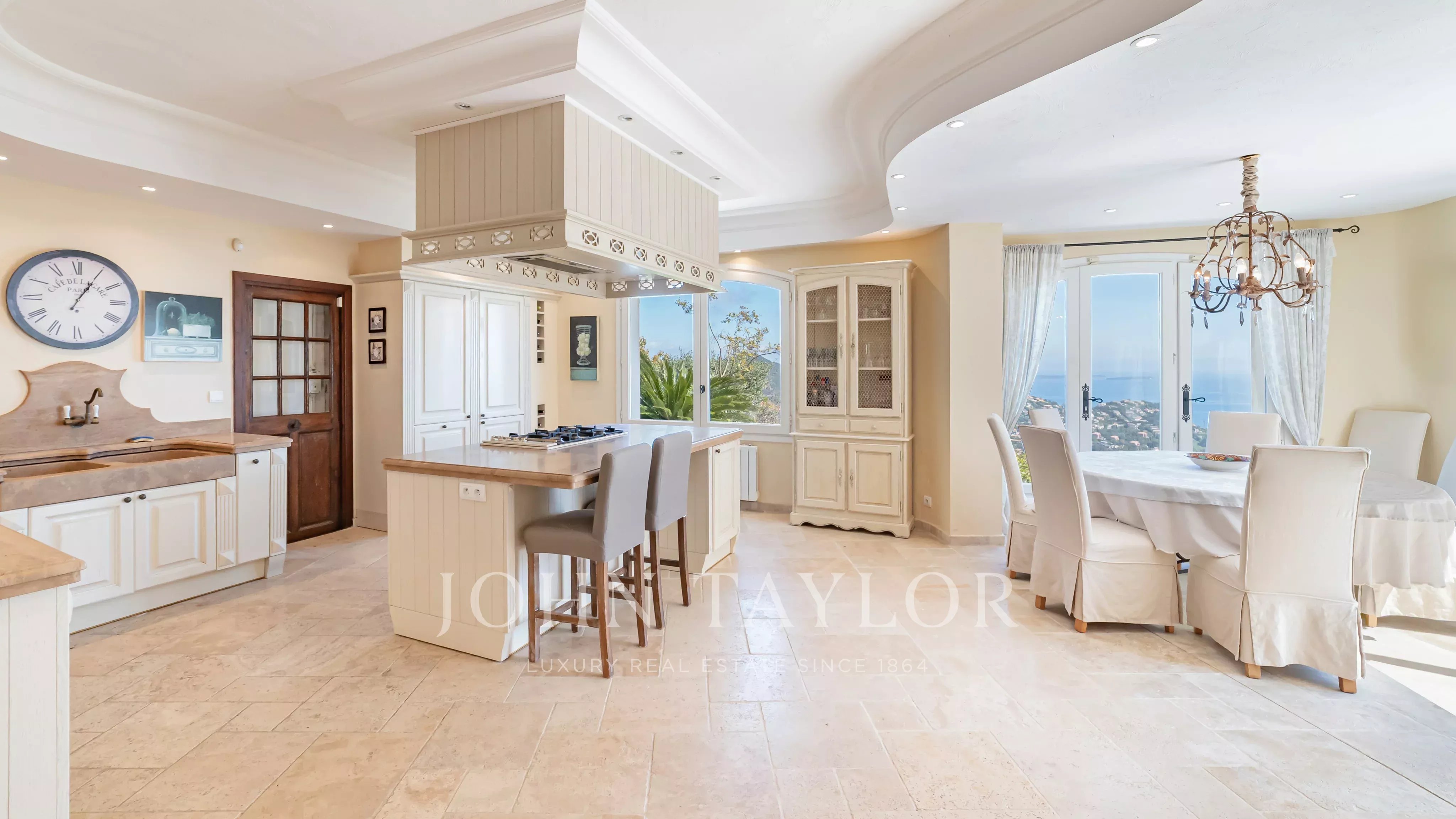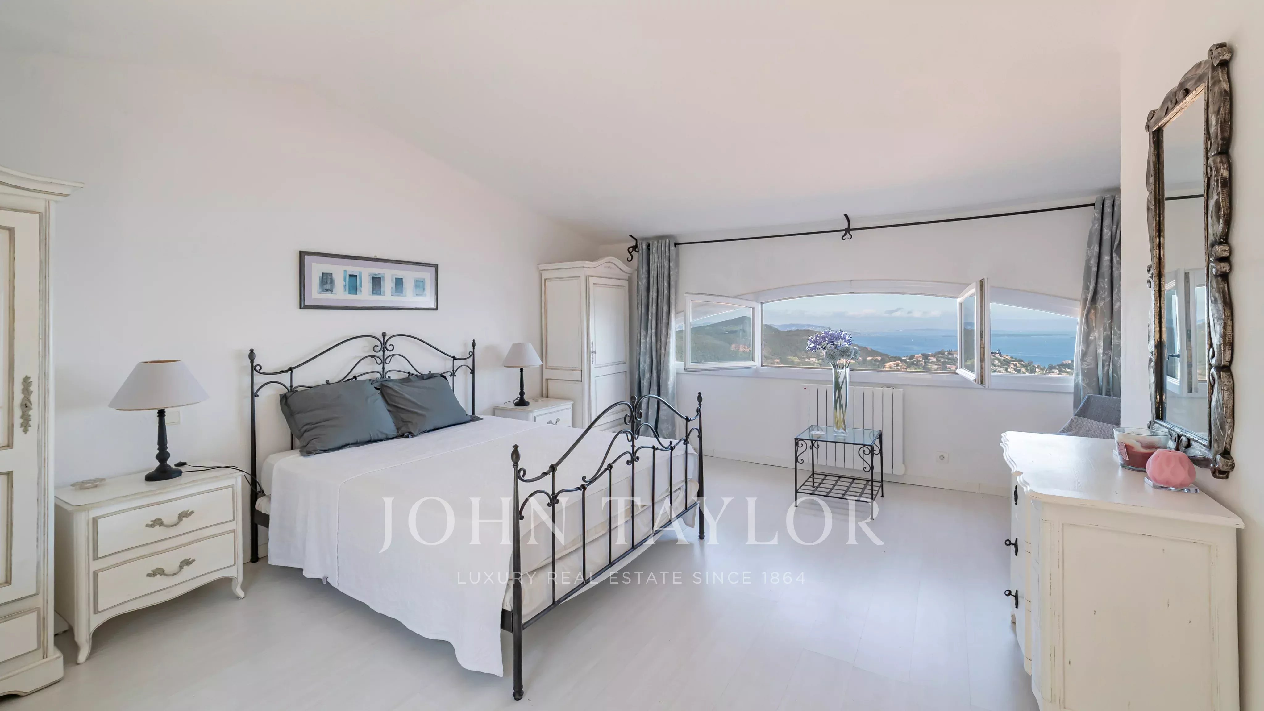 Generous terraces extend the interior spaces and are complemented by a swimming pool overlooking the Mediterranean.