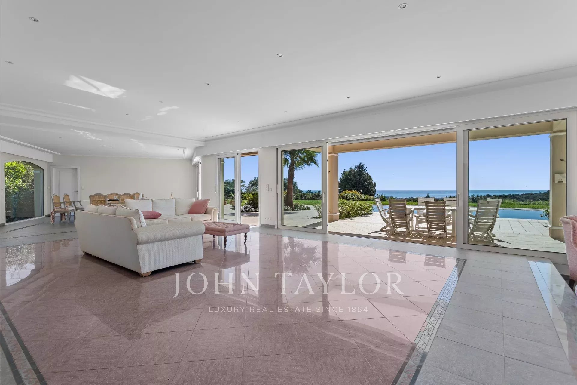 The superb 4,864 square metre flat garden features a heated infinity pool, providing an idyllic setting.