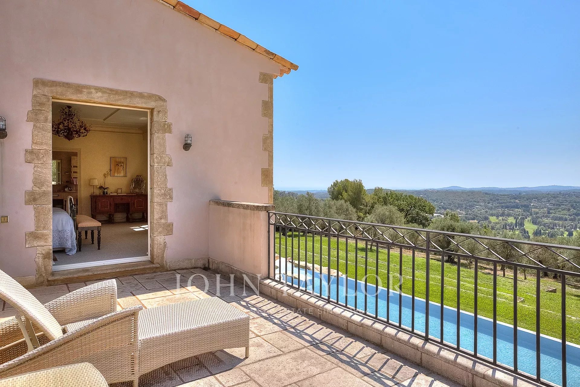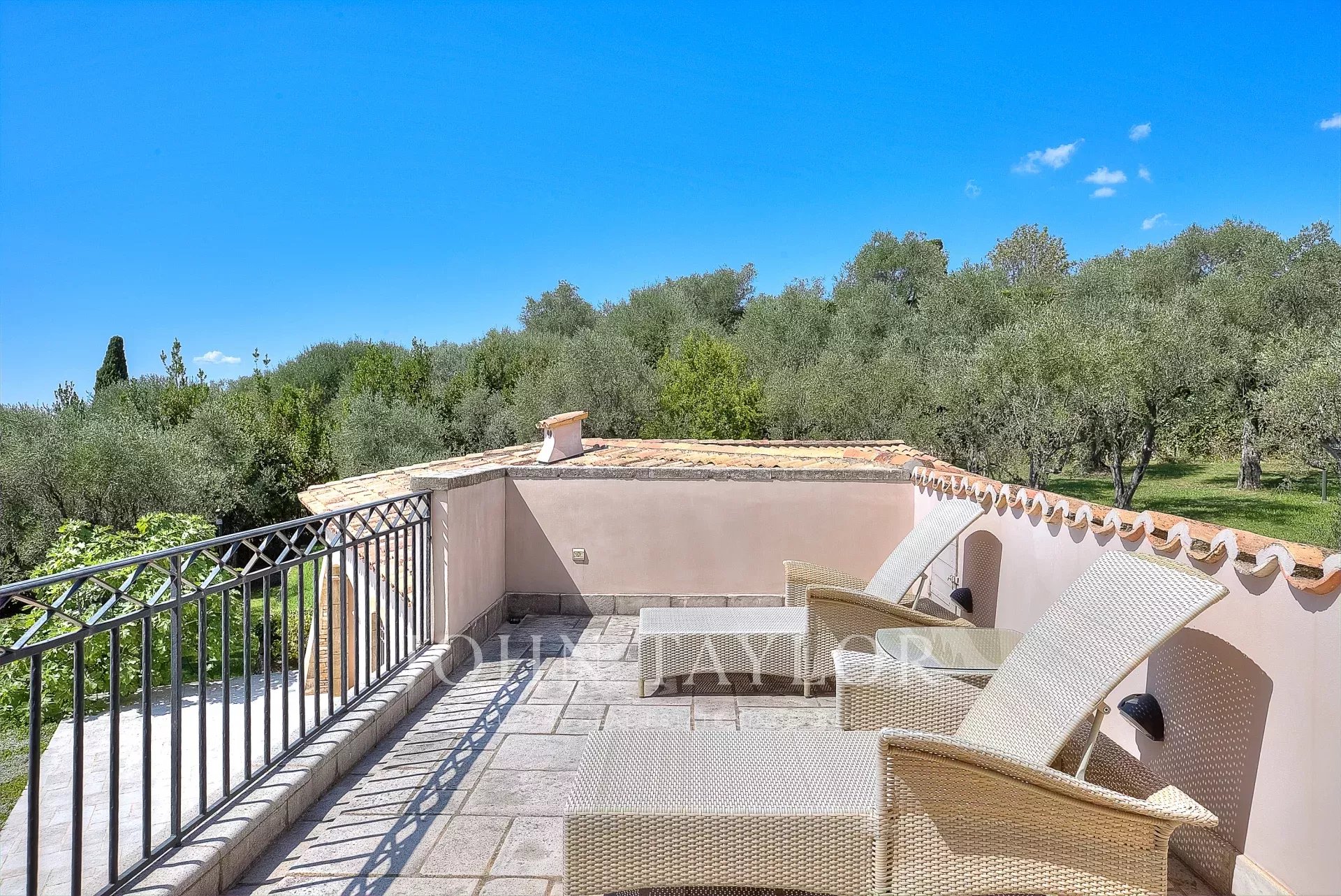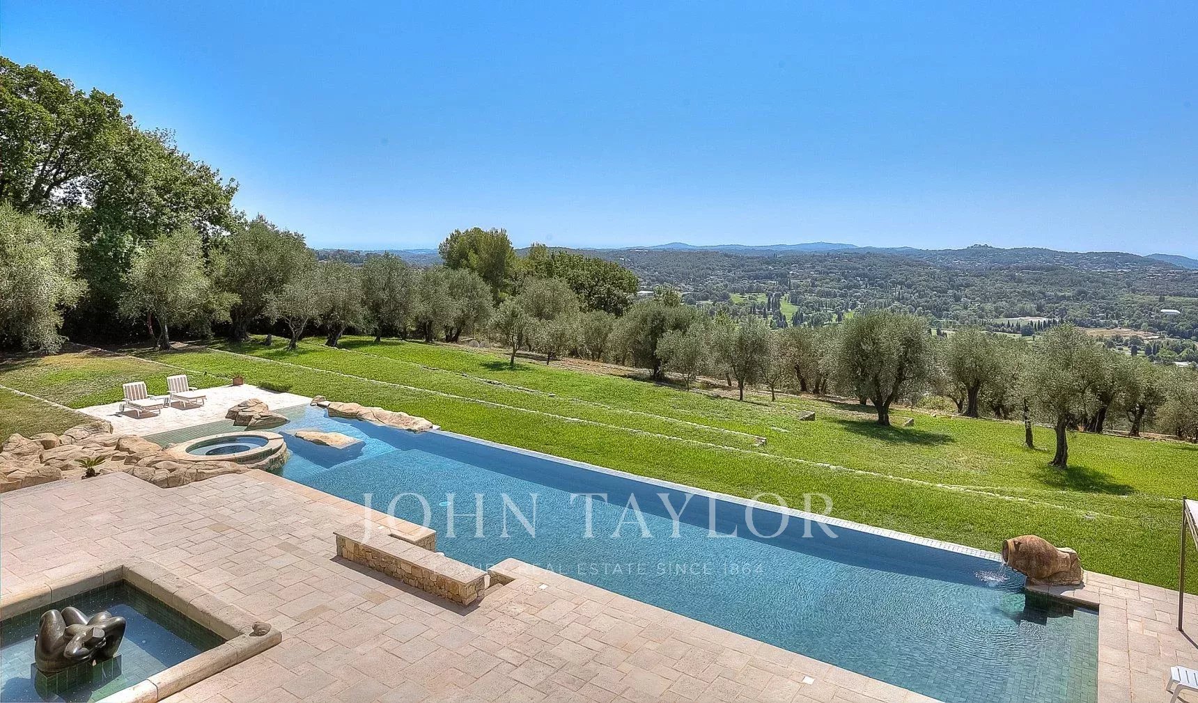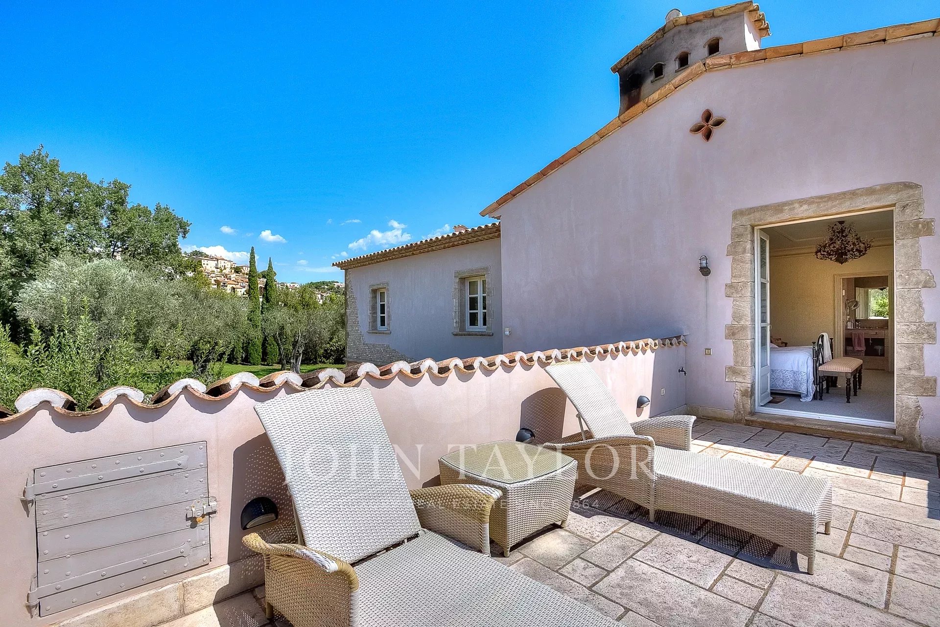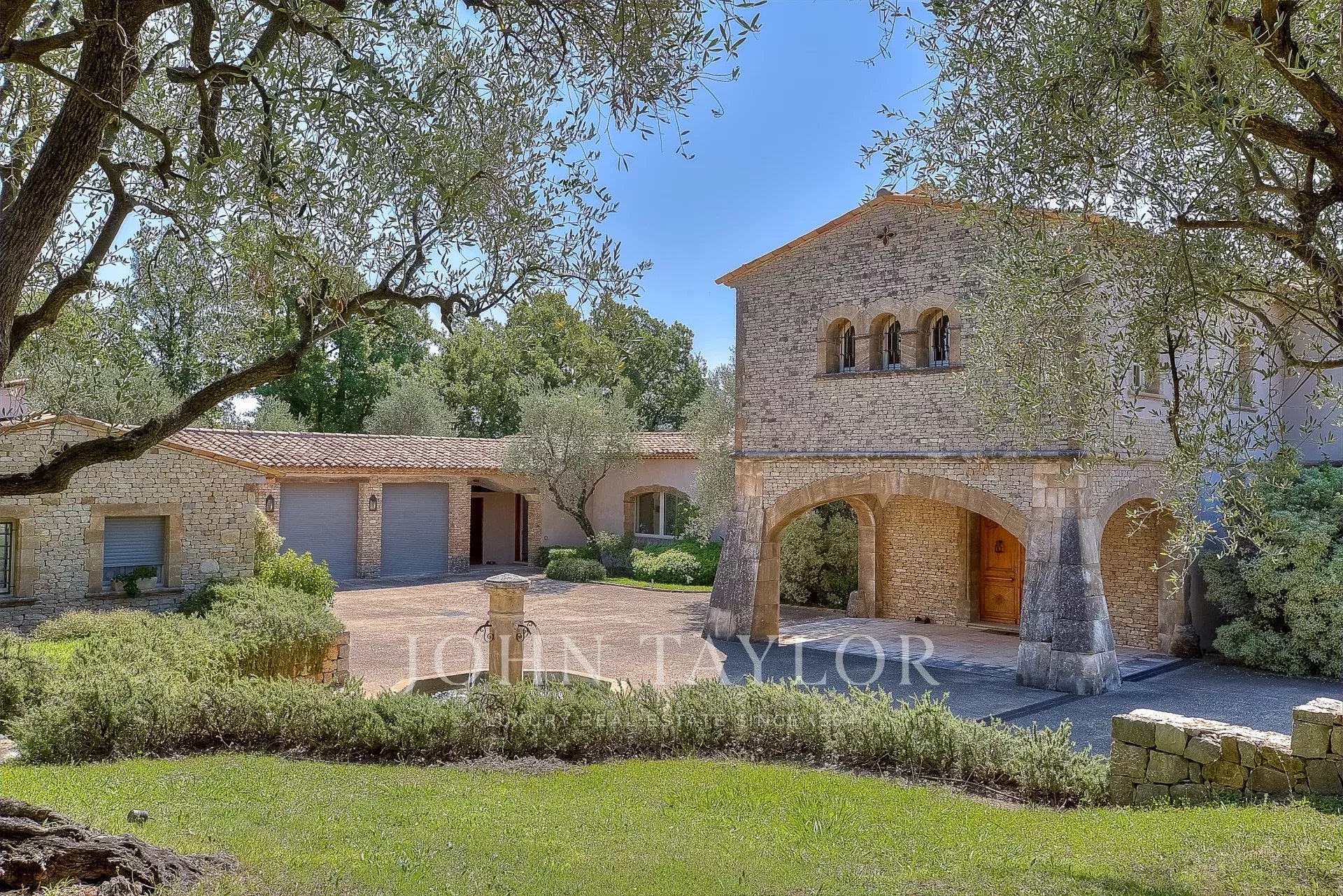 The 10,000 square meter landscaped property, designed by Jean Mus, consists of gentle restanques, stone walls, and is surrounded by over 160 olive trees.