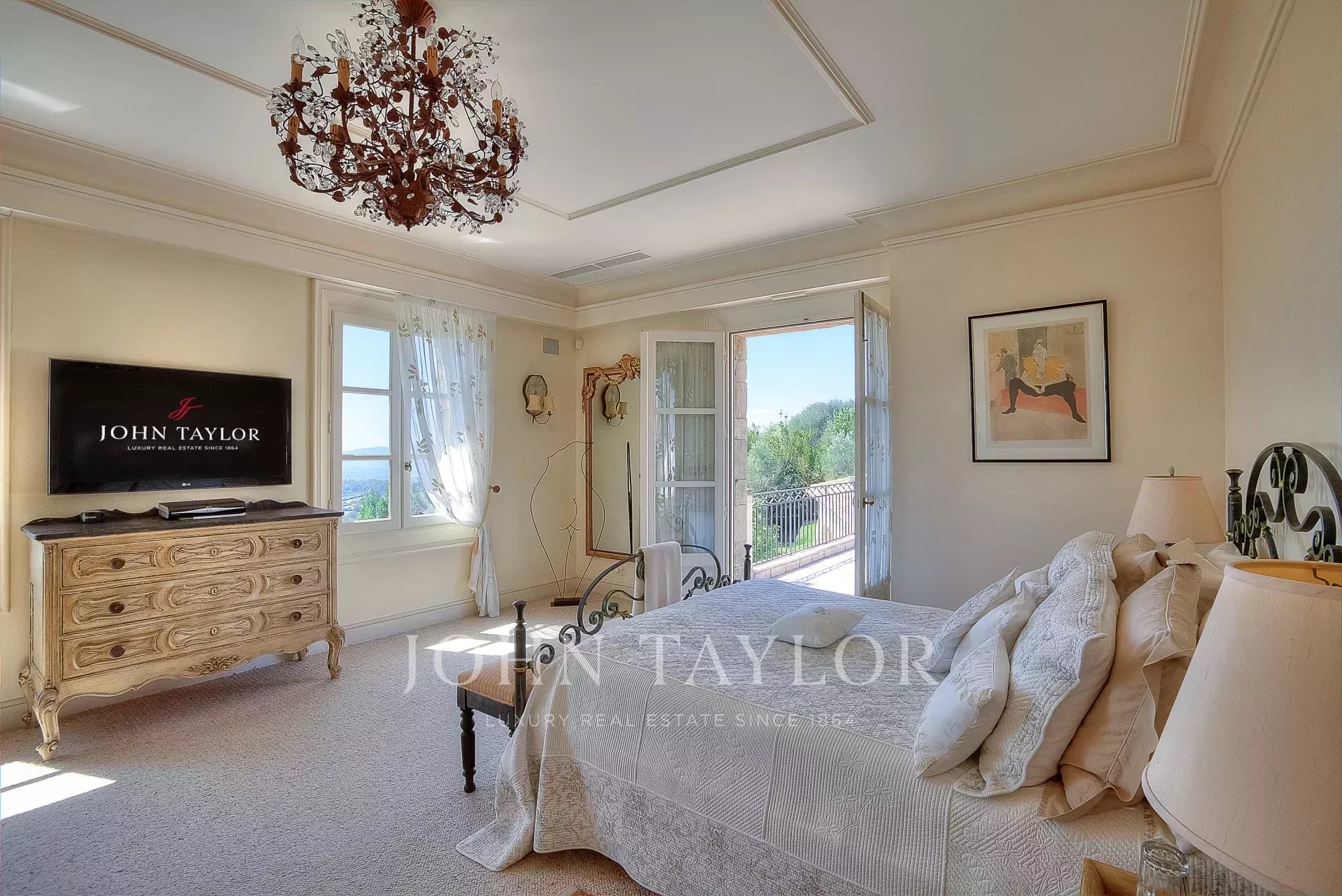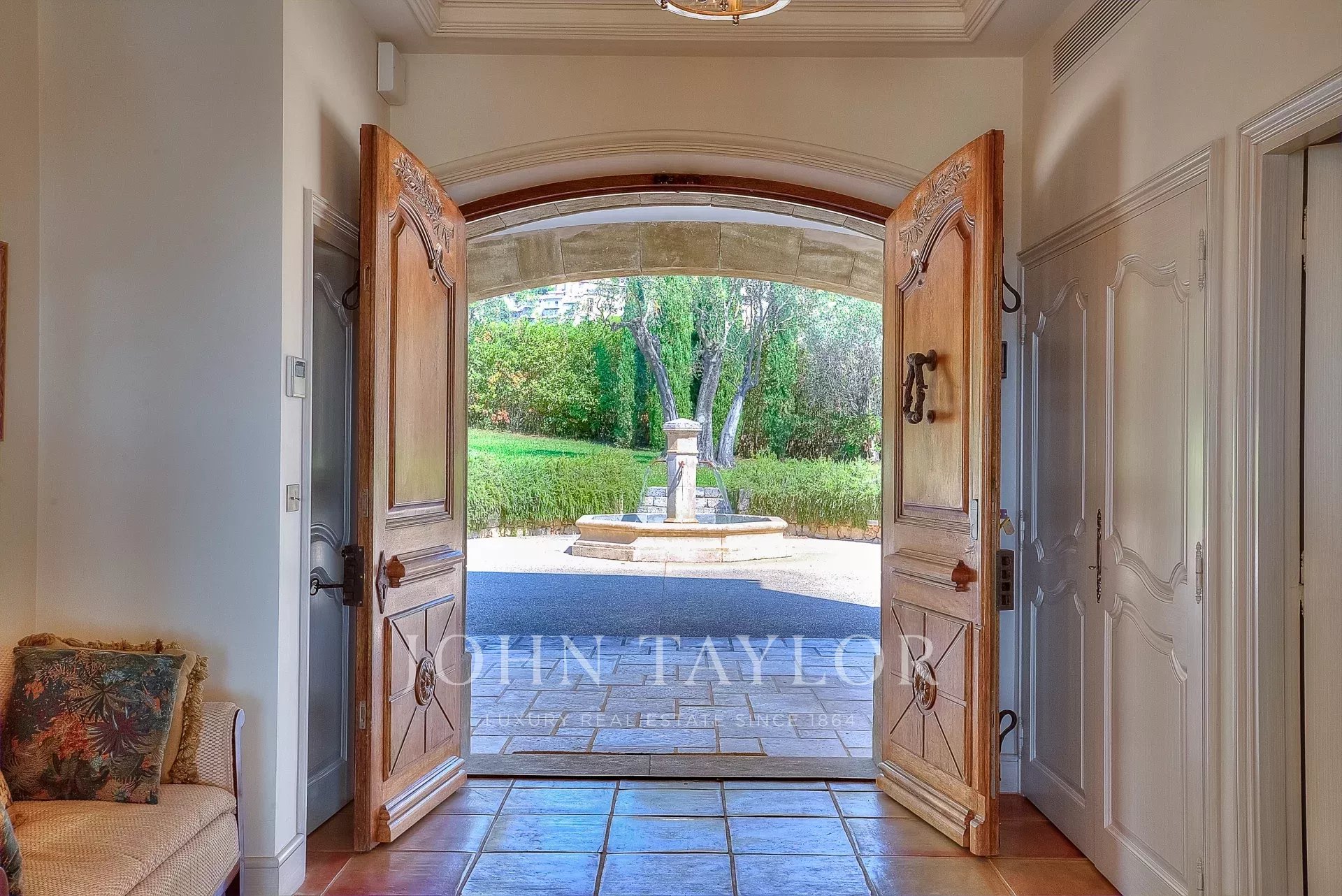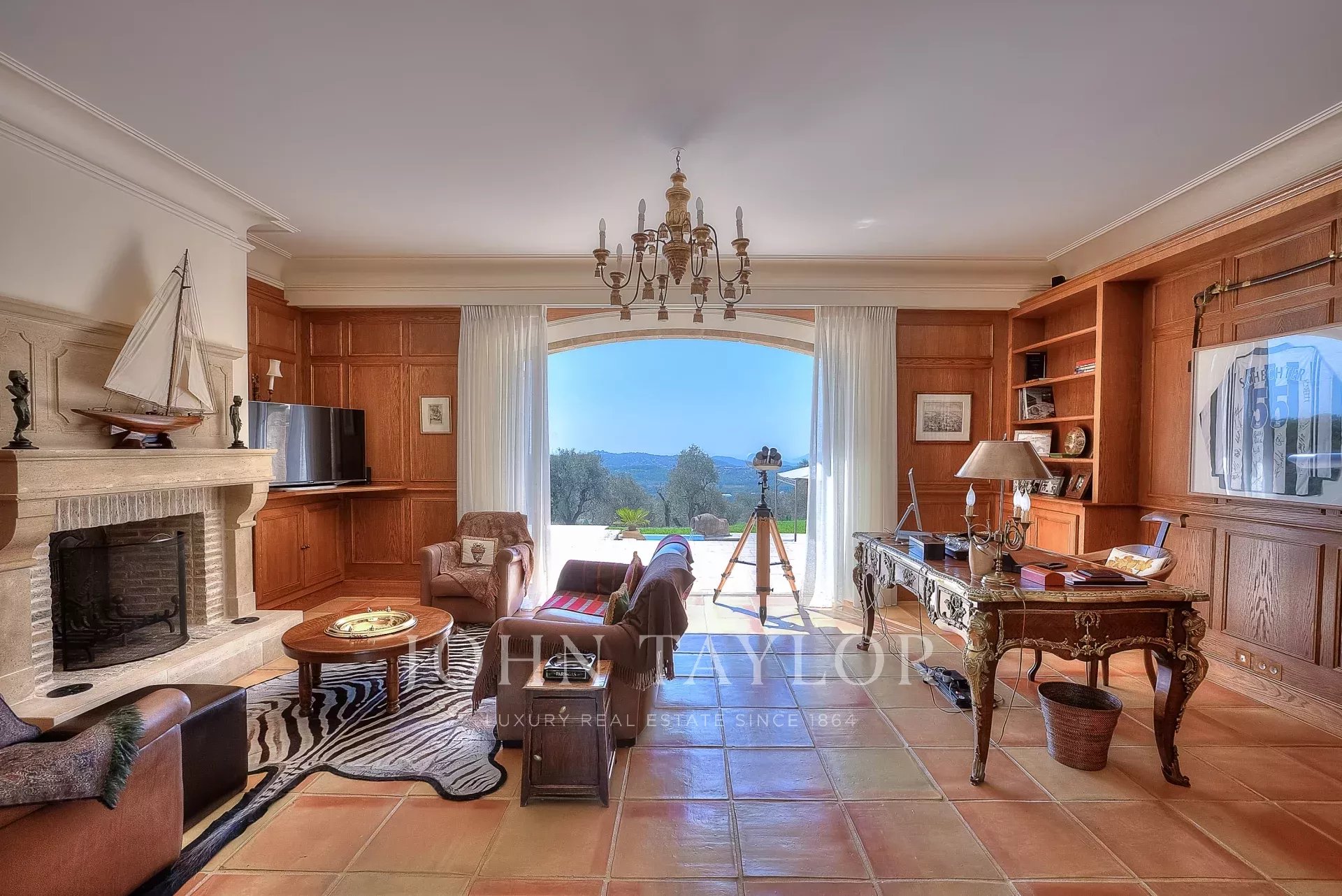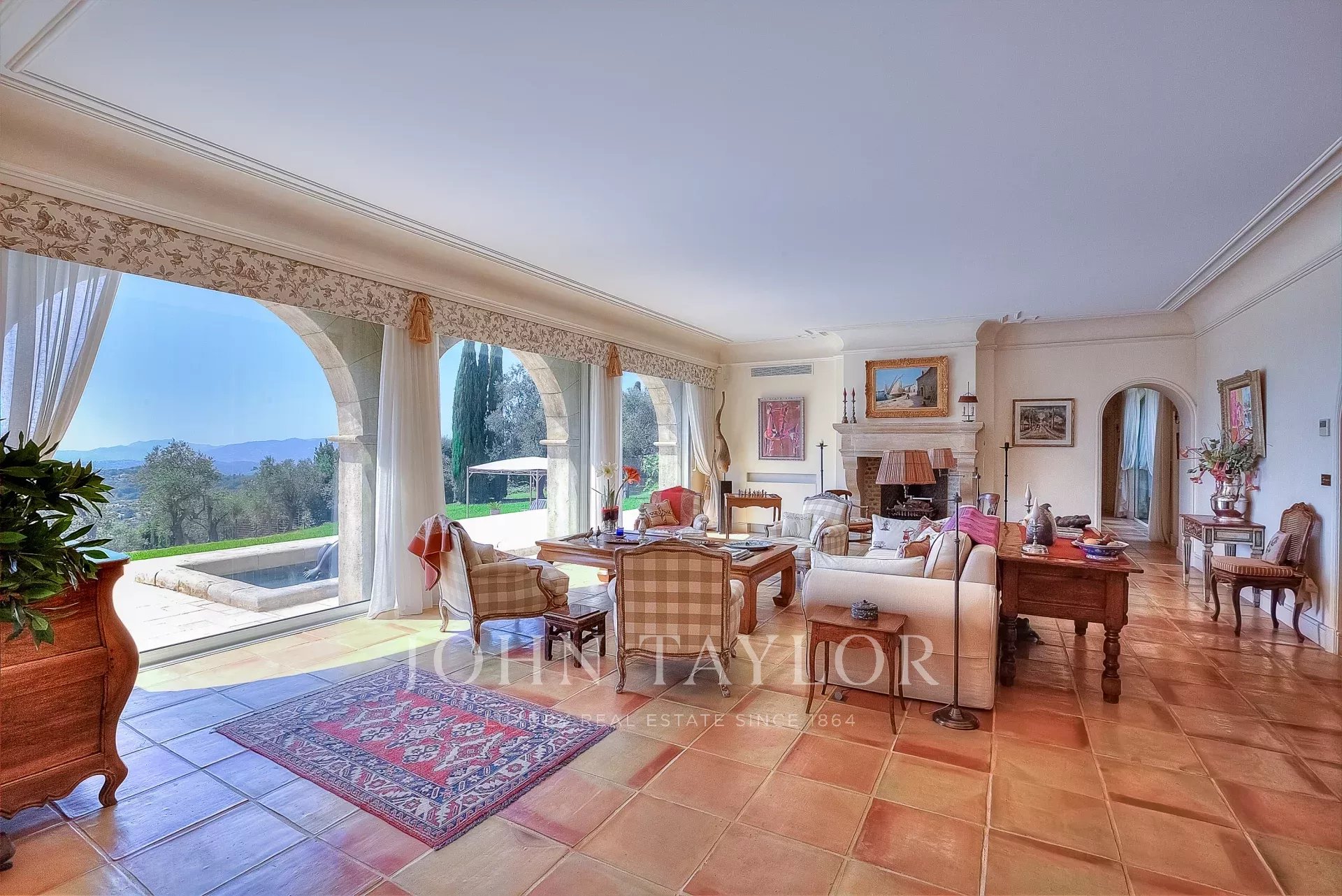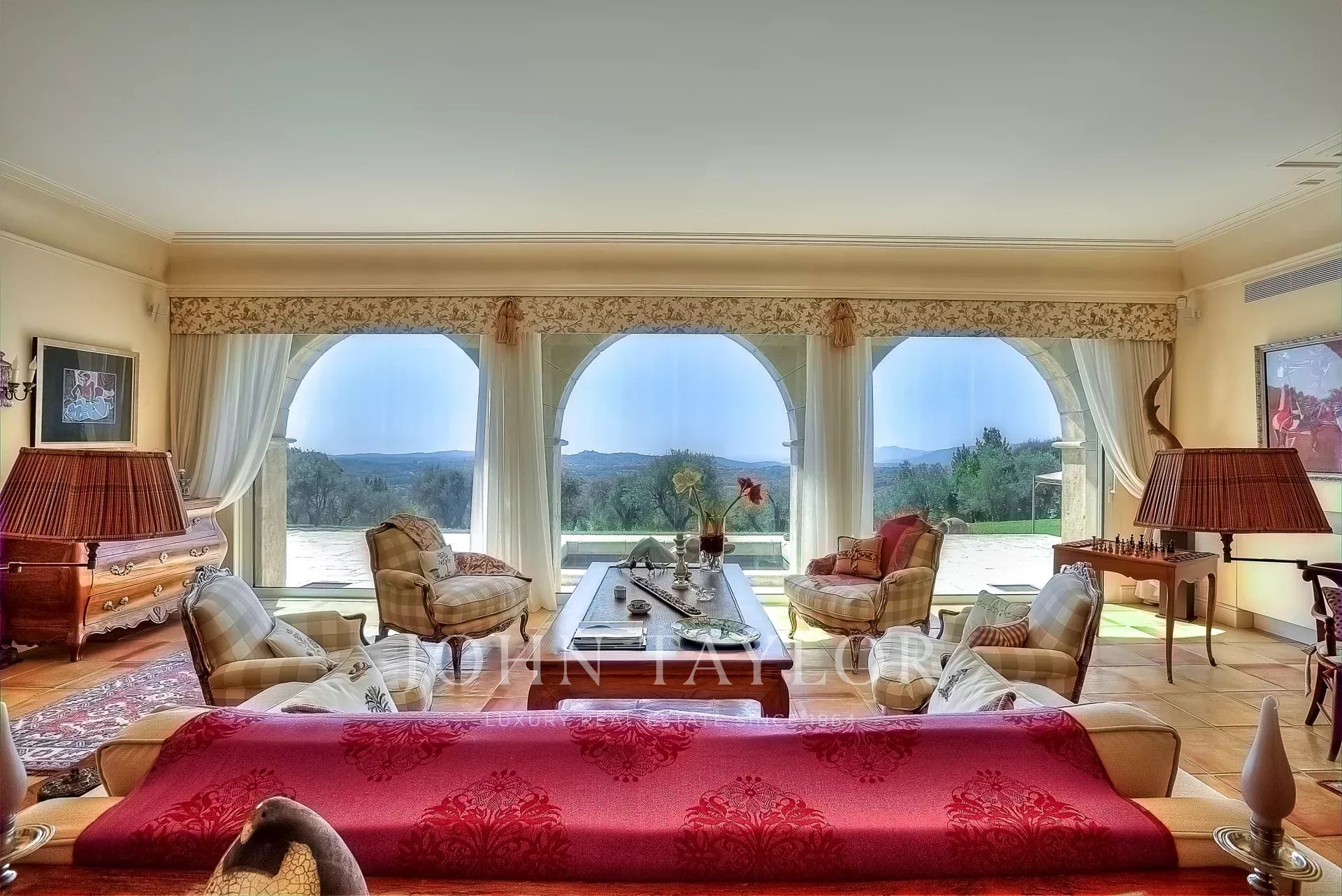 The 10,000 square meter landscaped property, designed by Jean Mus, consists of gentle restanques, stone walls, and is surrounded by over 160 olive trees.