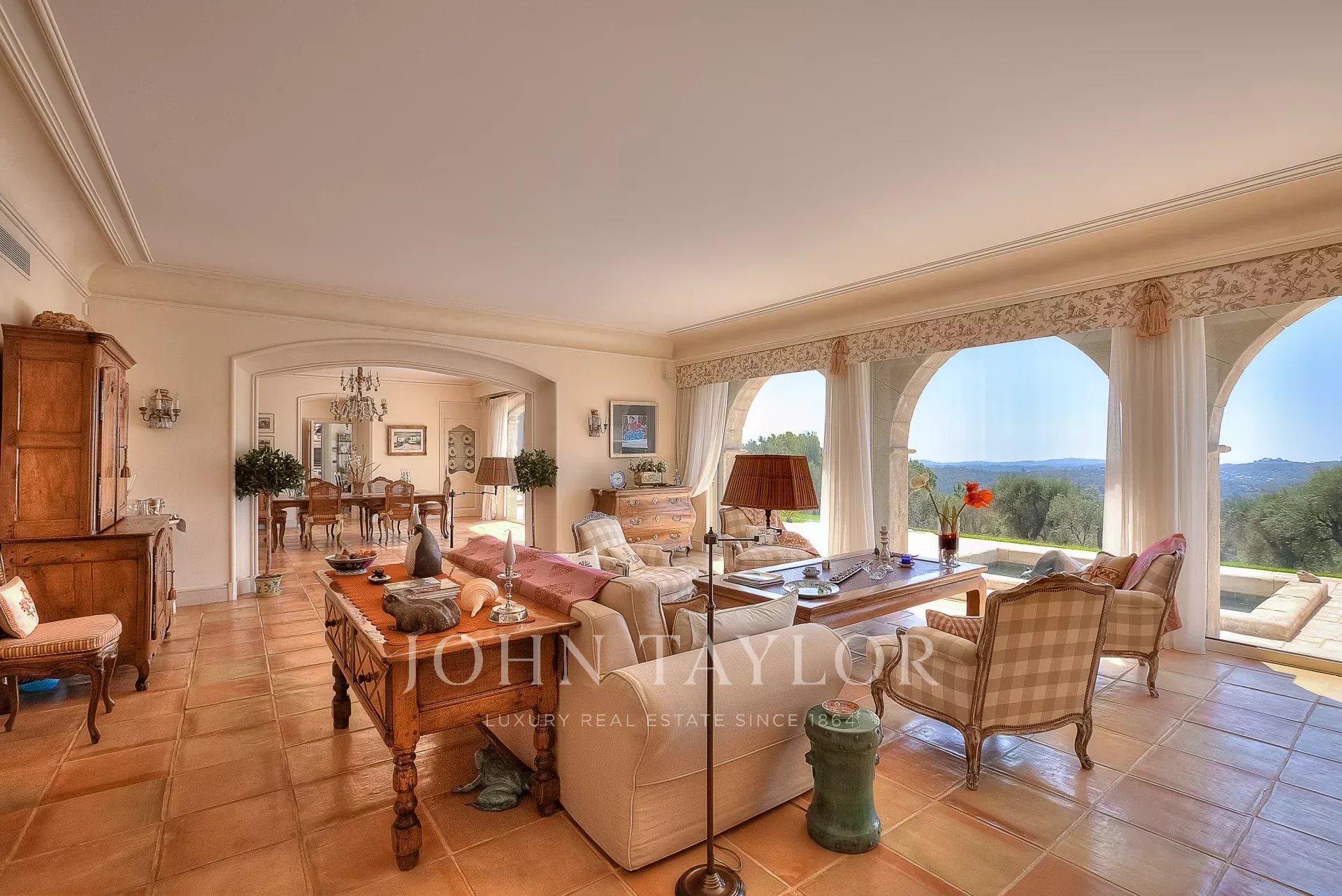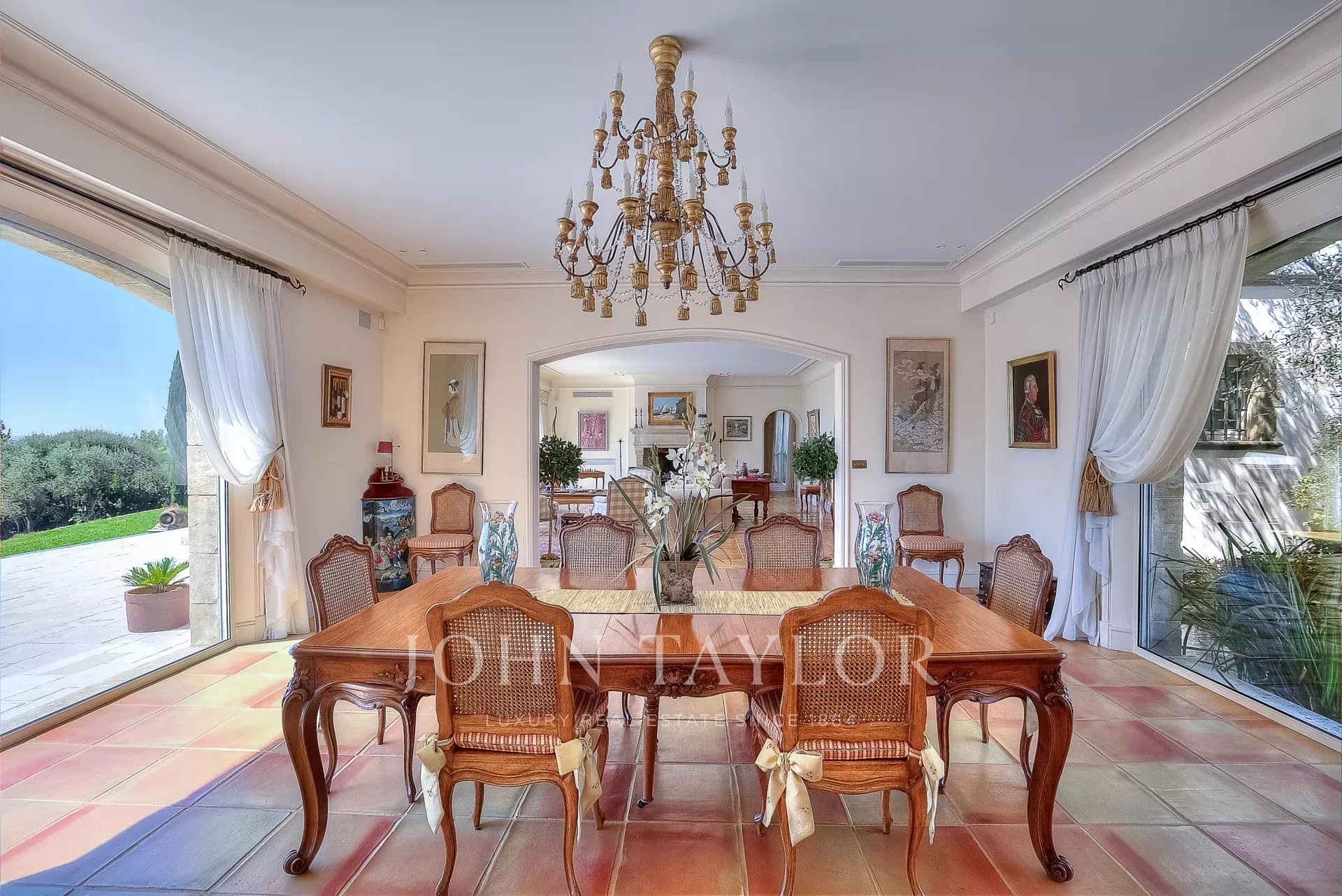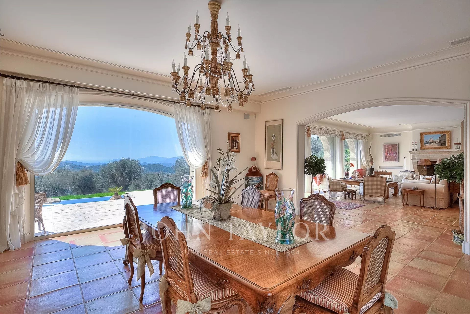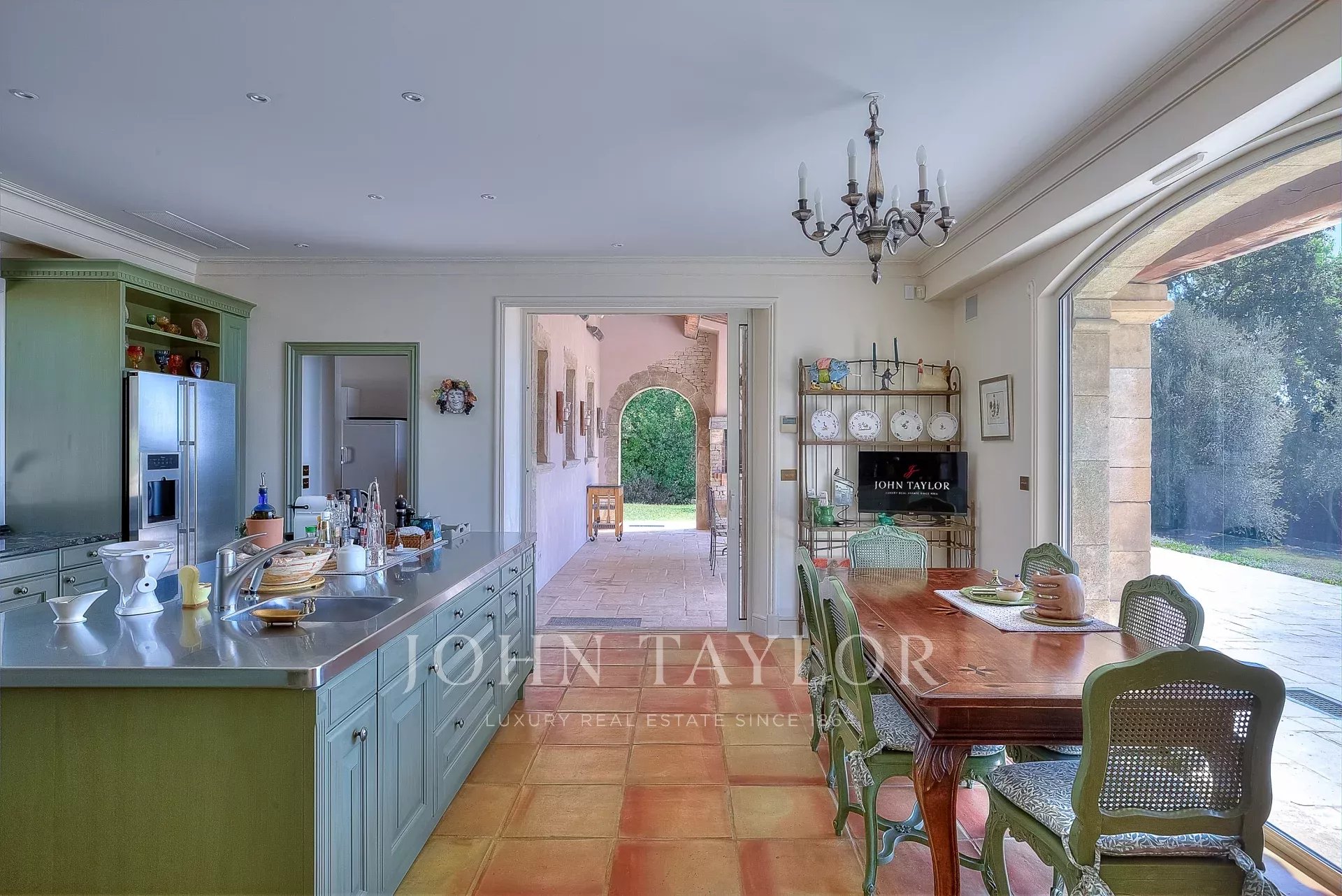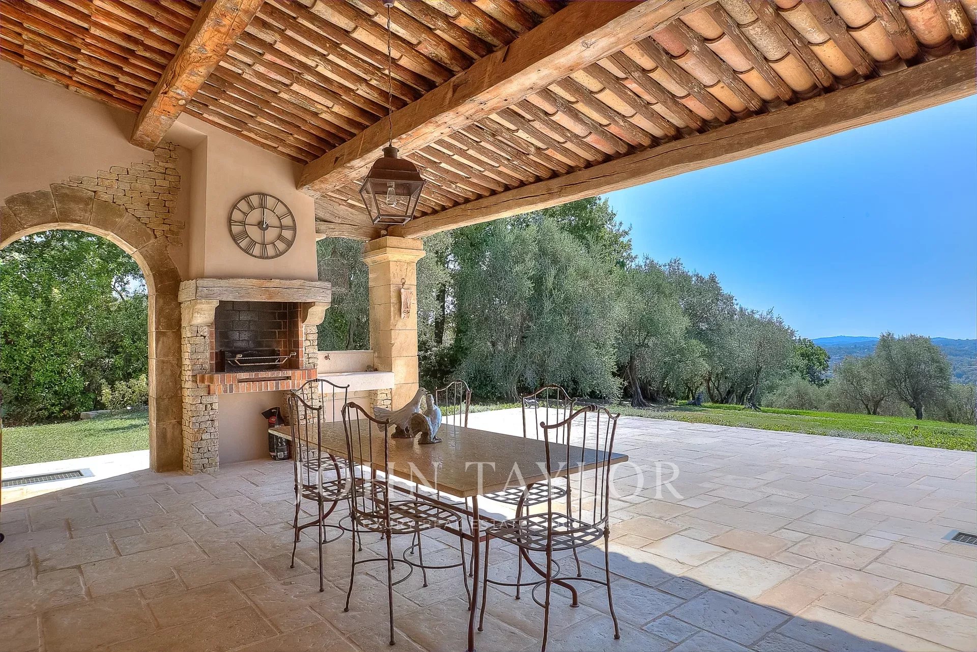 The beautiful covered terrace includes a summer kitchen with a large dining area and highlights the delightful Mediterranean lifestyle.