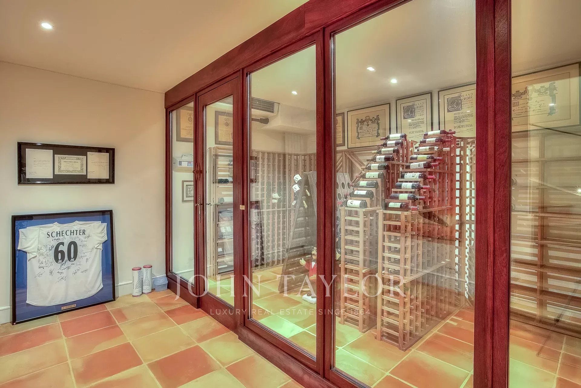 In the basement, there is a very fine air-conditioned wine cellar and a cigar cellar, as well as a game room.
