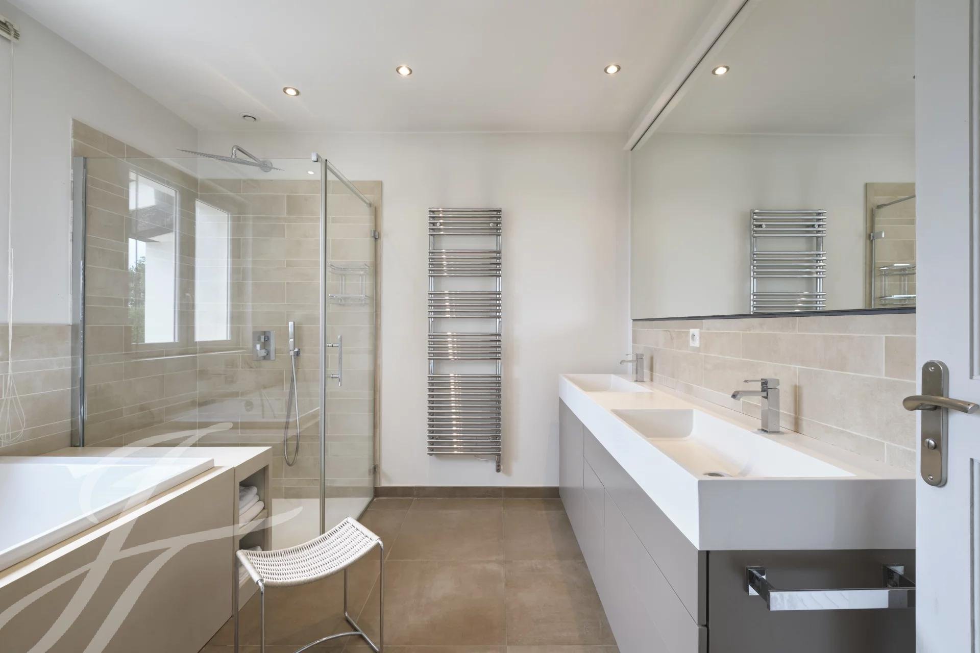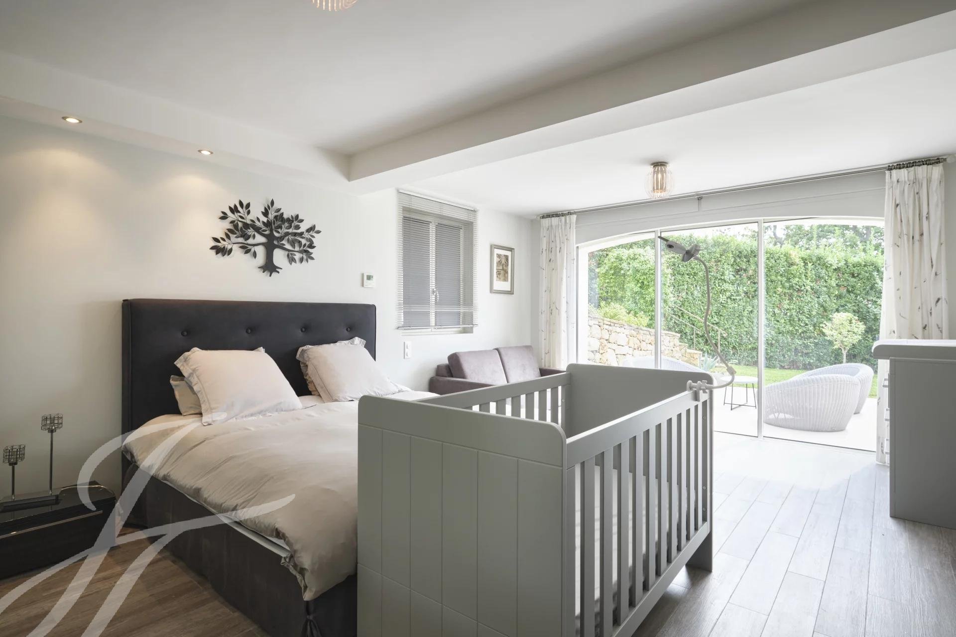 A few steps lead up to the master suite with en-suite bathroom, dressing room and a beautiful private terrace with breathtaking views of the bay of Mandelieu and the charming village of Châteauneuf-Grasse.