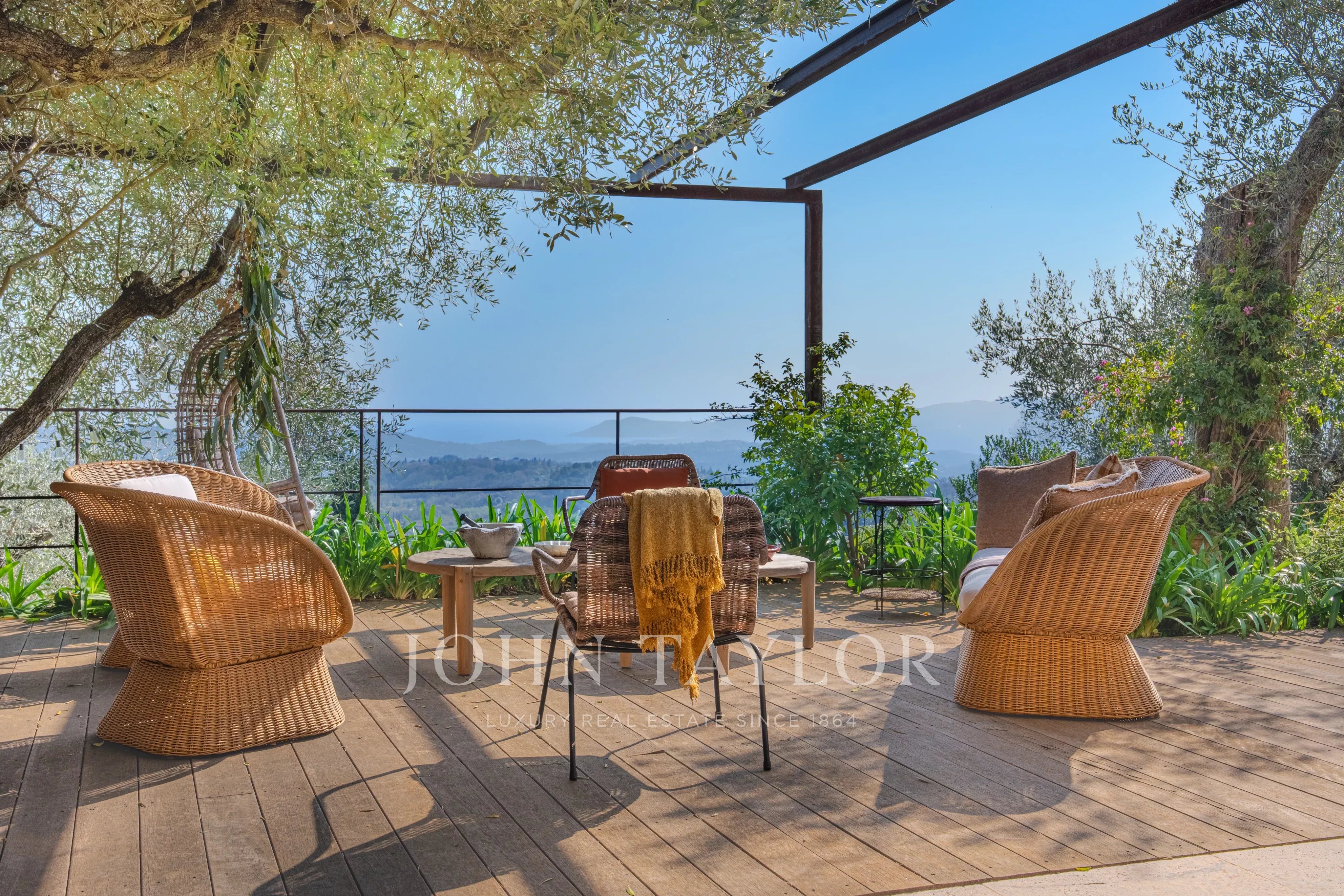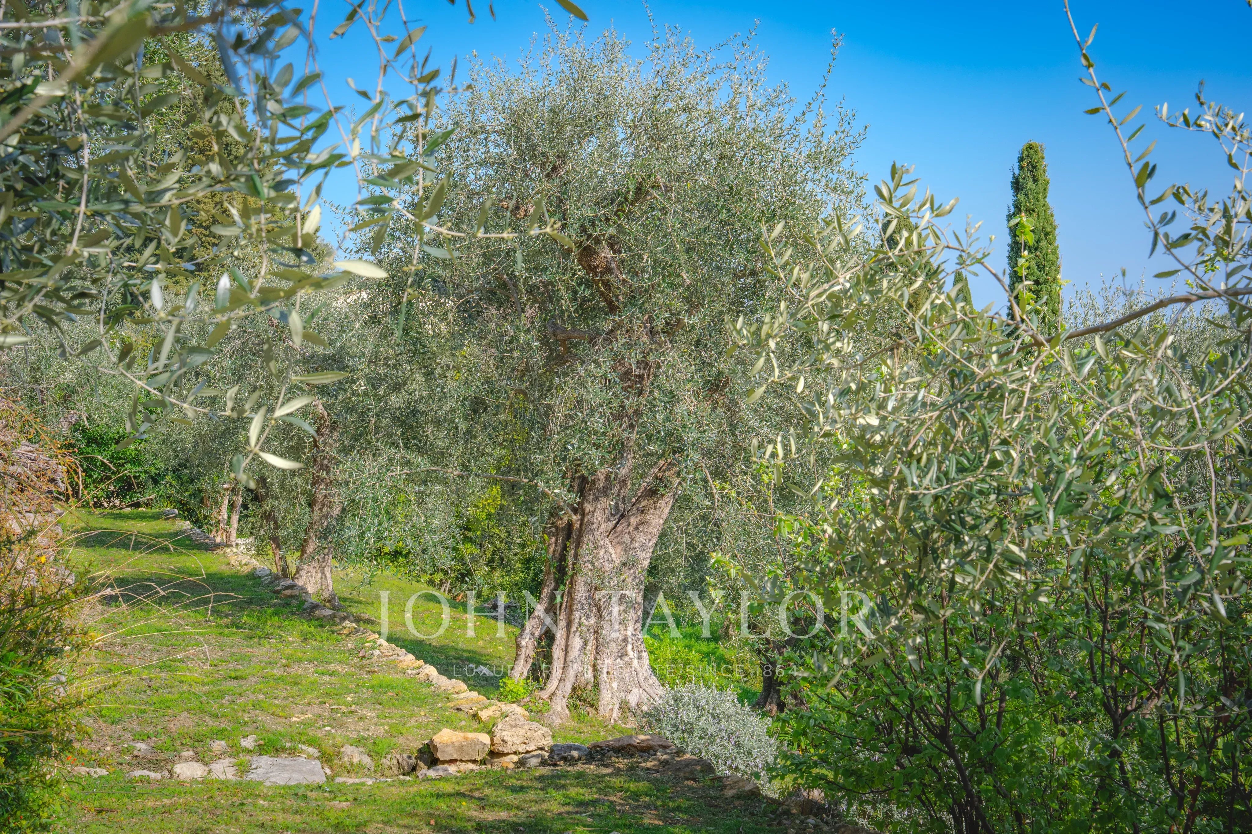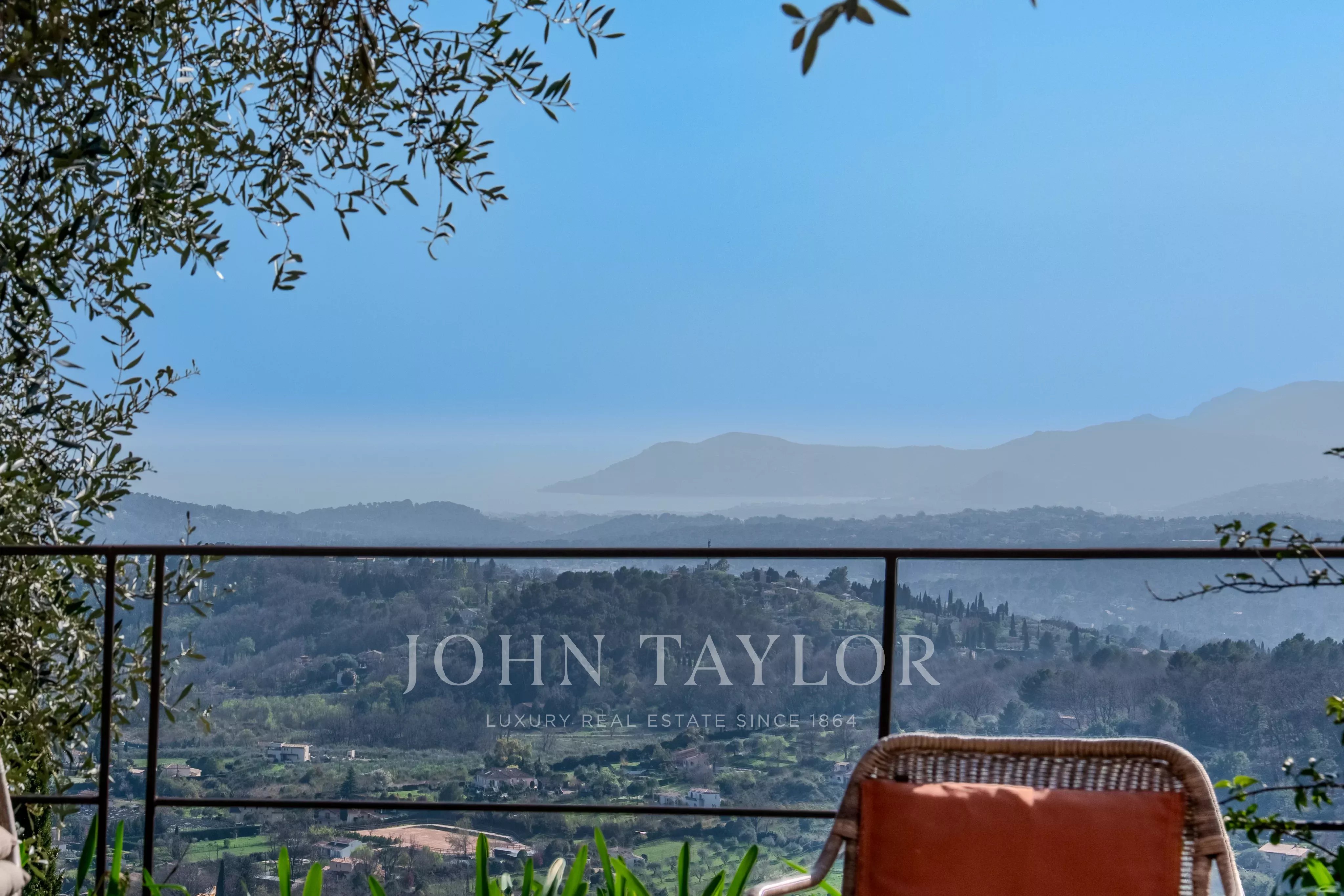 Set on a magnificent 4,000 m² landscaped plot, beautifully planted with centuries-old olive trees, the villa offers a rare and breathtaking panorama over the hilltop villages of the hinterland and their rolling green hills, extending all the way to the stunning Bay of Mandelieu.