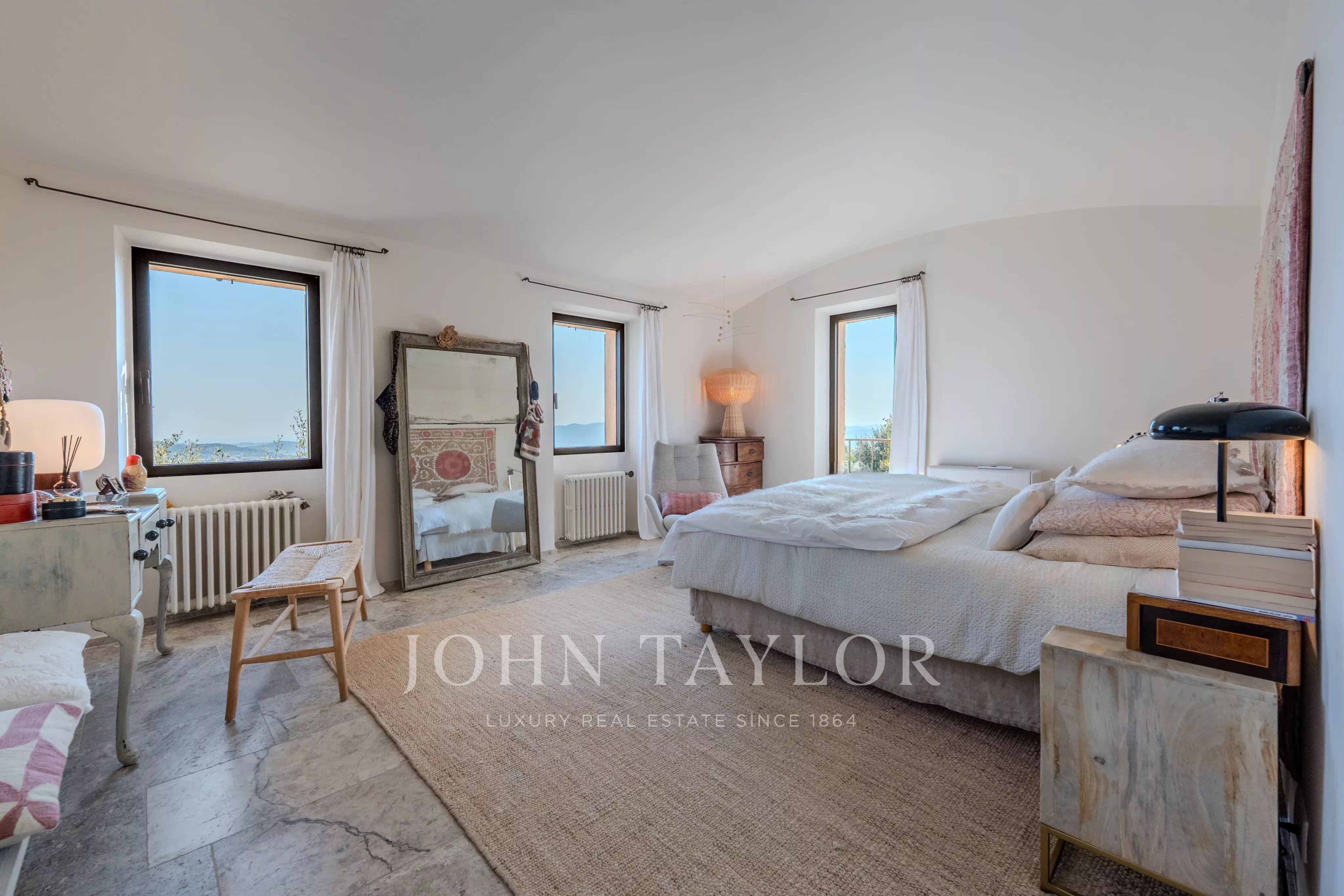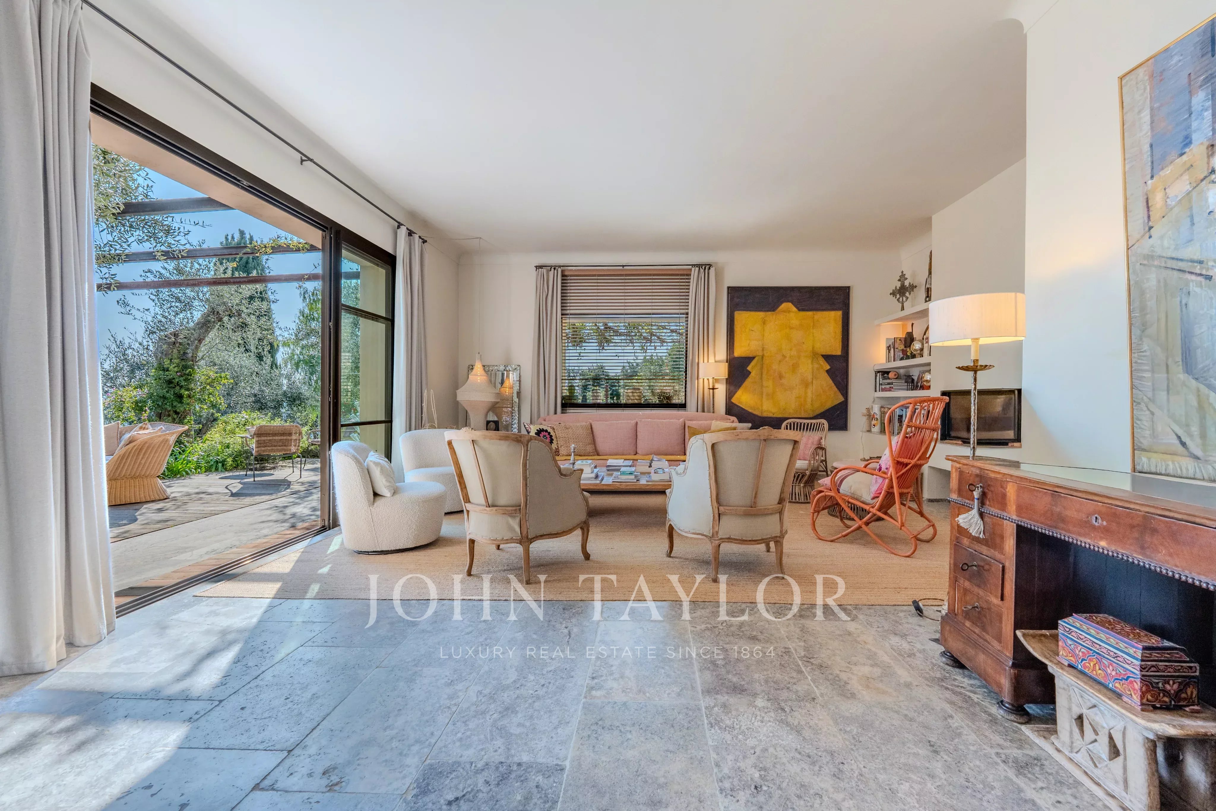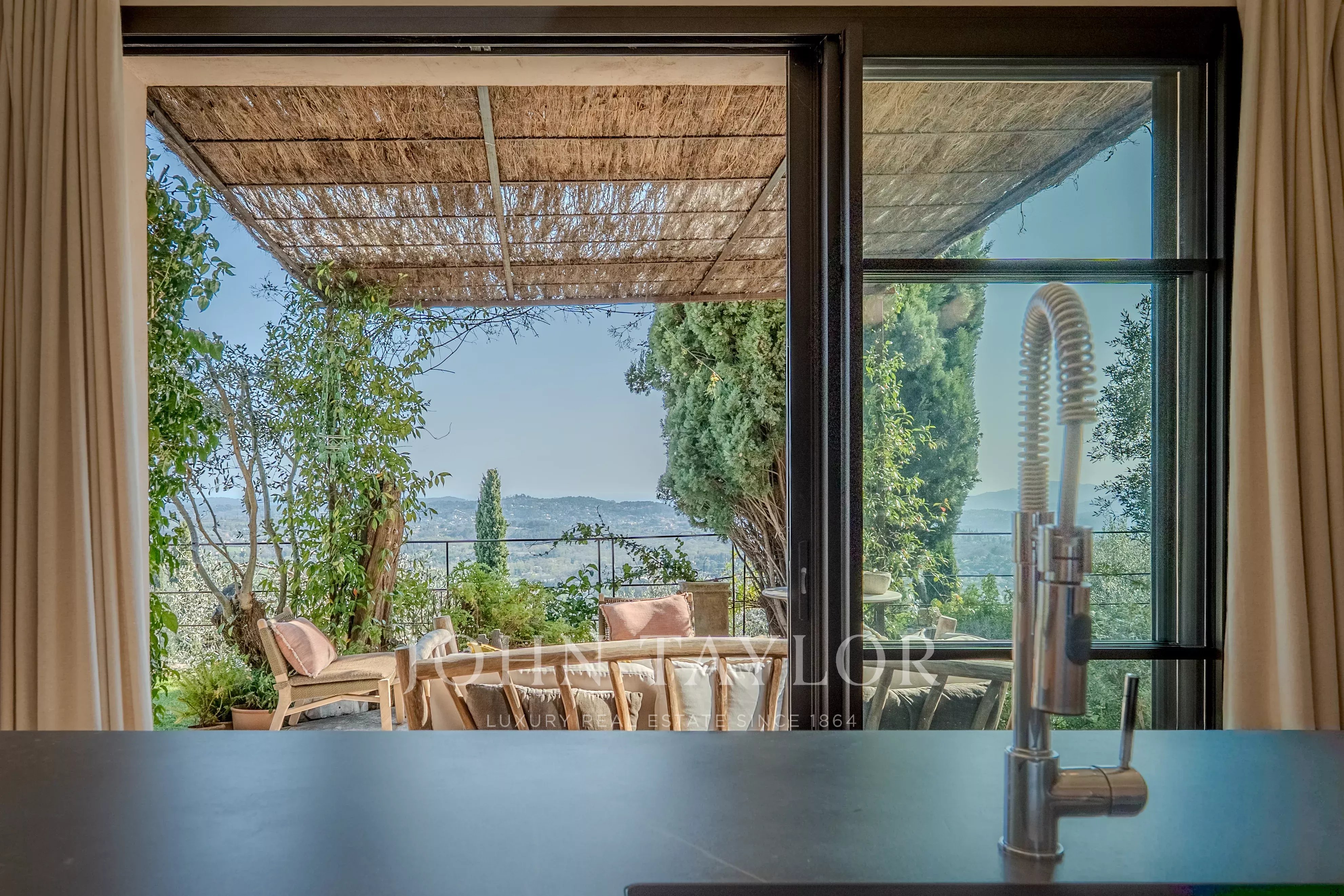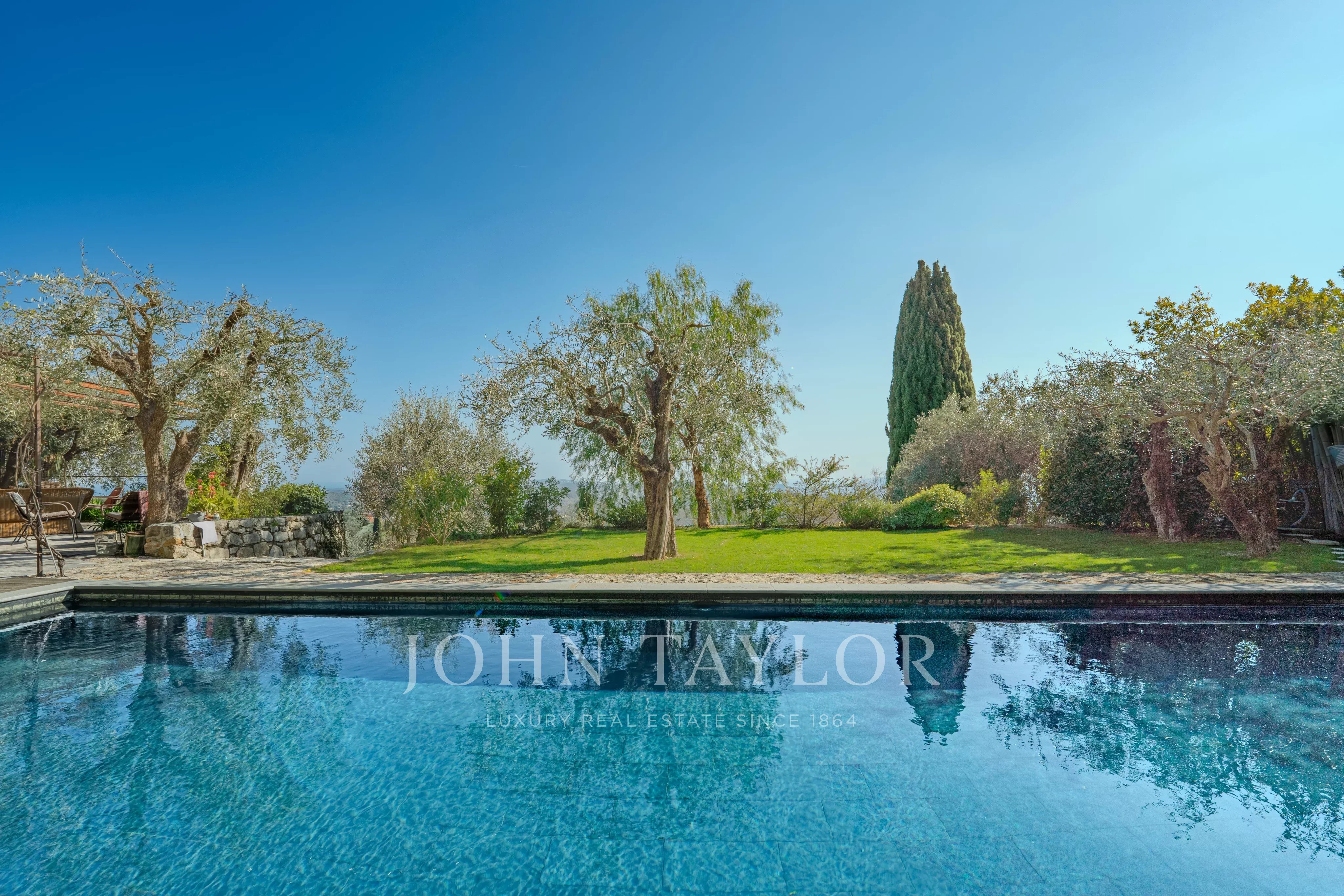 Set on a magnificent 4,000 m² landscaped plot, beautifully planted with centuries-old olive trees, the villa offers a rare and breathtaking panorama over the hilltop villages of the hinterland and their rolling green hills, extending all the way to the stunning Bay of Mandelieu.